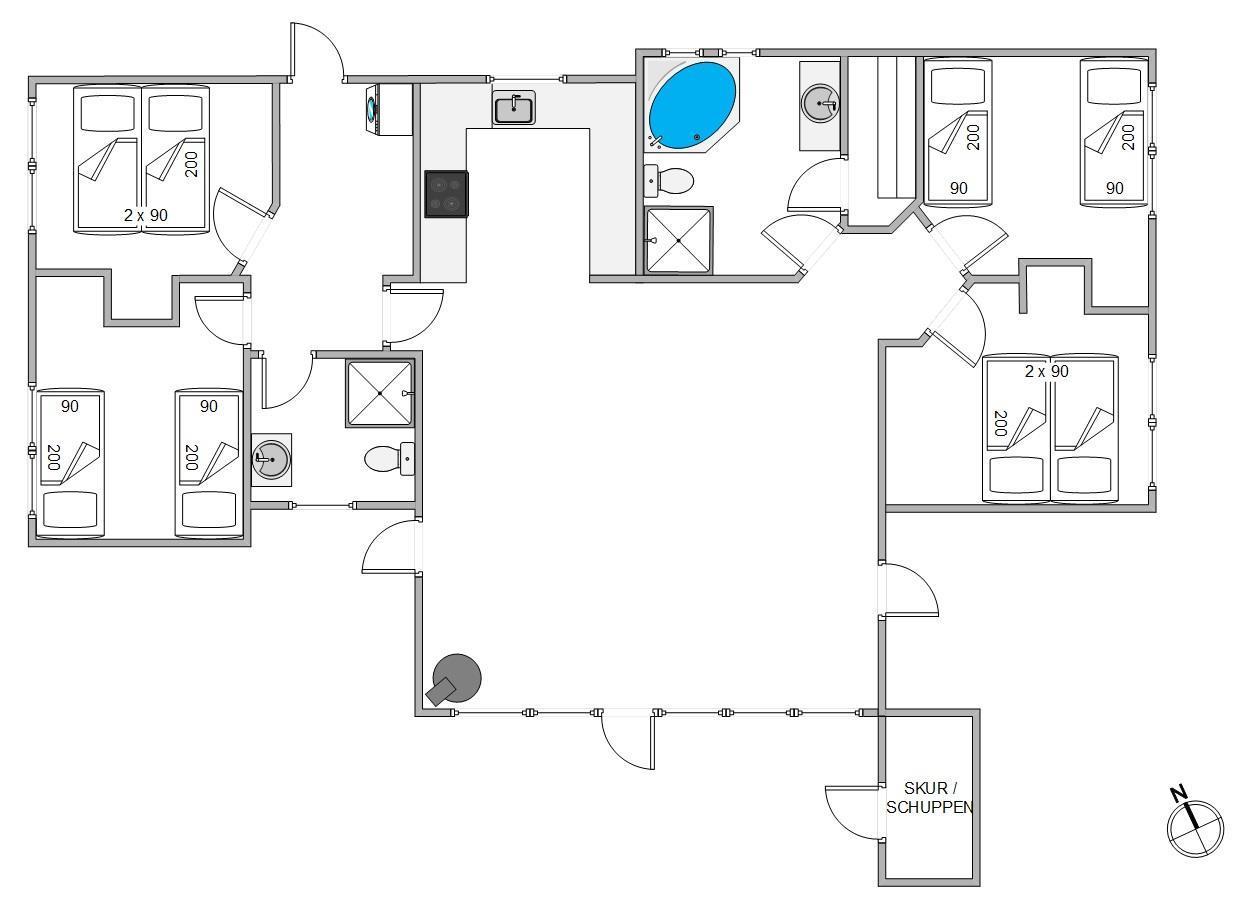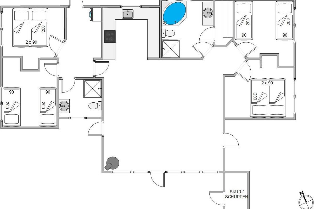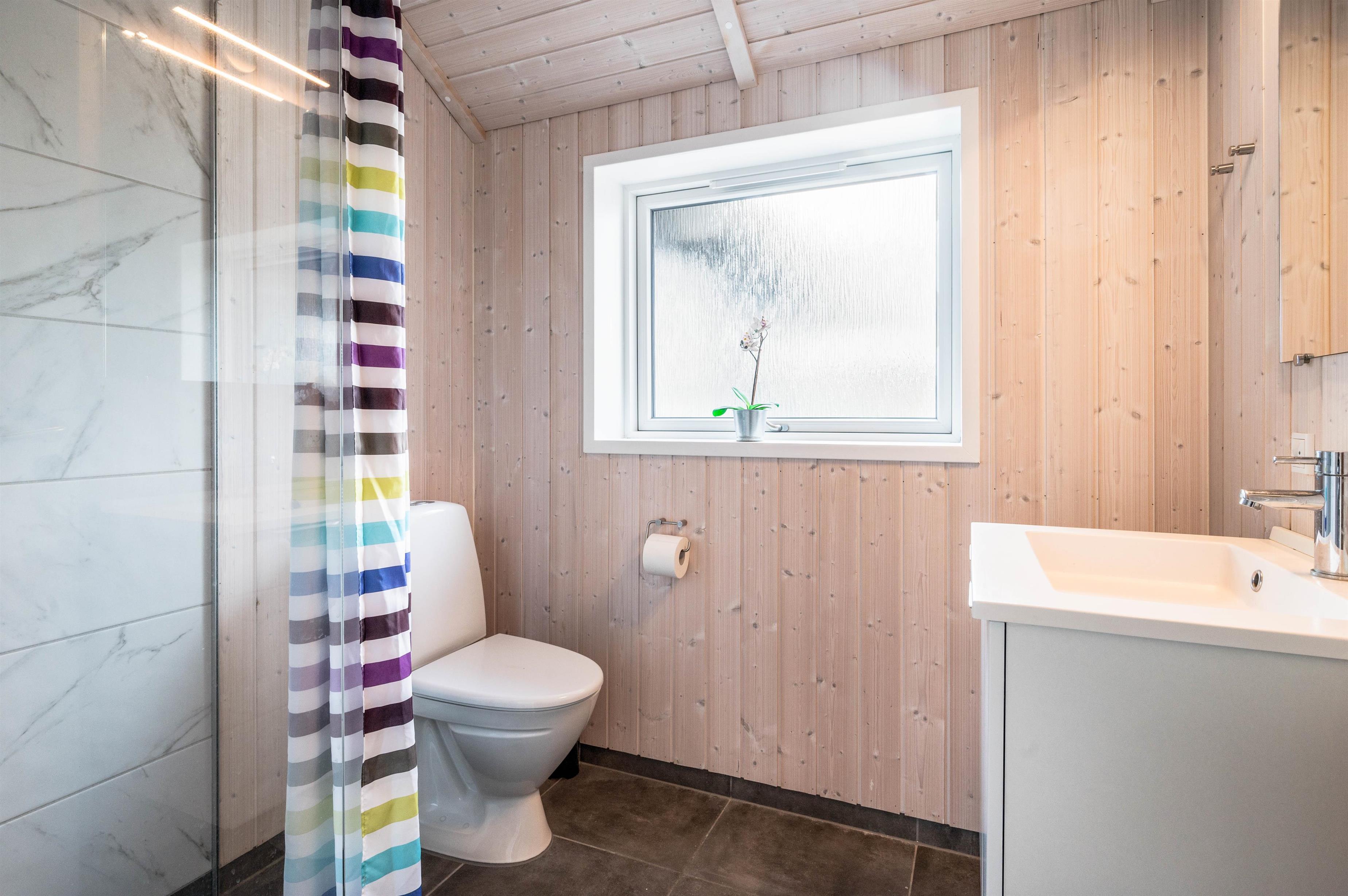 This typical Danish holiday home is perfect for two families or friends travelling together. The practical arrangement of bedrooms and bathrooms gives everyone their own space. On one side, you'll find a double bedroom, a twin bedroom, and a practical bathroom with shower and underfloor heating.