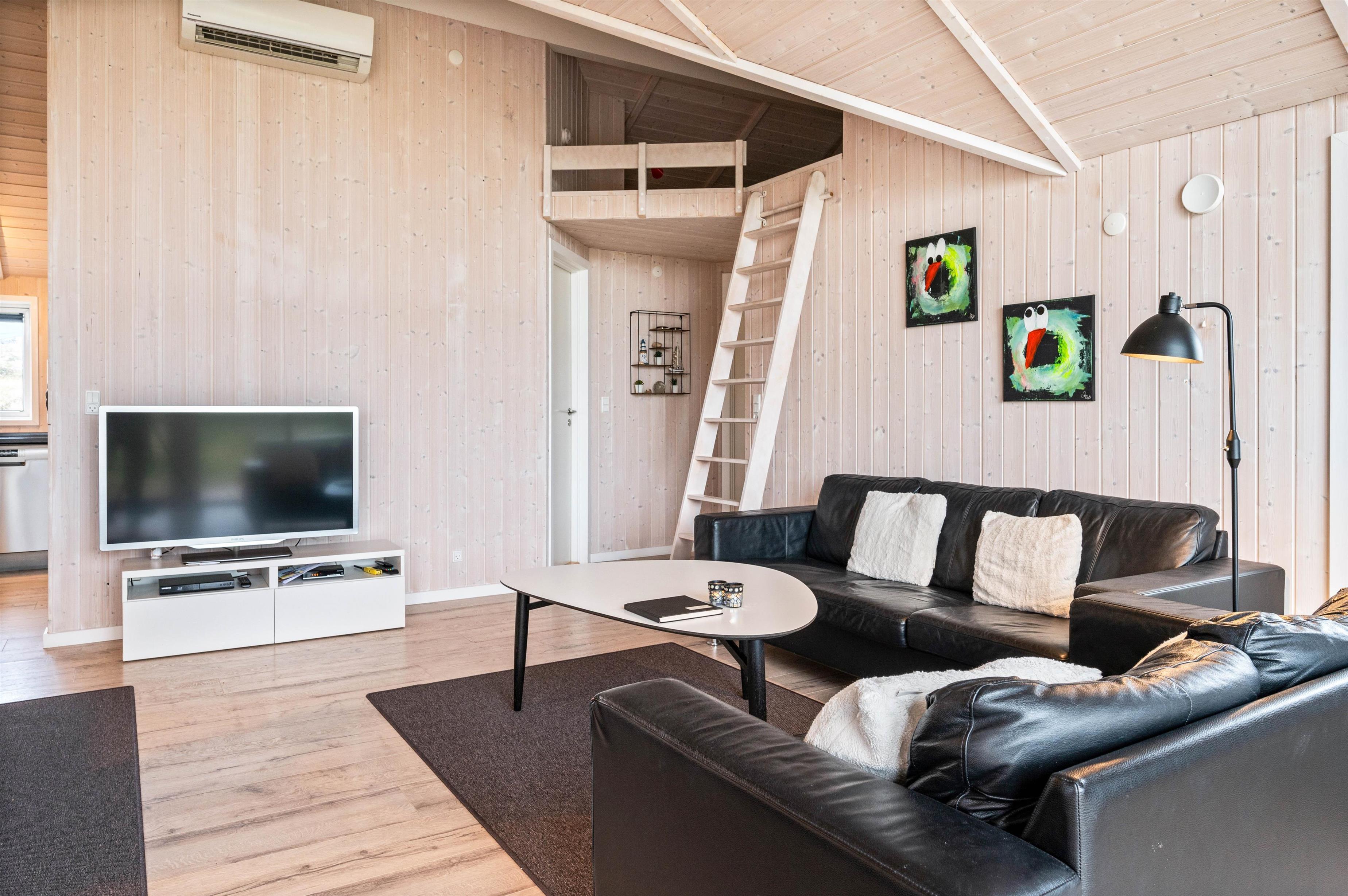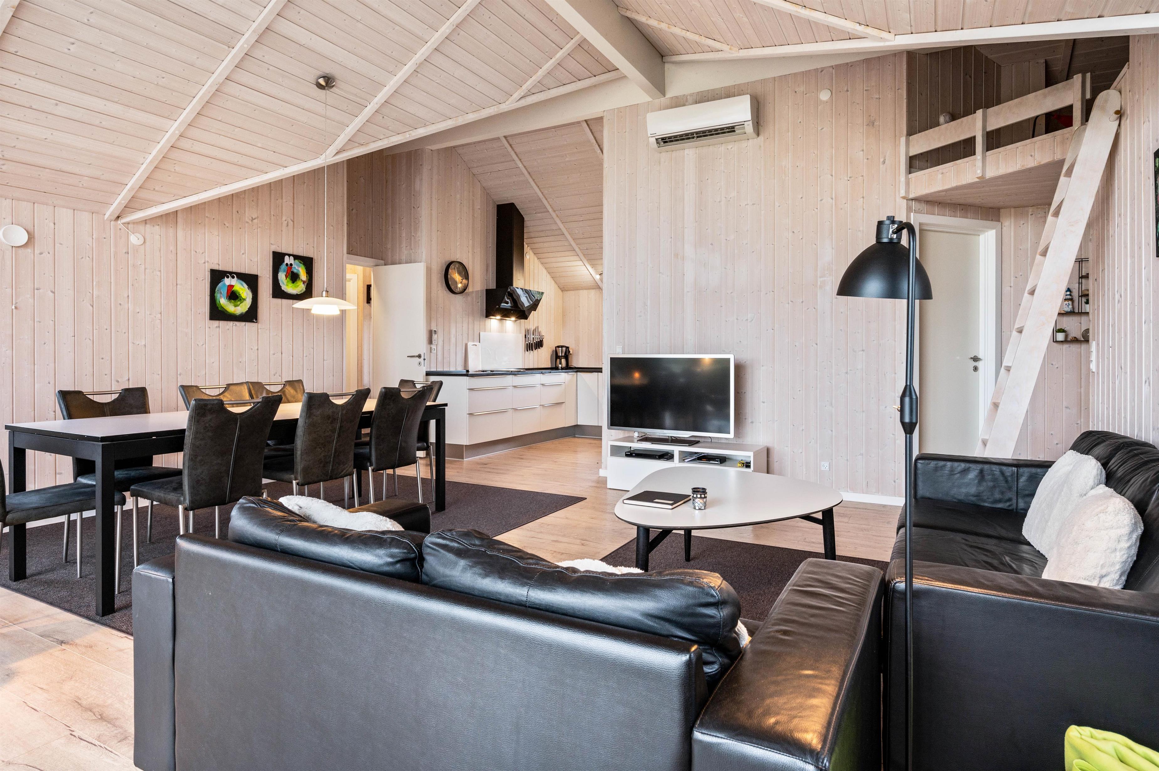 The spacious living area impresses with its panoramic window and clean, classic furnishings. Relax on the comfortable sofa to watch television or DVDs while the wood-burning stove crackles away. It's a welcoming space, even in poor weather. Additionally, this well-maintained holiday home features an energy-efficient heat pump for heating.