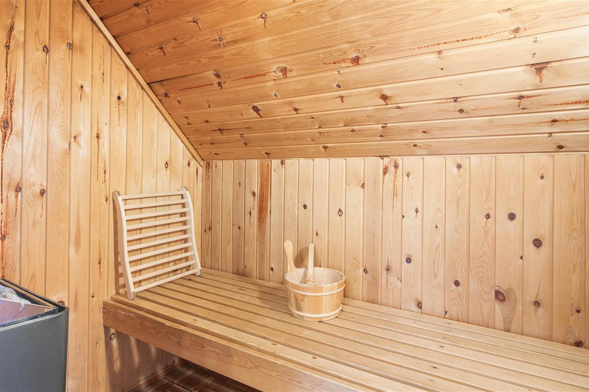 The open-plan kitchen adjoining the living area is practical and well-equipped with quality appliances, including a dishwasher to make your stay easier. The naturally lit bathroom features a shower and washing machine for added convenience. The inviting sauna is perfect for warming up and unwinding after a long beach walk.