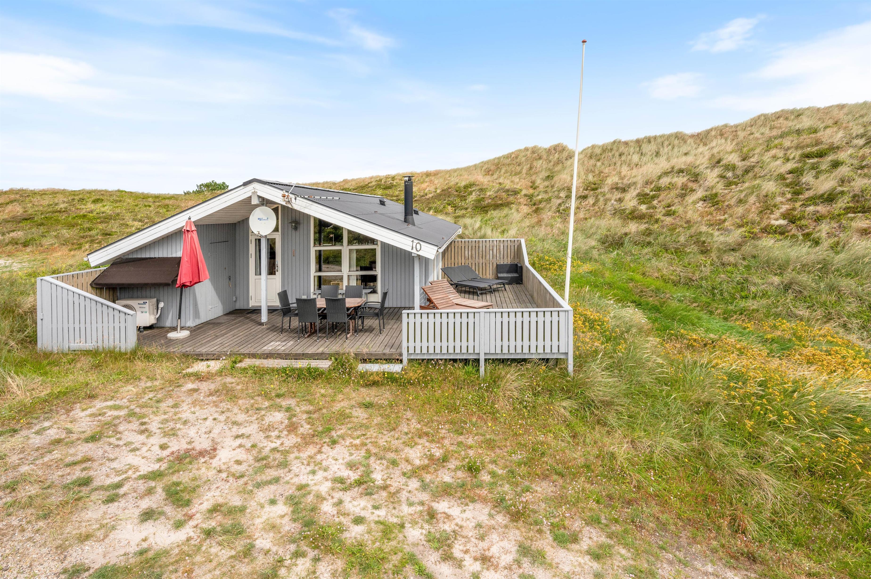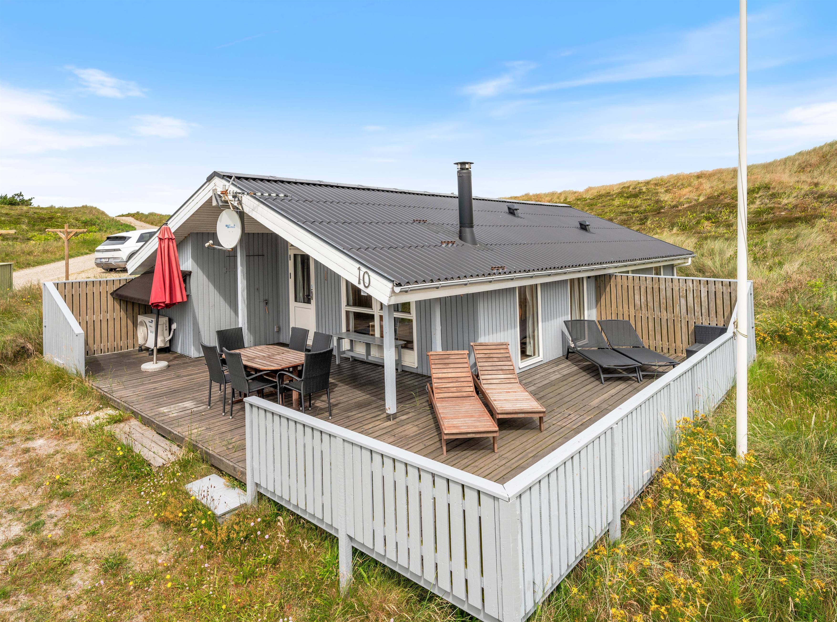 The holiday home sits on a hilly, natural plot of 2,847 square metres, immersing you in the picturesque dune landscape. On the partially covered terrace, you can relax with a good book or enjoy the beautiful views across the dunes. The barbecue, quality garden furniture and sun loungers are perfect for outdoor dining and sociable evenings.