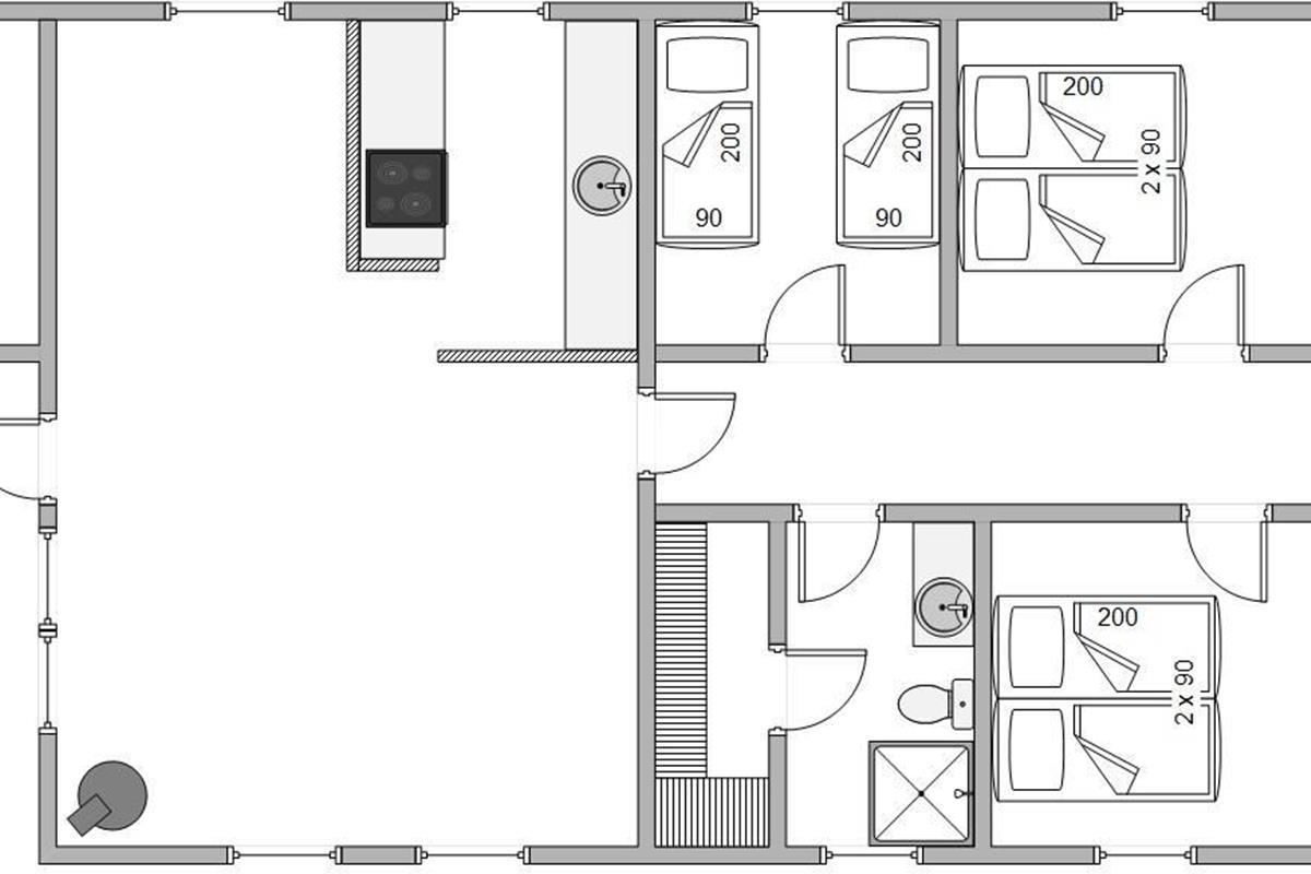 The simple daylight bathroom features underfloor heating, a shower, and direct access to the sauna where you can enjoy extended sauna sessions - perfect for complete relaxation. The bedroom layout comprises two rooms with double beds and one small room with twin beds, offering comfortable sleeping arrangements for all guests.