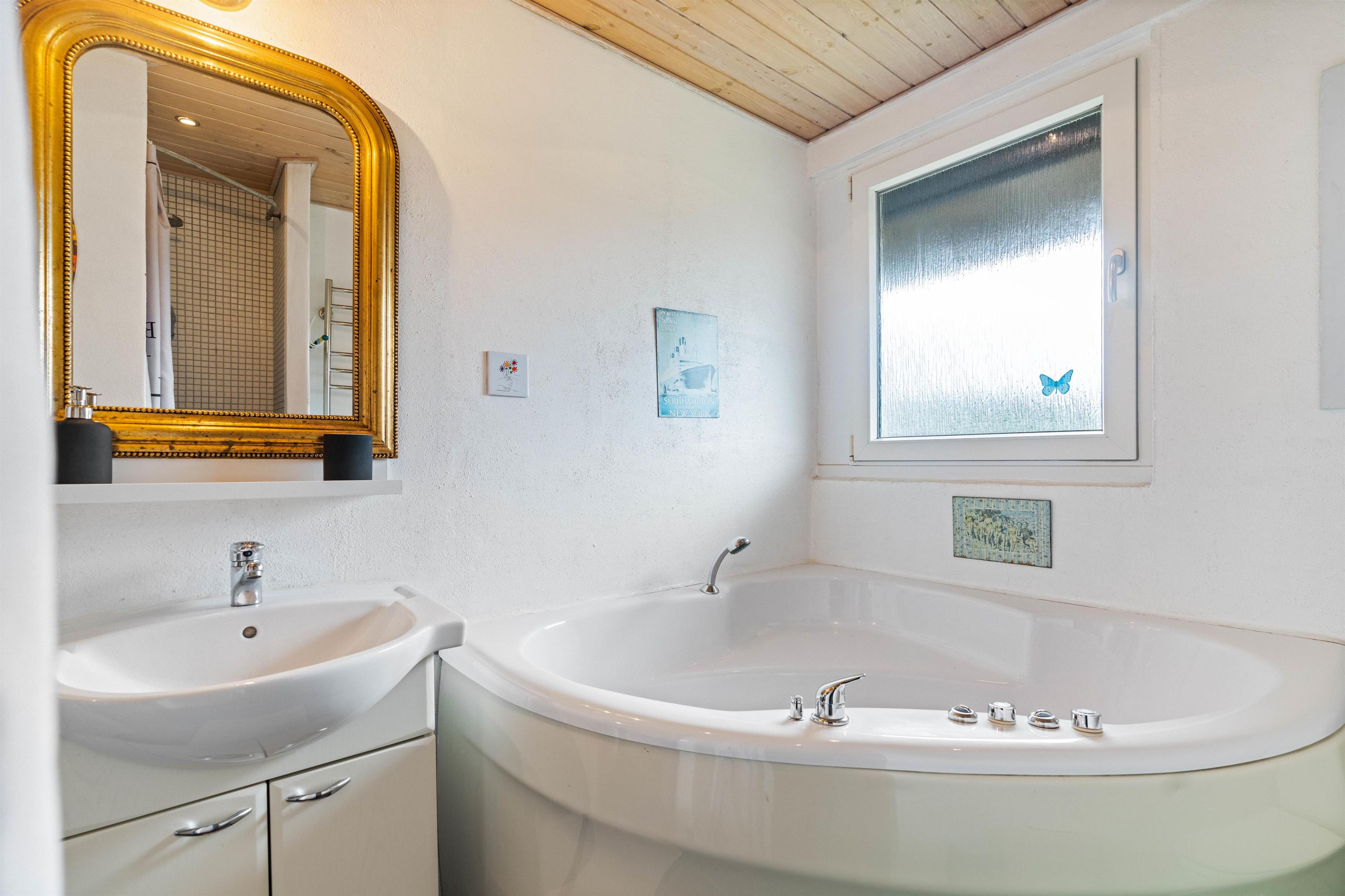 The bathroom features a corner whirlpool, perfect for hours of relaxation. Both adults and children will enjoy spending time in the whirlpool.