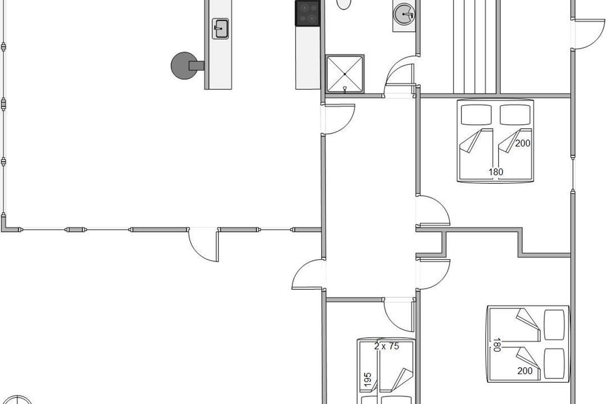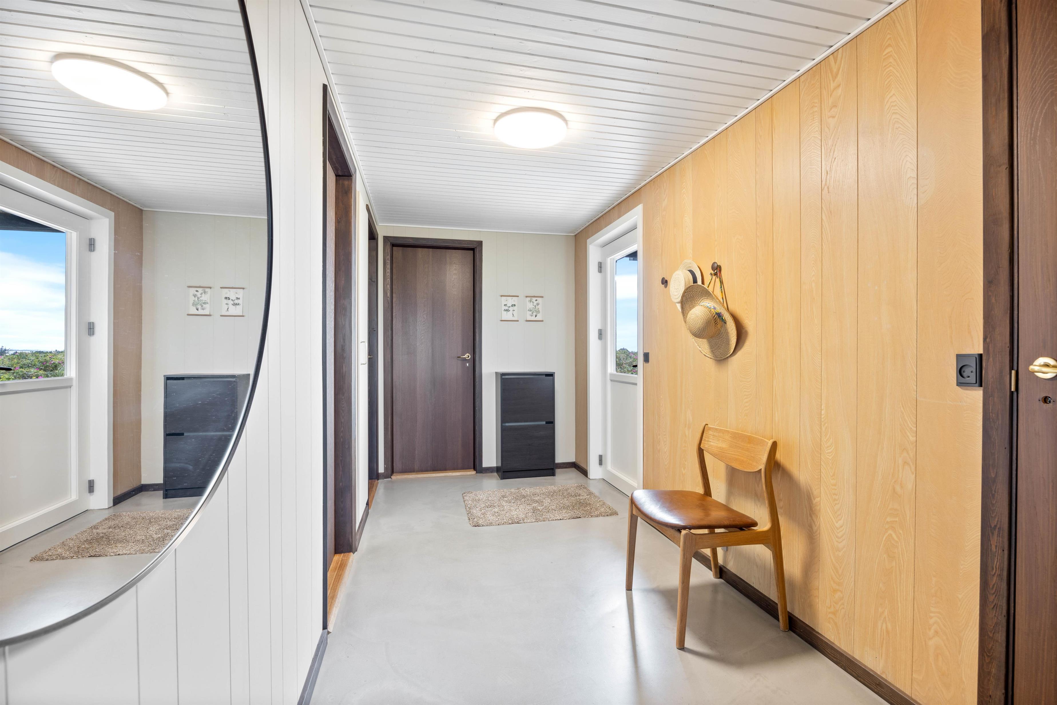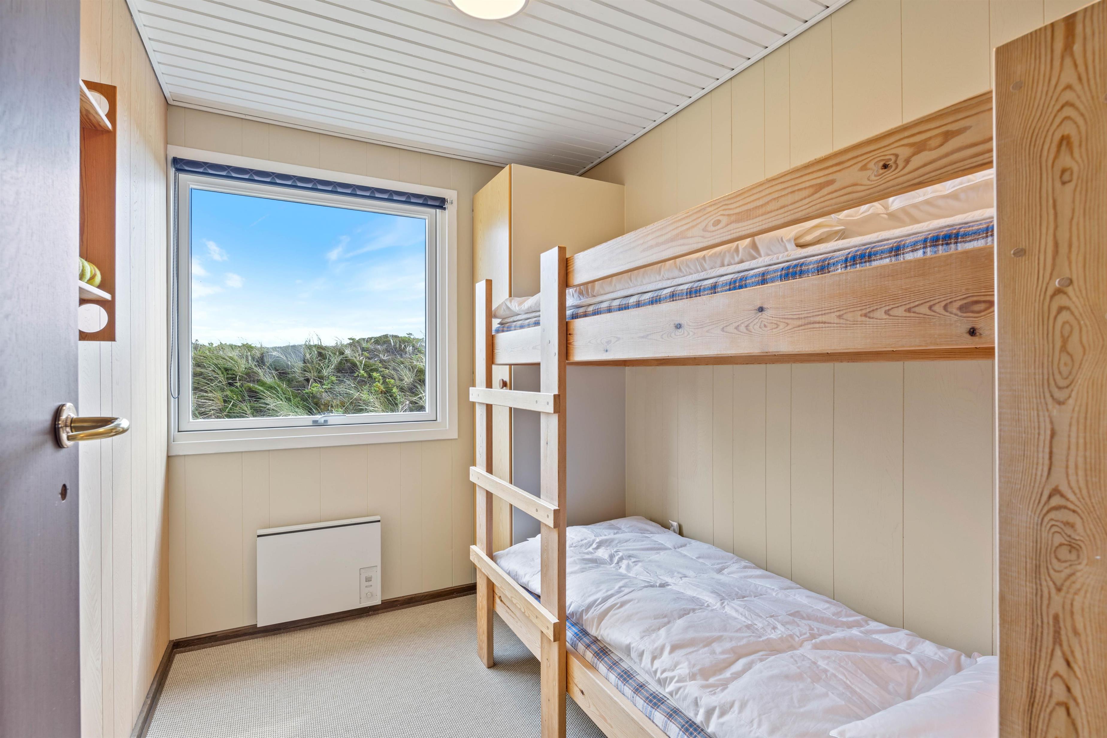 The summer house at Havvej 30 features a practical layout. Enter through the hallway, where you can store your shoes and coats. All other rooms are accessed from here, including two bedrooms with comfortable double beds and a children's bedroom with bunk beds.