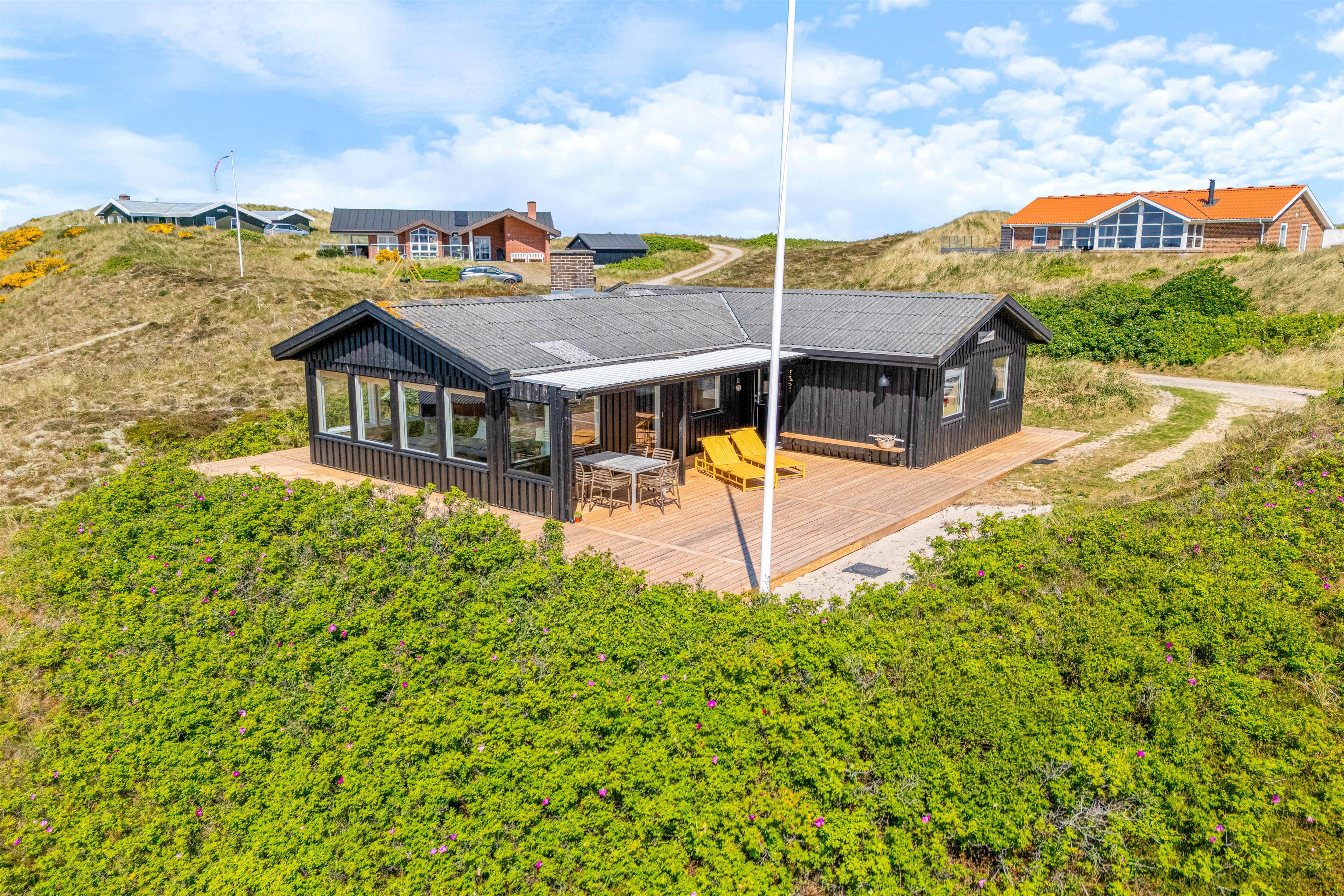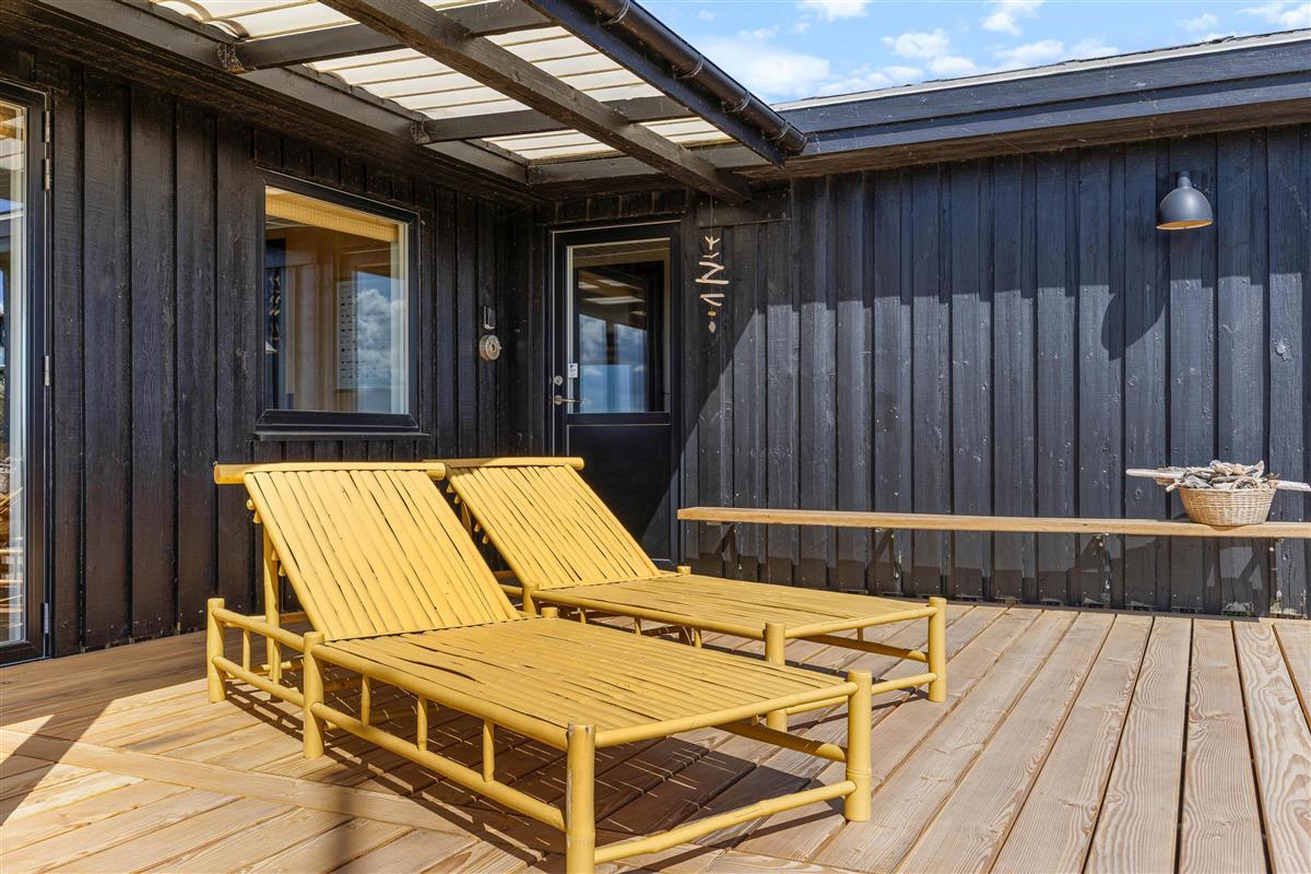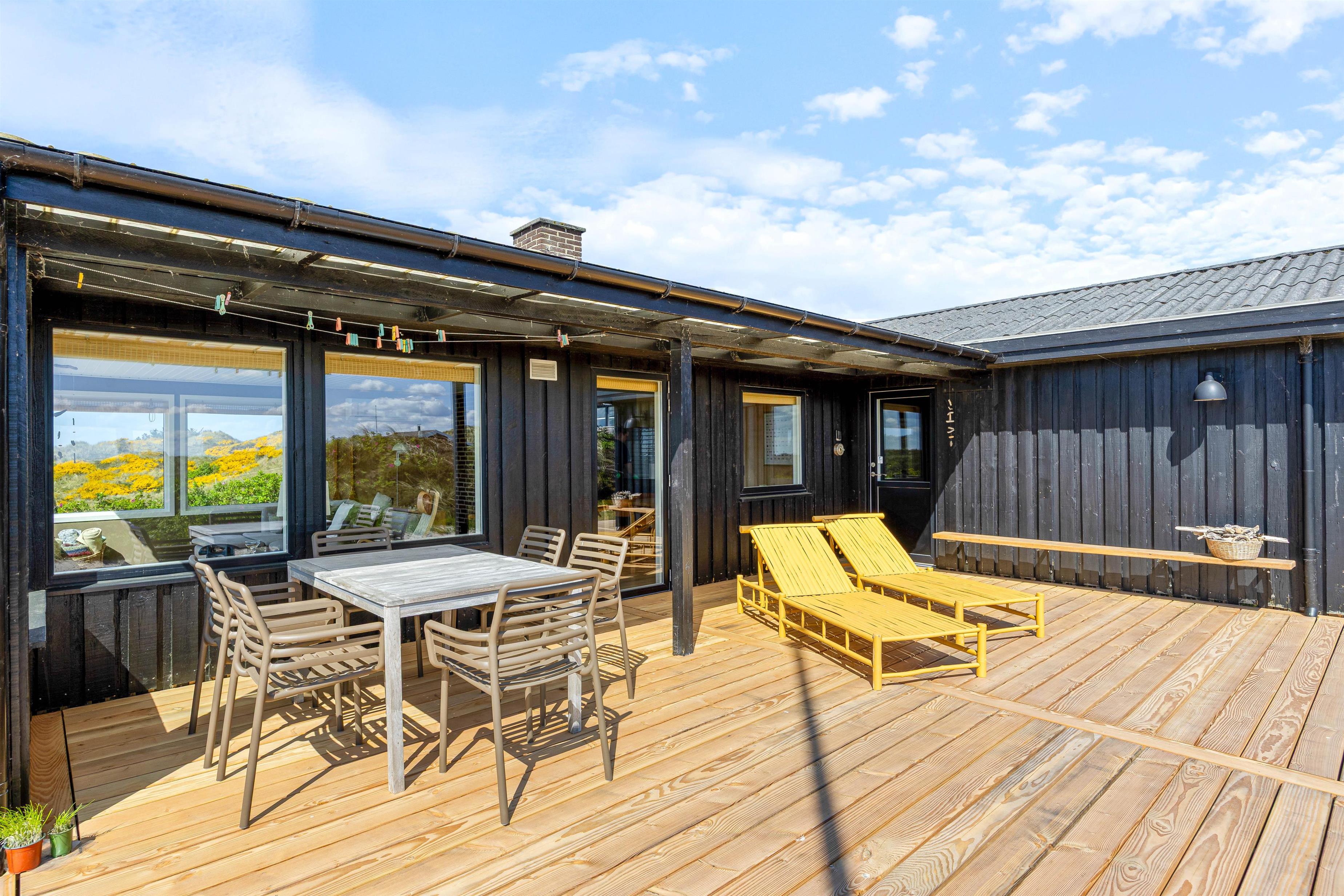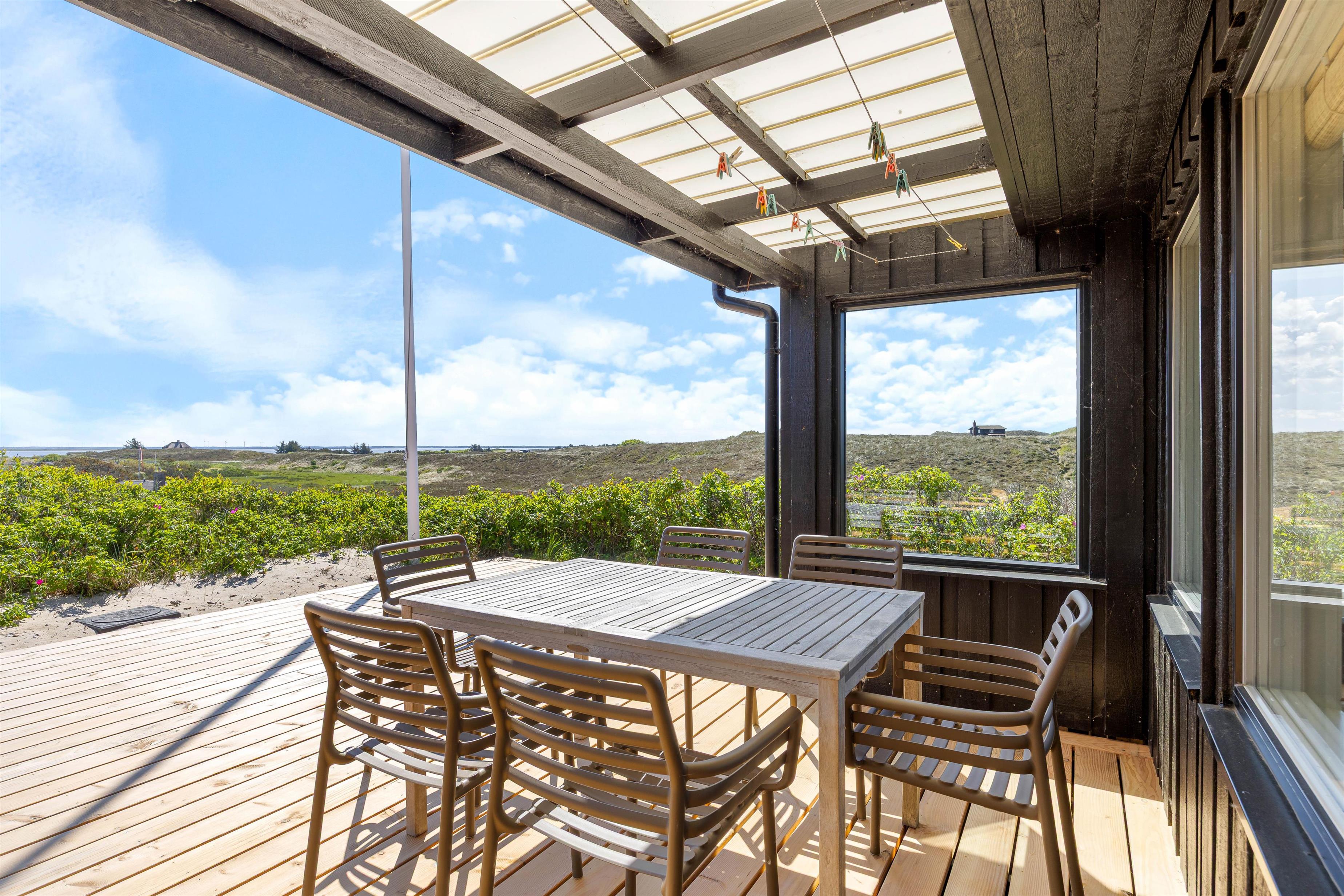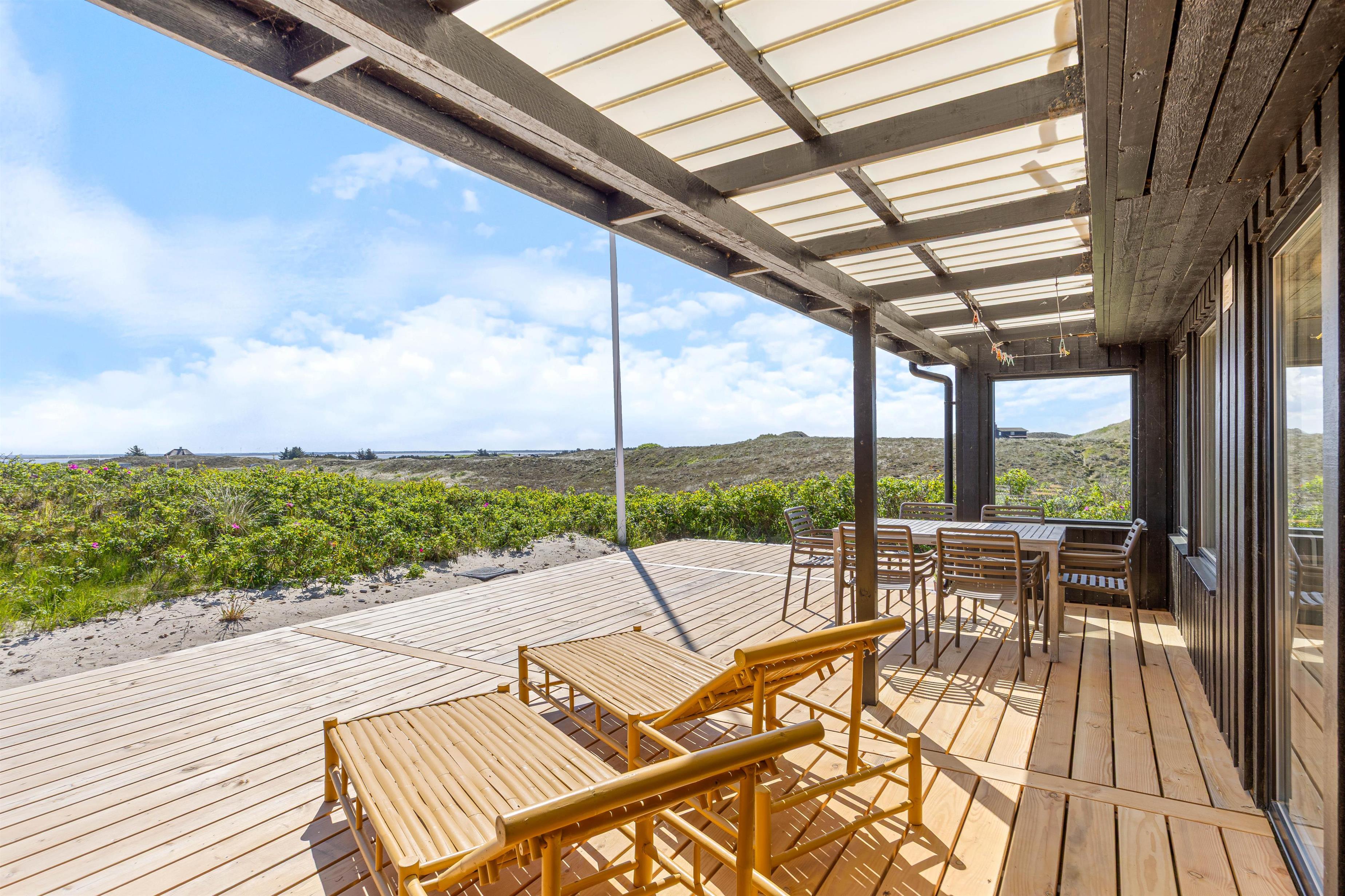 The outdoor area offers perfect relaxation with comfortable garden furniture. The approximately 2,000-square-metre plot is surrounded by natural dune vegetation, creating a natural windbreak around the terrace. Thanks to partial roof coverage, you can find shelter during rain while still enjoying the fresh sea air.