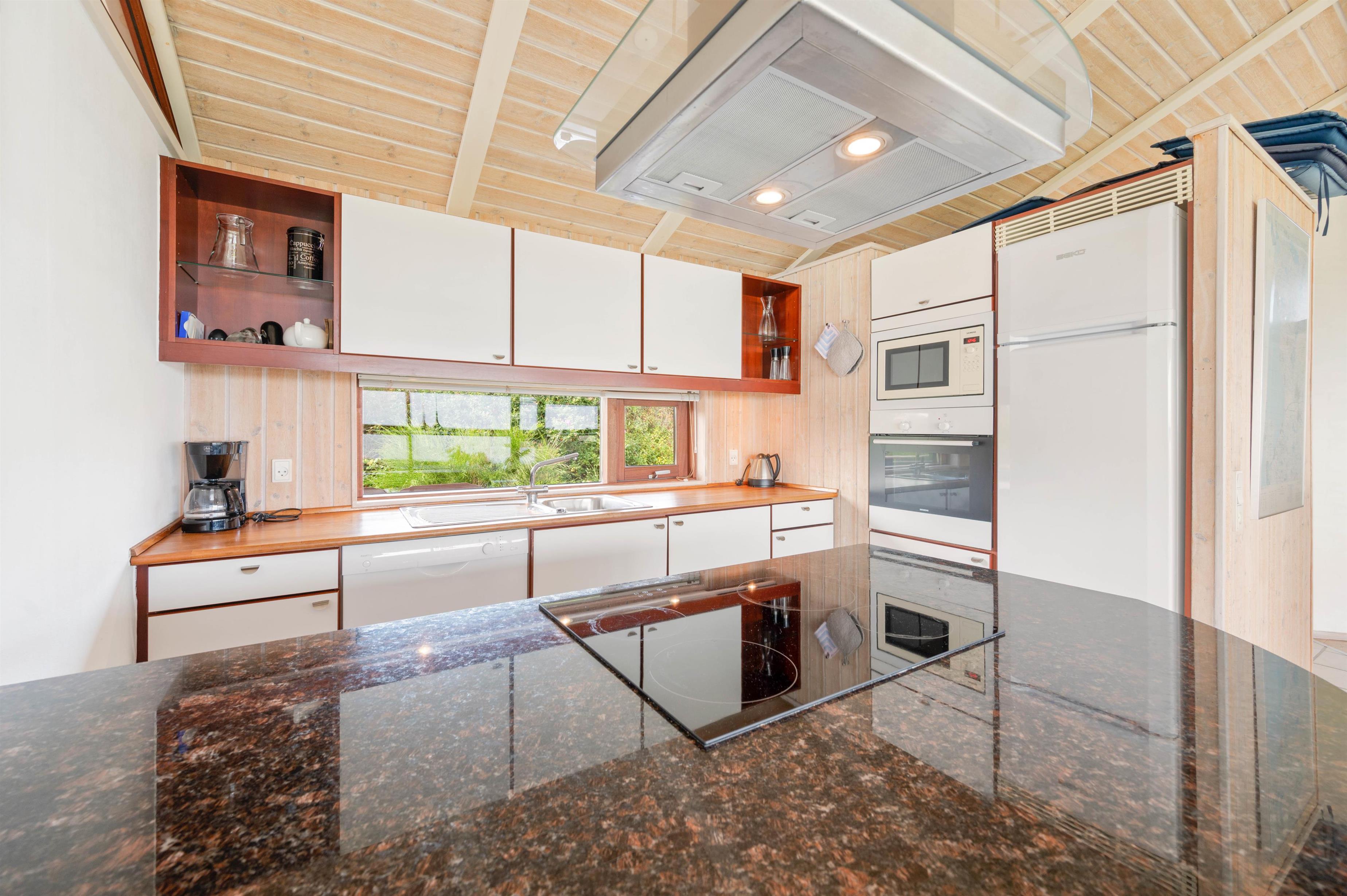 The bright living area forms the center of the holiday home. Large windows create a pleasant atmosphere and allow plenty of natural light. The wood-burning stove adds warmth and comfort, perfect for relaxed evenings together. The open kitchen is well equipped and includes a dishwasher, making daily tasks easy during your stay.