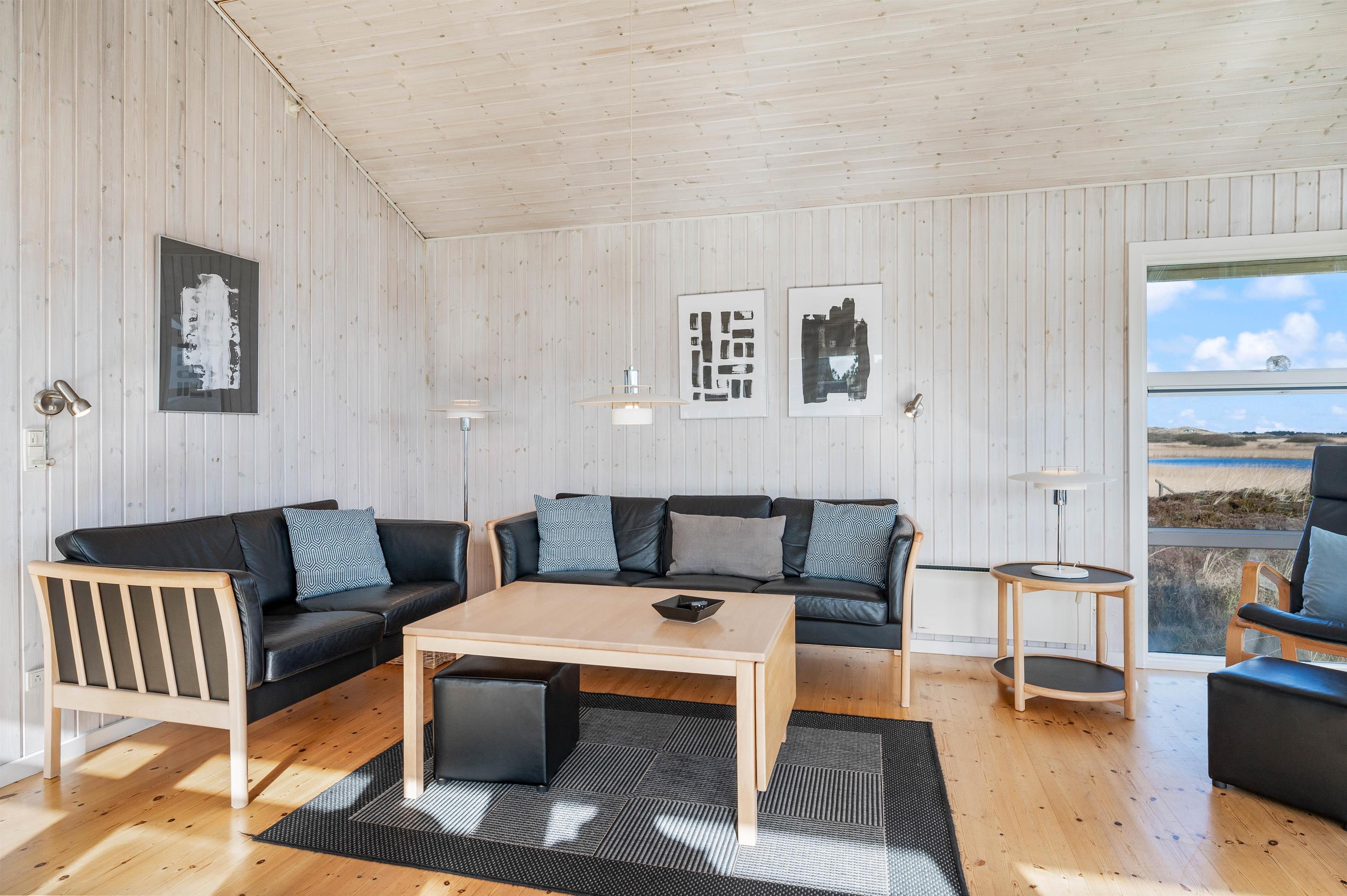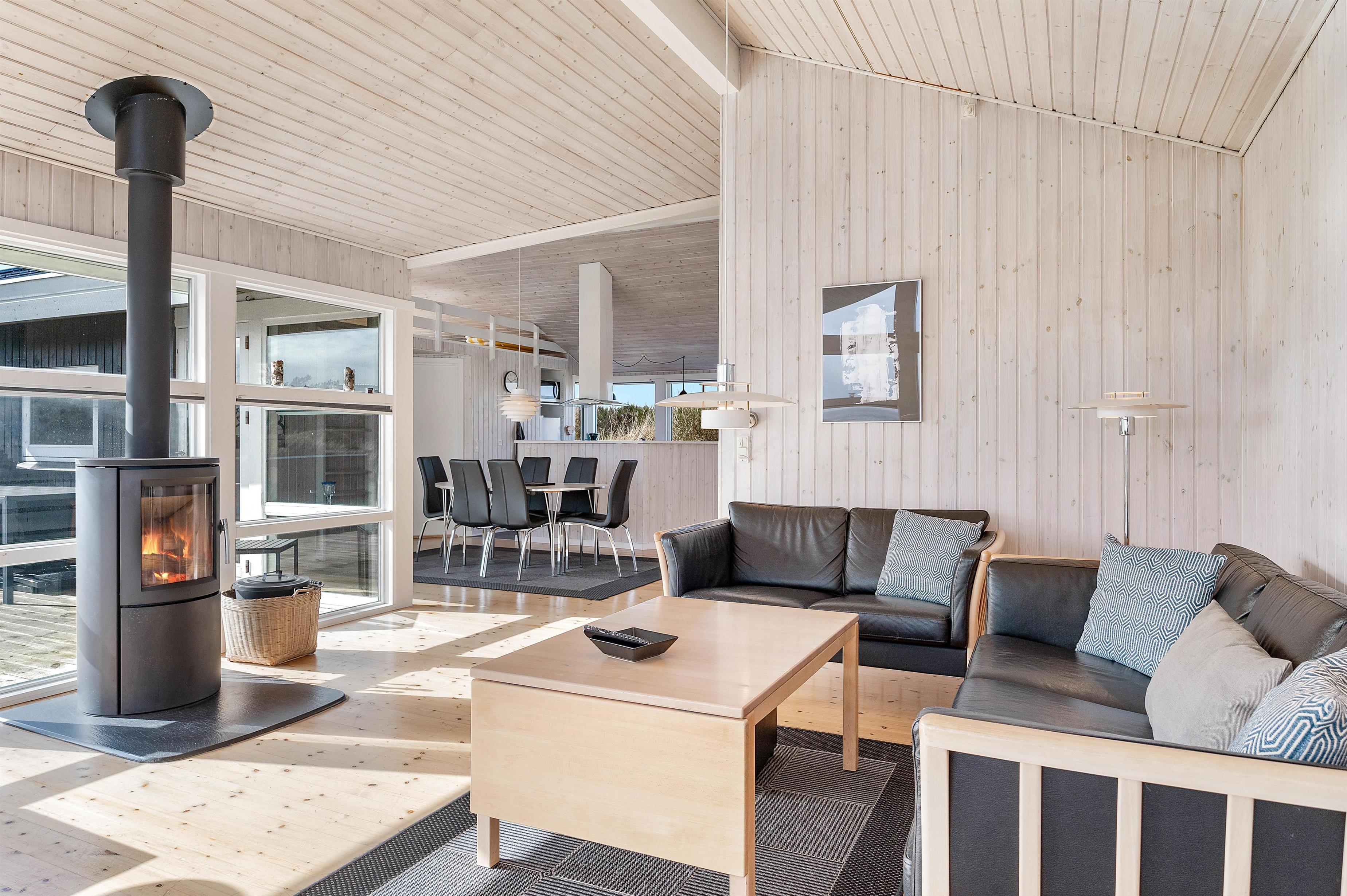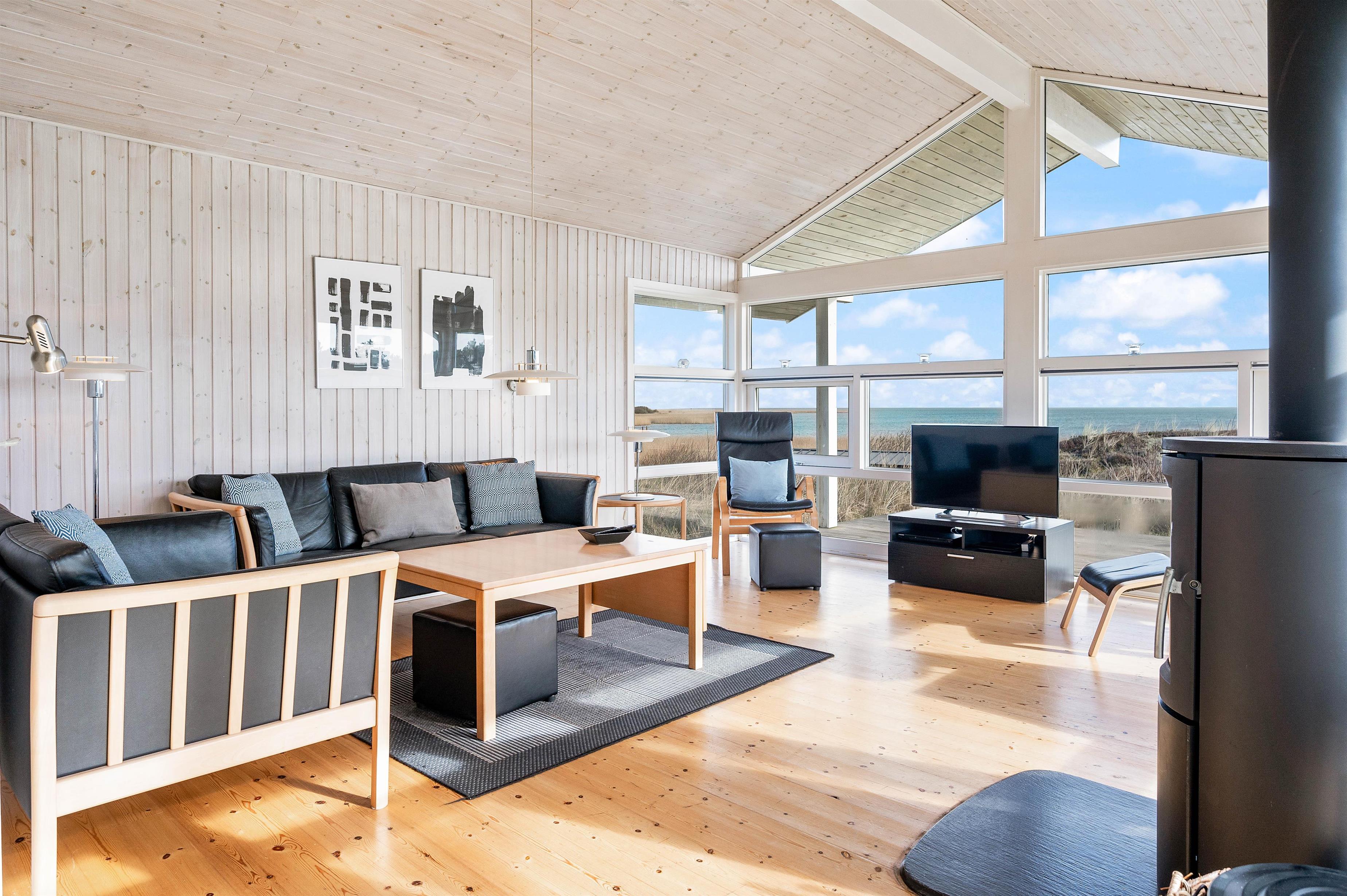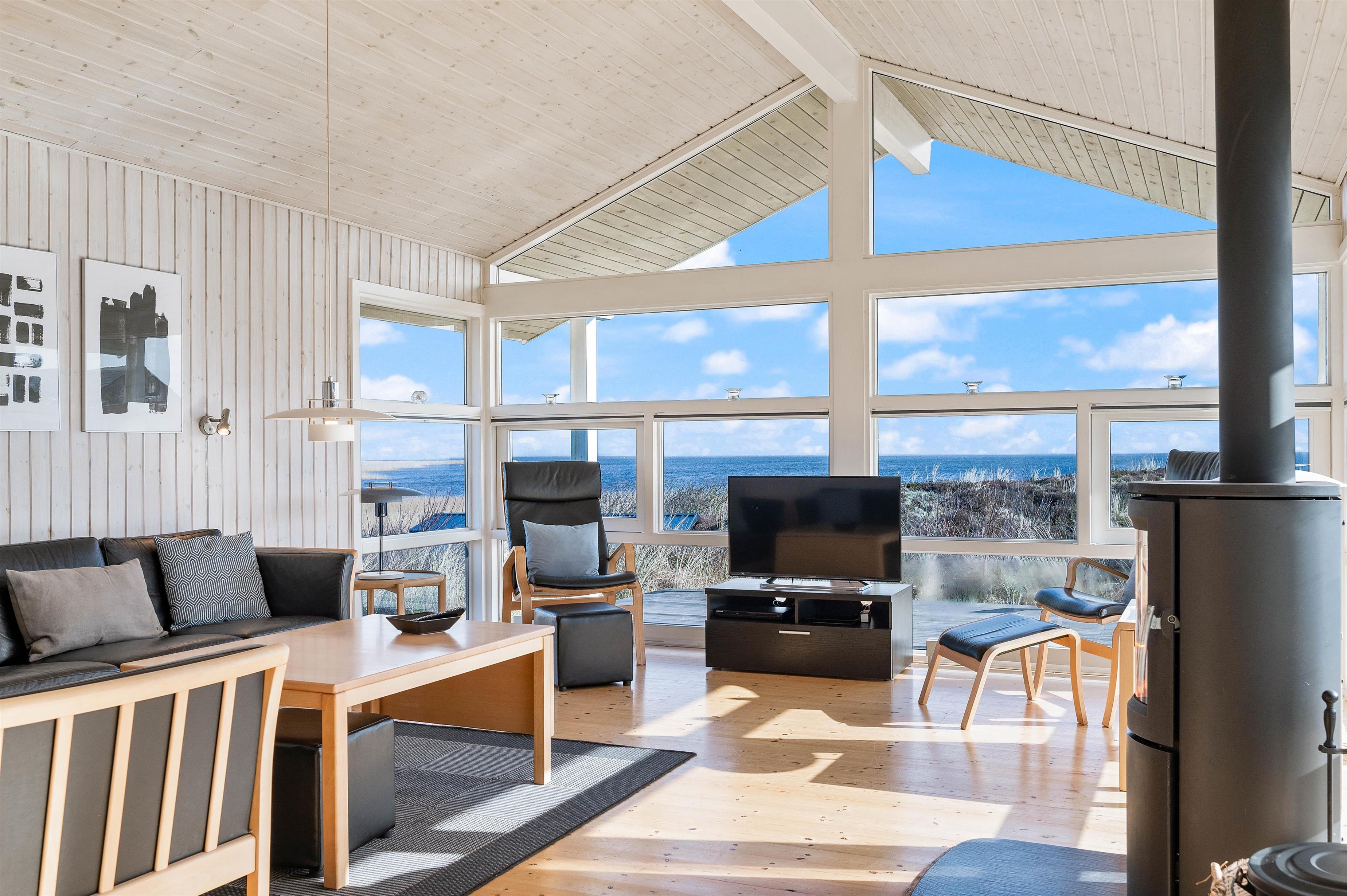 The living area features large picture windows offering panoramic fjord views and flooding the holiday home with natural light. You can enjoy these views throughout the year from the comfort of the cosy sofas.