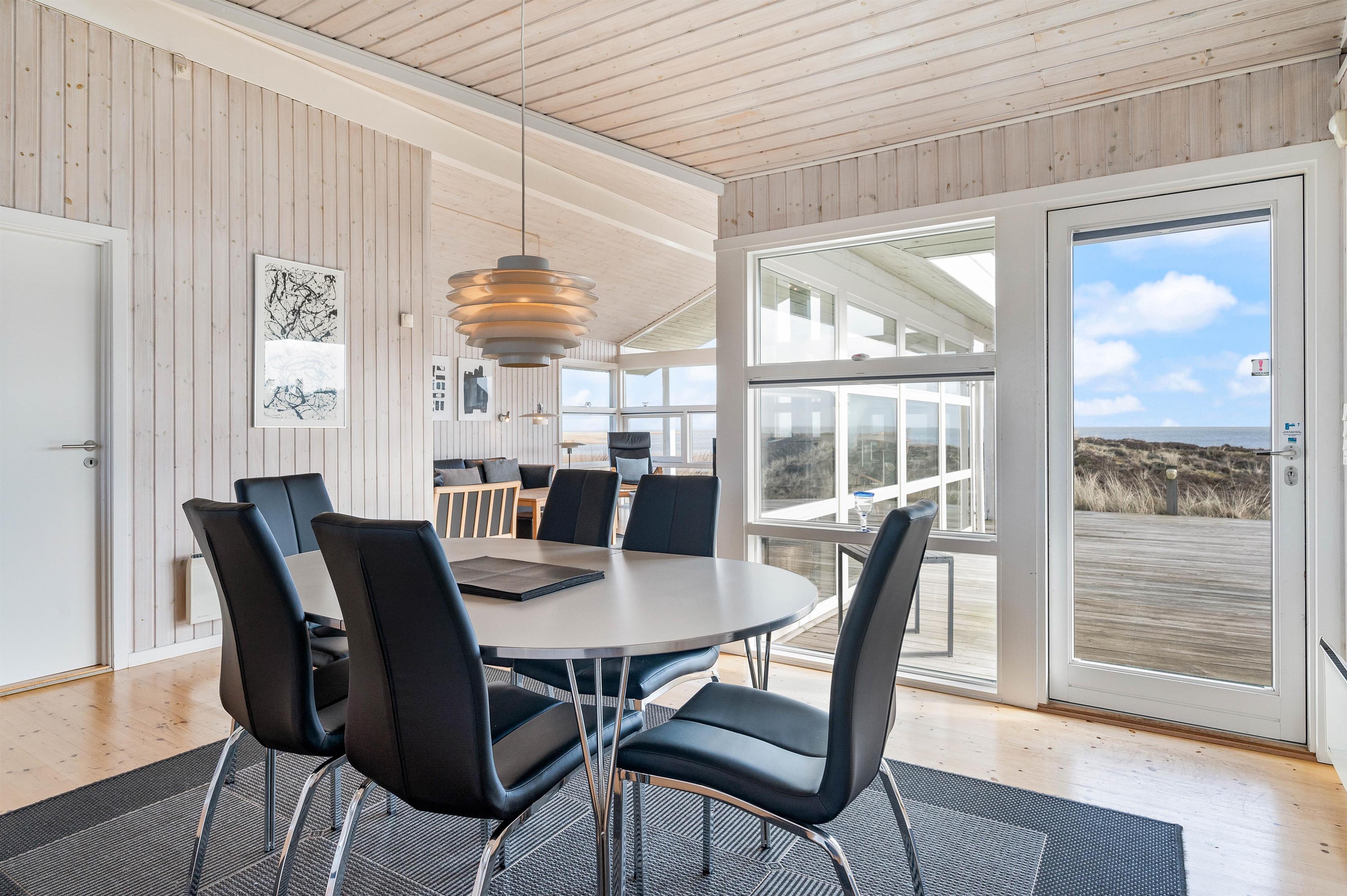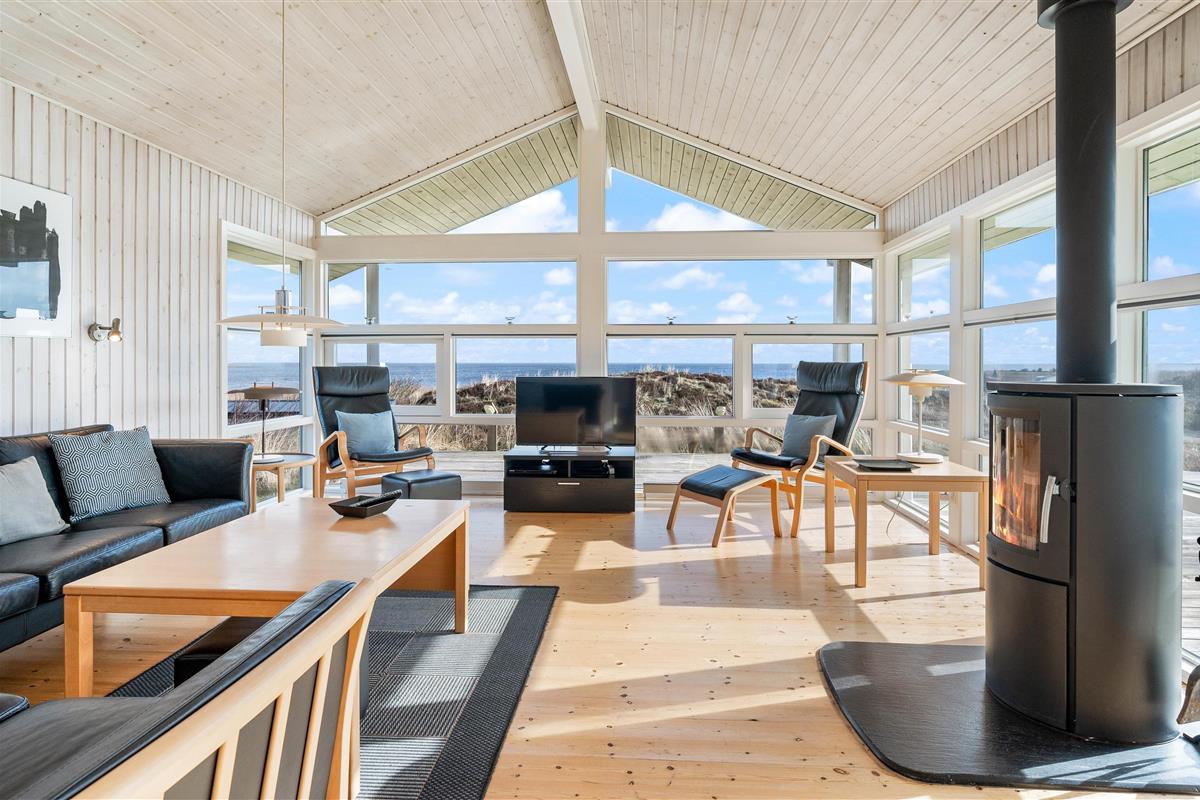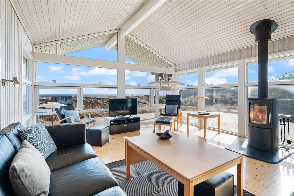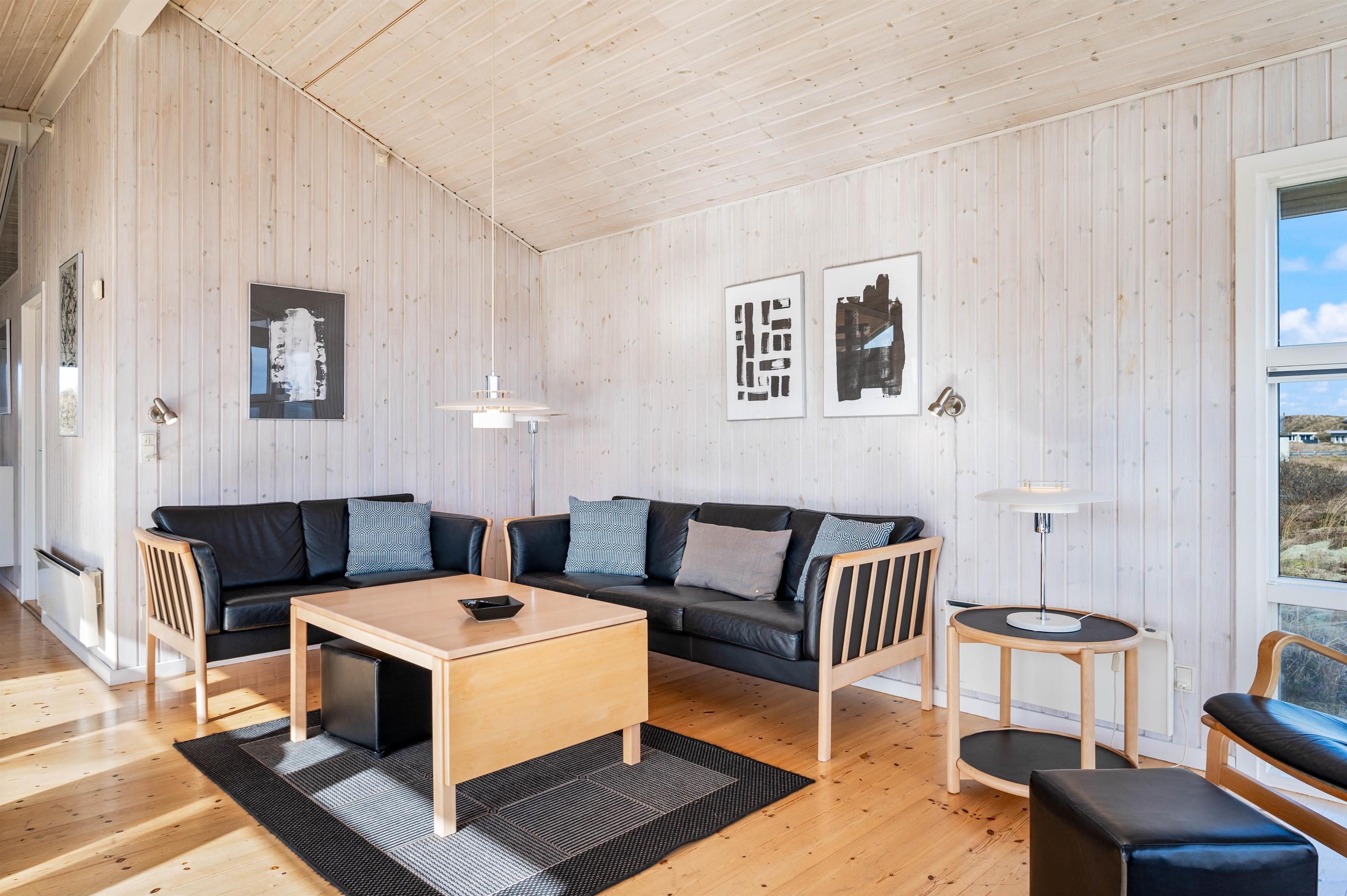 The living area features large picture windows offering panoramic fjord views and flooding the holiday home with natural light. You can enjoy these views throughout the year from the comfort of the cosy sofas.