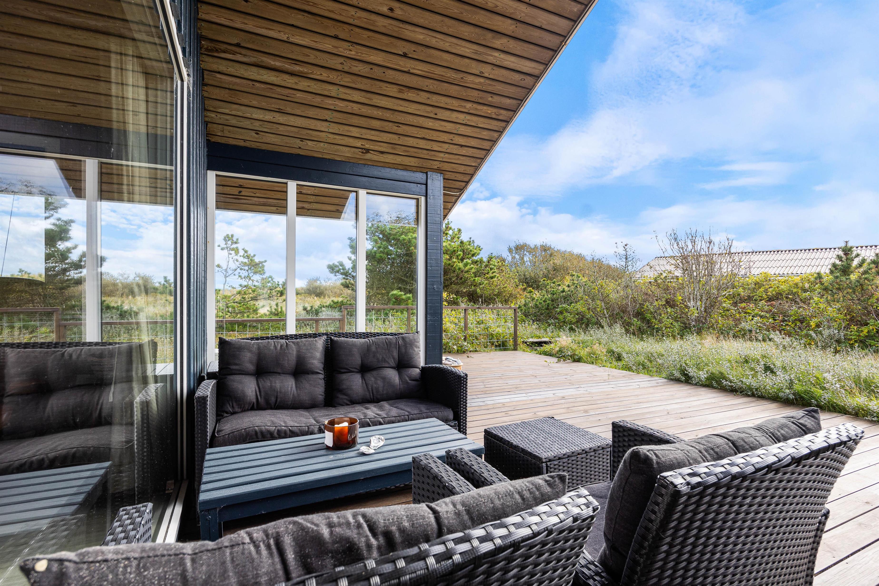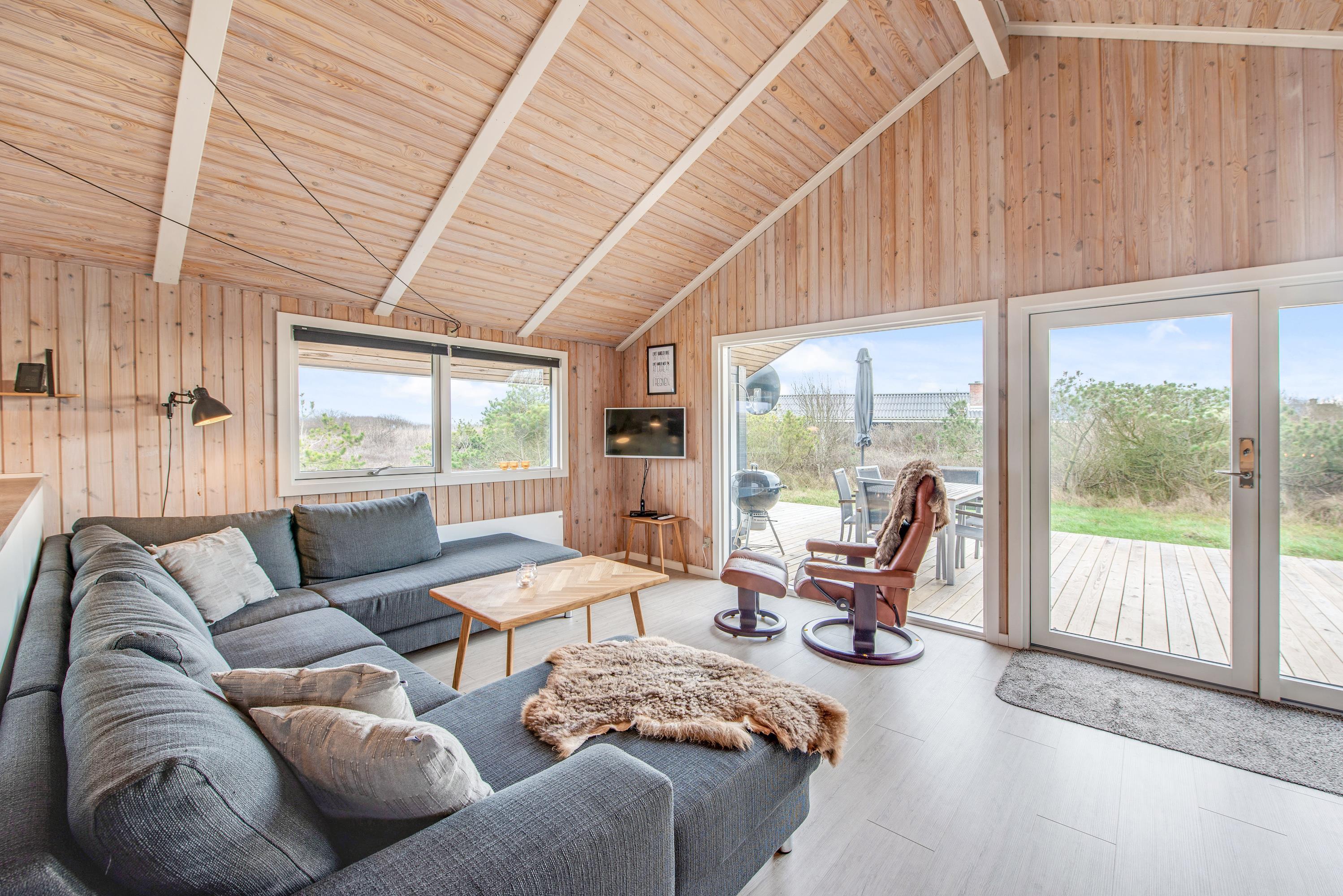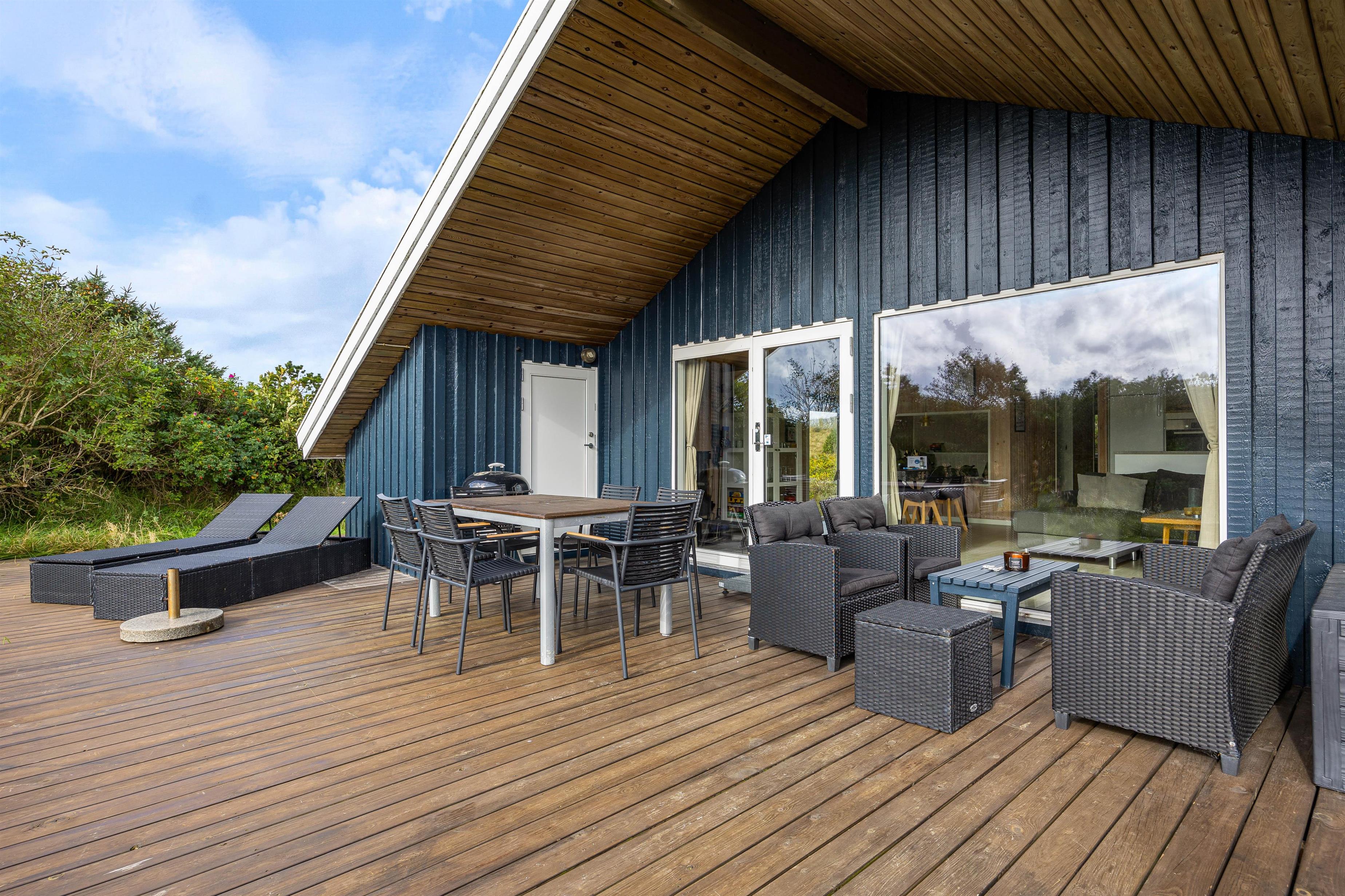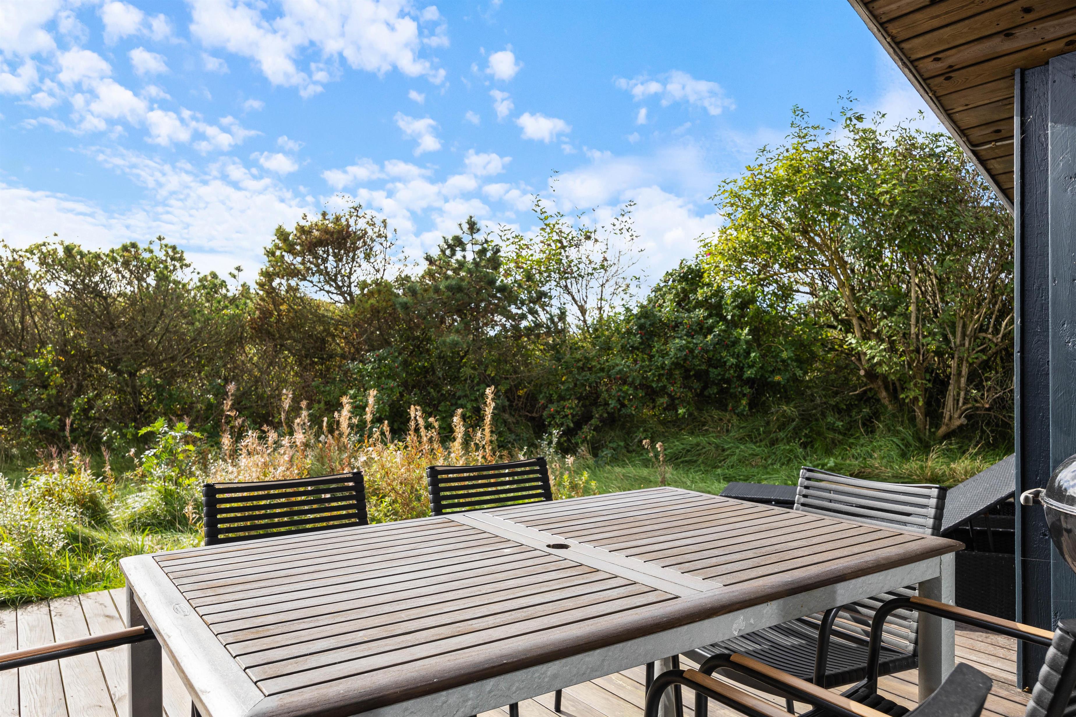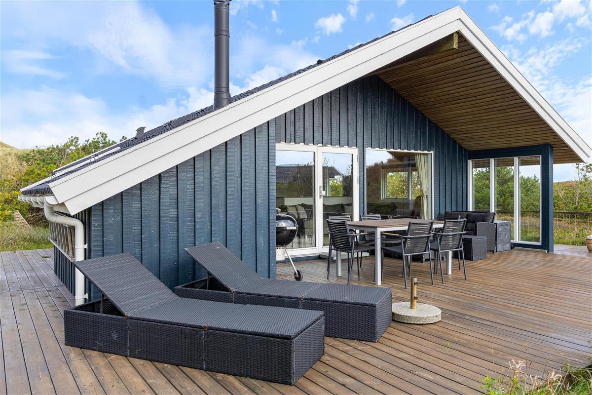 From the living room, you step out onto the holiday home's lovely wooden terrace. Here you'll find both a covered section, offering shelter in all weather conditions, and an open area where you can enjoy the sunshine on warm summer days. Garden furniture, sun loungers and a barbecue are provided - everything you need to enjoy good weather and round off the day with a lovely barbecue dinner in the warm evening sun.