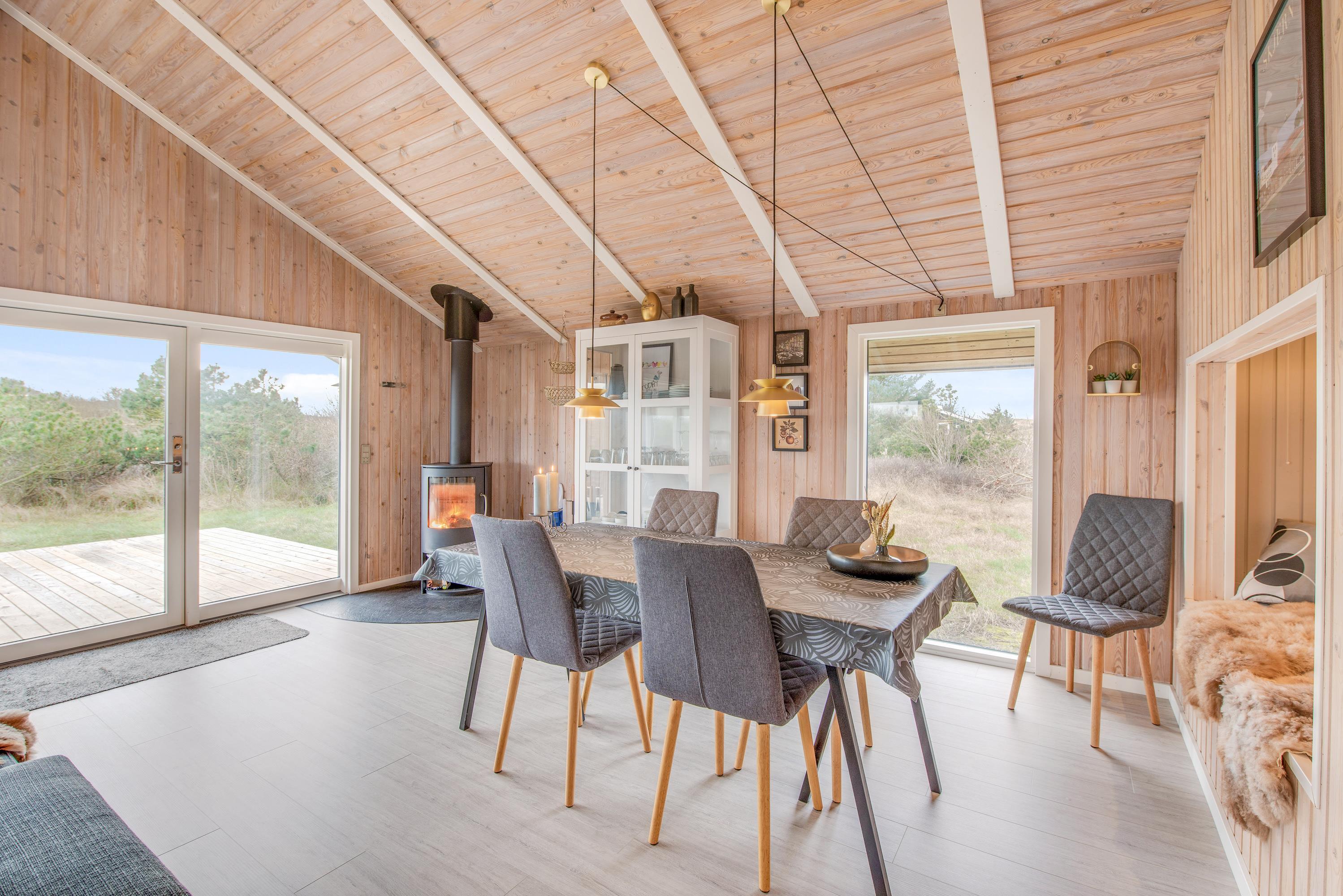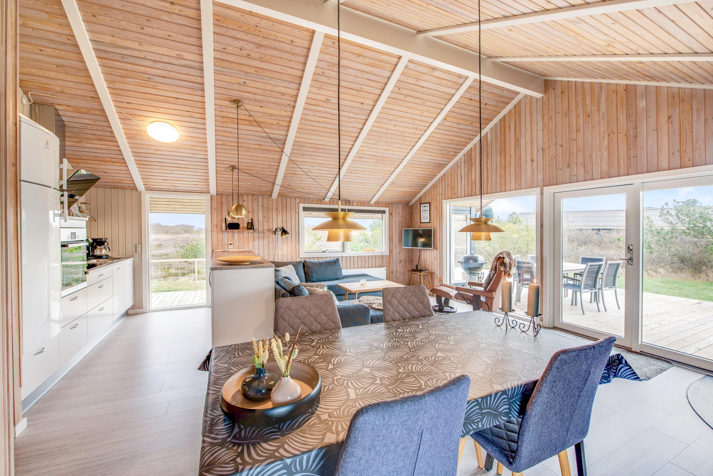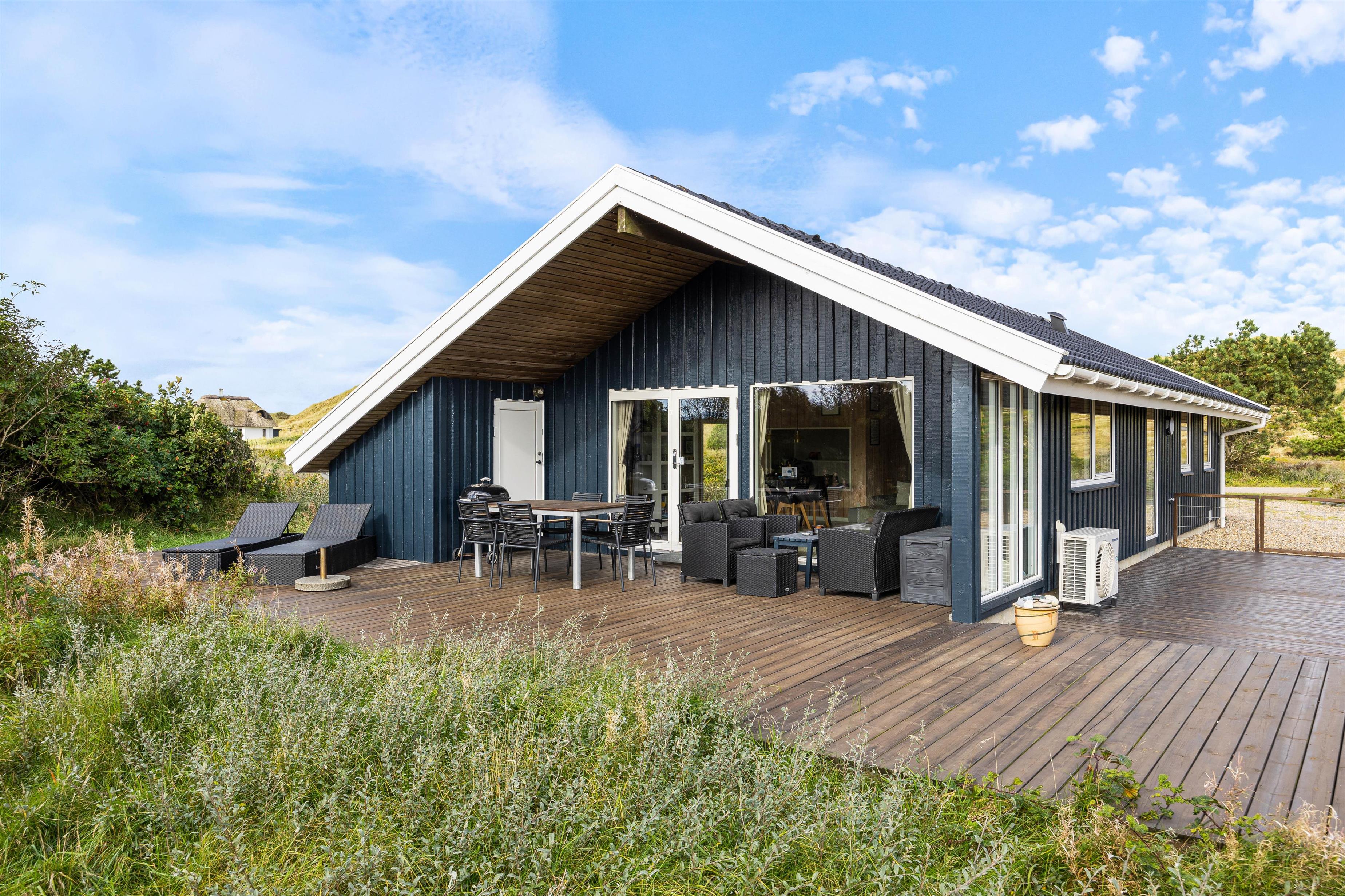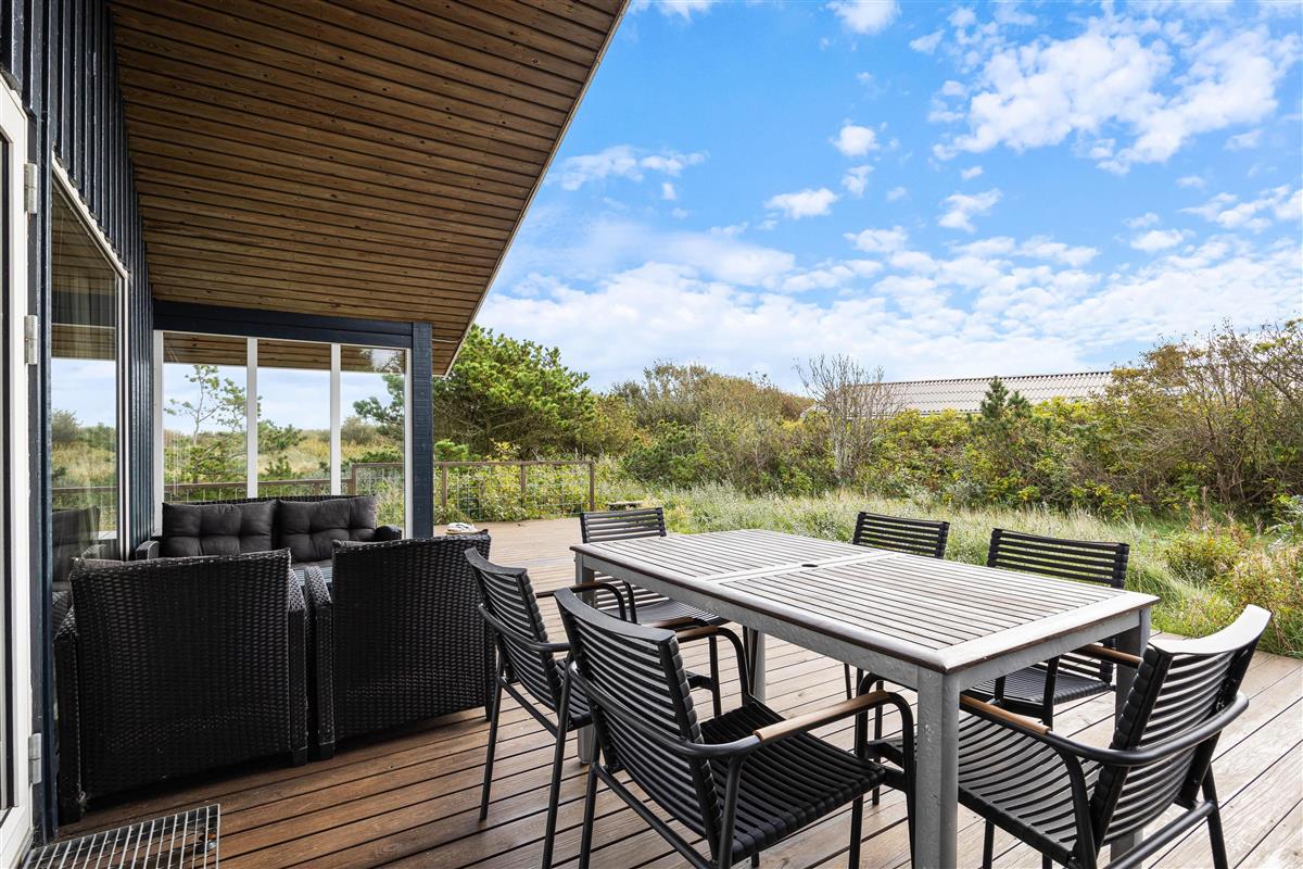 From the living room, you step out onto the holiday home's lovely wooden terrace. Here you'll find both a covered section, offering shelter in all weather conditions, and an open area where you can enjoy the sunshine on warm summer days. Garden furniture, sun loungers and a barbecue are provided - everything you need to enjoy good weather and round off the day with a lovely barbecue dinner in the warm evening sun.