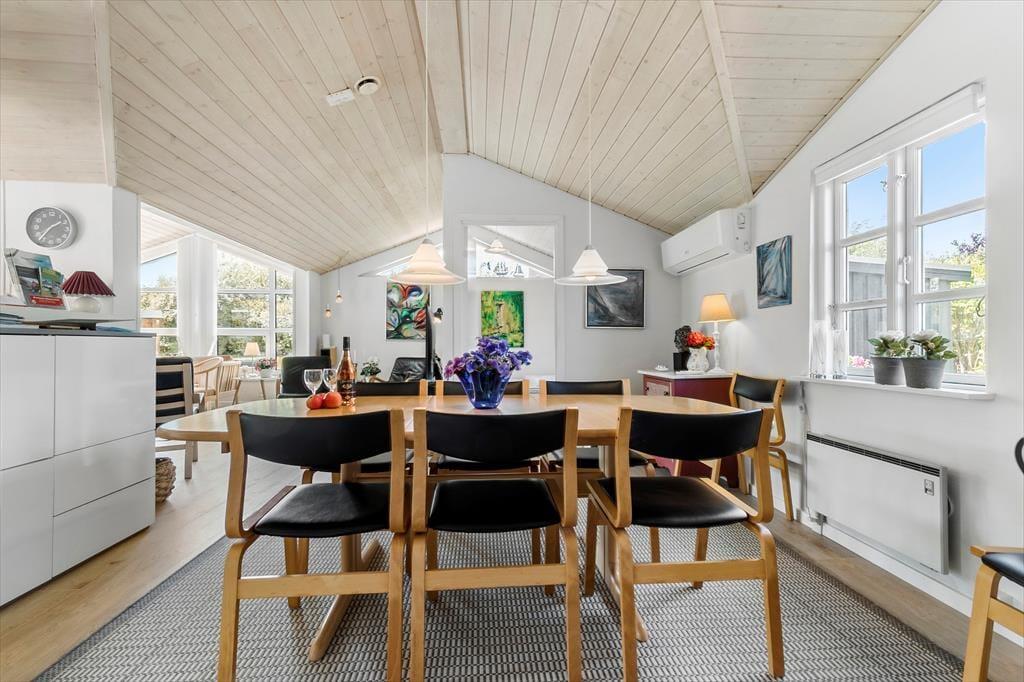 Nicht weit von einem schönen Badestrand entfernt, erwartet Sie dieses gemütliche und gepflegte Urlaubsdomizil. Das Haus beinhaltet einen angenehm hellen, gemütlichen Wohnraum, der mit guten Möbeln, einem Kaminofen und einer Wärmepumpe ausgestattet ist. In Verbindung mit dem Wohnraum lockt die schöne und praktische Küche, in der Ihnen diverse Küchengroßgeräte die Zubereitung Ihrer Mahlzeiten erleichtern. Das schöne Badezimmer empfängt Sie mit einer Duschnische, einer Fußbodenheizung, einer Waschmaschine und einem Wäschetrockner. Die vorhandenen Schlafplätze verteilen sich auf zwei gute Schlafräume von denen einer mit einem Doppelbett eingerichtet ist. Im zweiten Schlafraum stehen ein Einzel- und ein Etagenbett für Sie bereit. Zusätzliche Schlafgelegenheiten befinden sich in Form eines guten, doppelten Schlafsofas im Wohnraum. Für die kleinsten Urlaubsgäste sind ein Hochstuhl und ein Kinderbett vorhanden. Gleiches gilt für eine Internetverbindung.