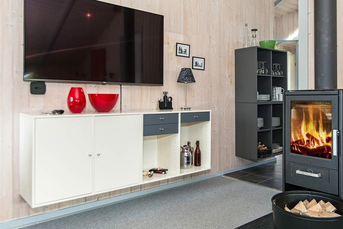 Den Mittelpunkt der Wohnfläche bildet der Küchen-/Wohnbereich für das Familienleben. Hier gibt es eine Ess- und eine Sitzecke, für kühlere Abende steht ein Holzofen bereit. Von diesem Haus haben Sie Zutritt zur Terrassenfläche des Hauses.