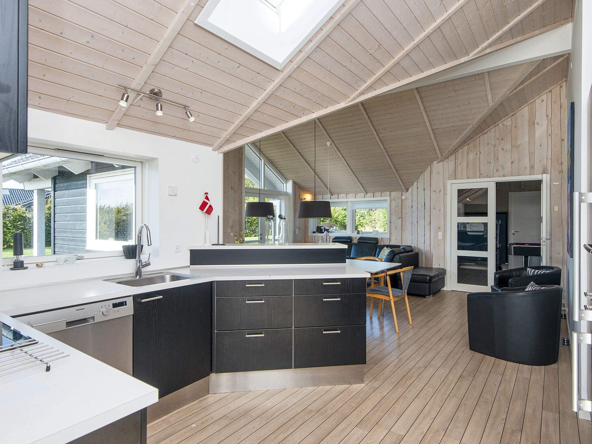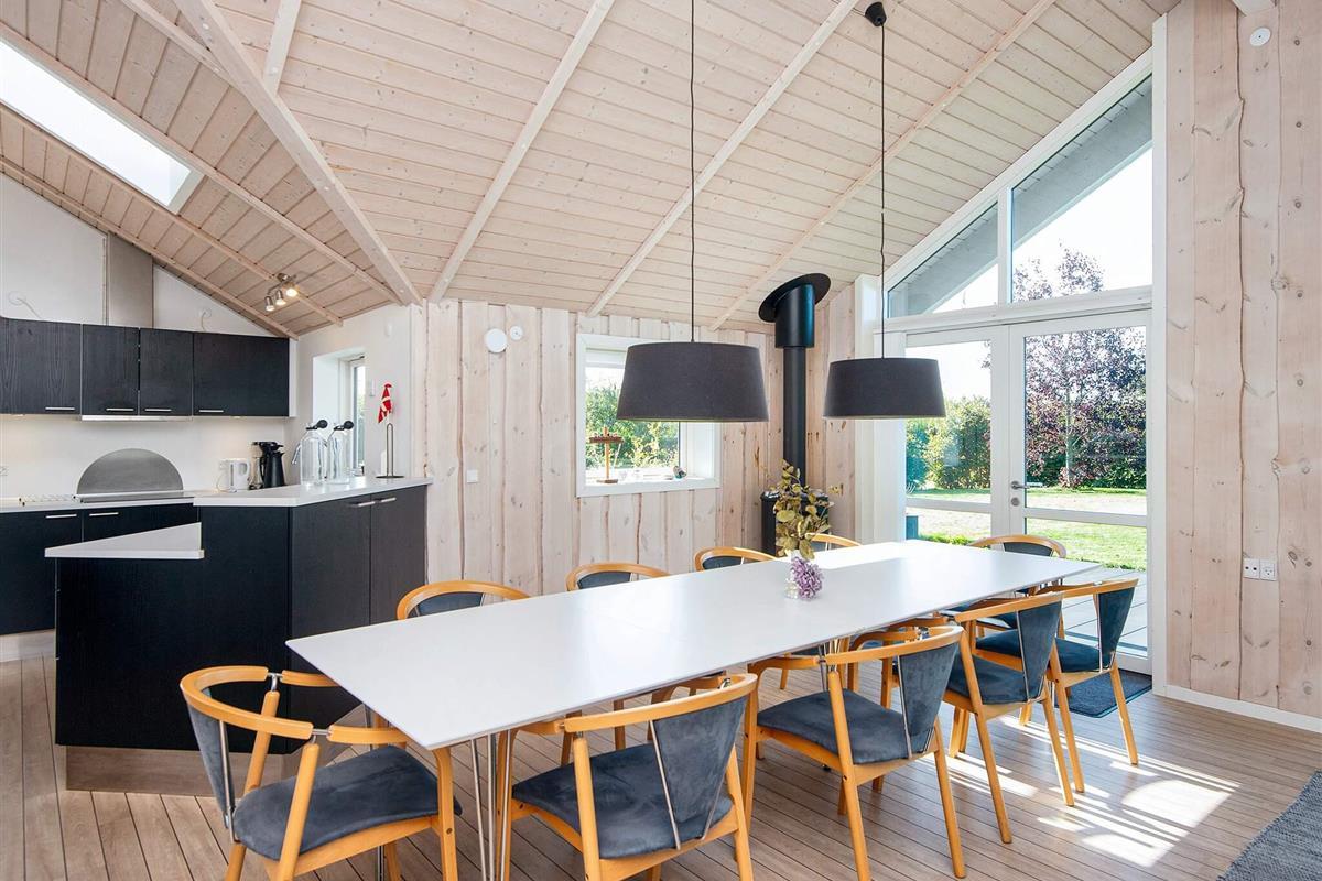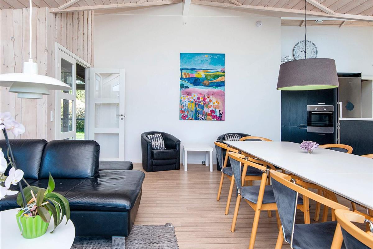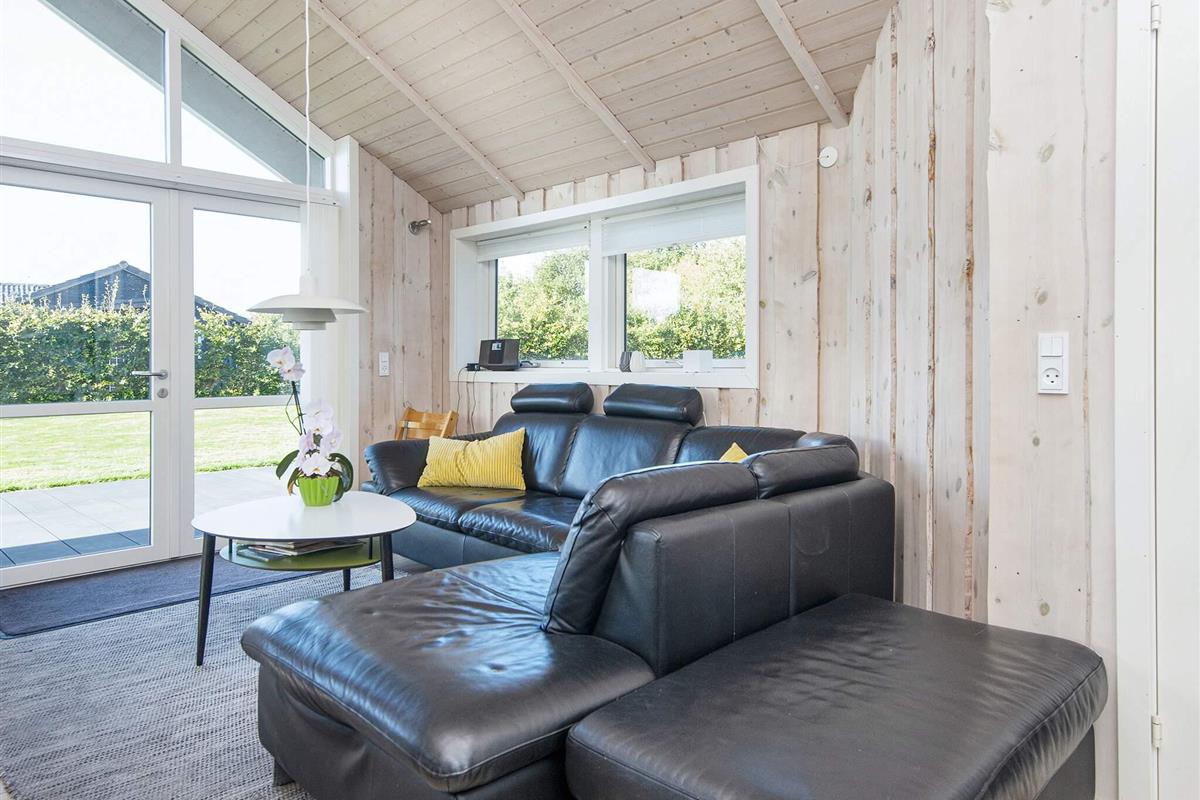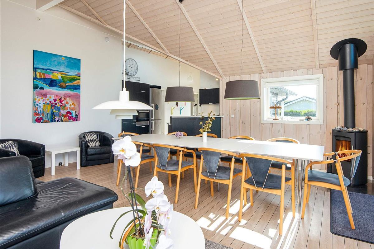 Dieses Aktivitätsferienhaus bietet gute Entfaltungsmöglichkeiten für die ganze Familie. Das Haus liegt auf einem großen Grundstück, in dem Gebiet Skomose, wo der Strand sowohl aus Bereichen mit Sand und kleinen Steinen besteht. Mit vier Schlafzimmern mit je zwei Betten und einem Schlafboden mit zwei Schlafplätzen bietet das Haus insgesamt Platz für 10 Personen. Das Haus wurde in hellen Farben und mit einer guten Raumaufteilung eingerichtet. Es gibt einen Holzofen und eine große, teils überdachte Terrasse, wo Sie schöne Stunden im Freien genießen können. Vom 1. Mai bis 1. Oktober hat ein Kaufladen ca. 500 m vom Haus geöffnet.