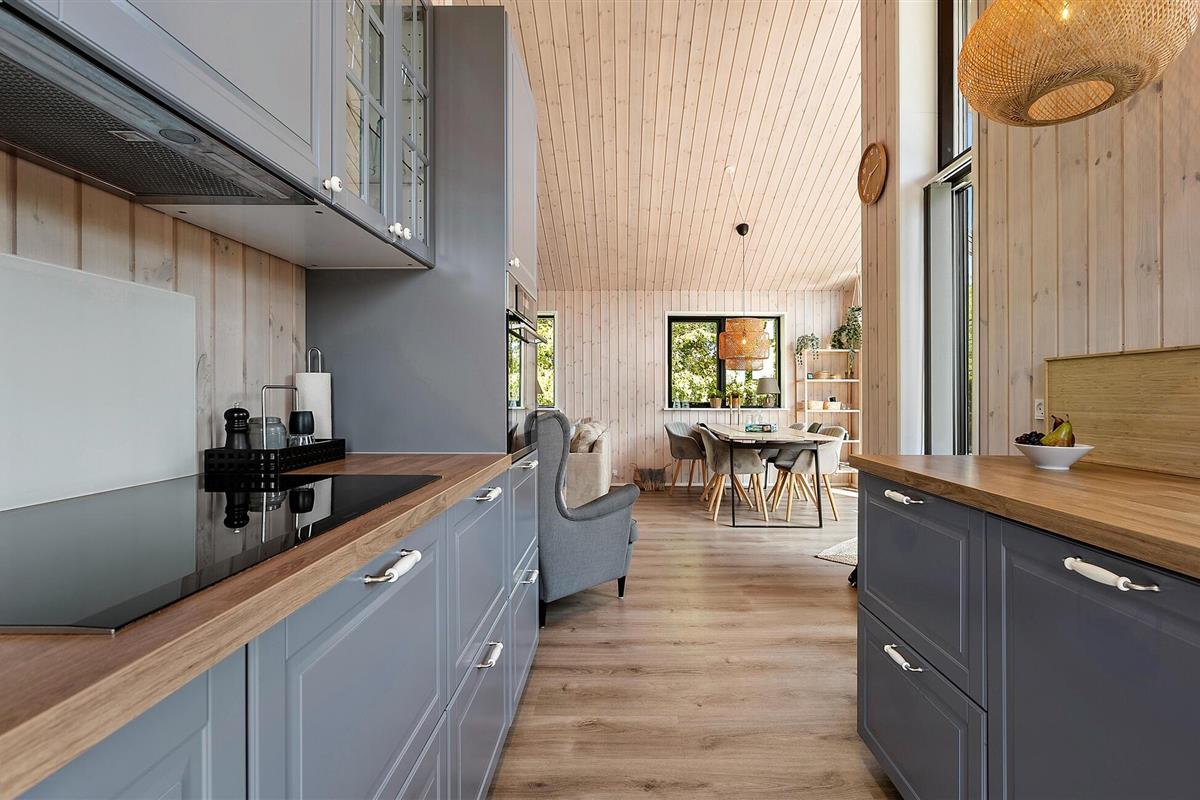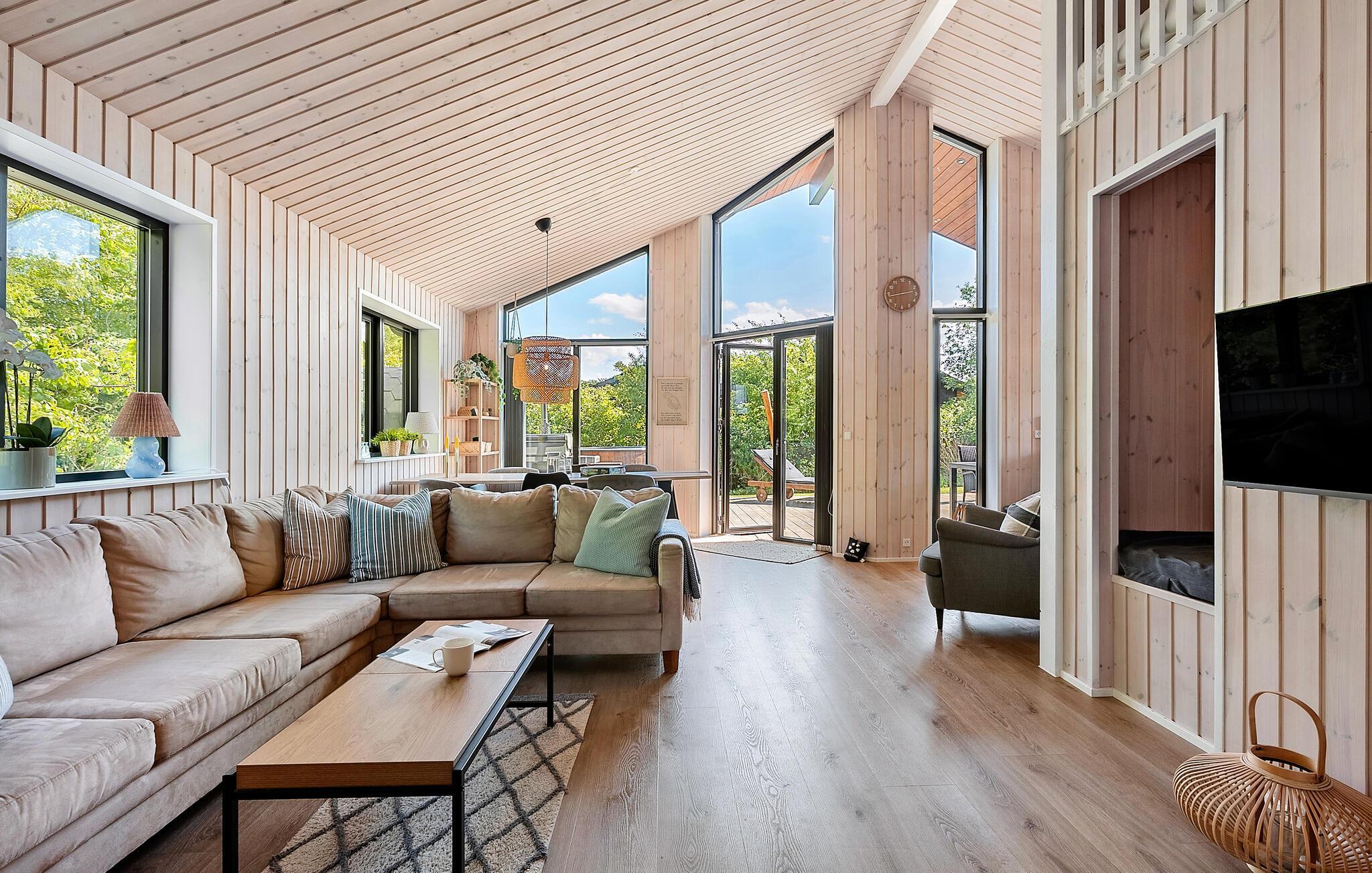 Welkom in Skovmose, waar een heerlijk zomerhuis op u wacht. In de zolderruimte onder het dak, op het terras met uitzicht op de tuin, in het Finse houten bad in de frisse lucht of in de open woonkamer - elk element van het interieur ademt een gezellige sfeer uit waardoor u echt kunt genieten.