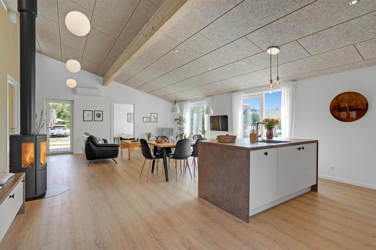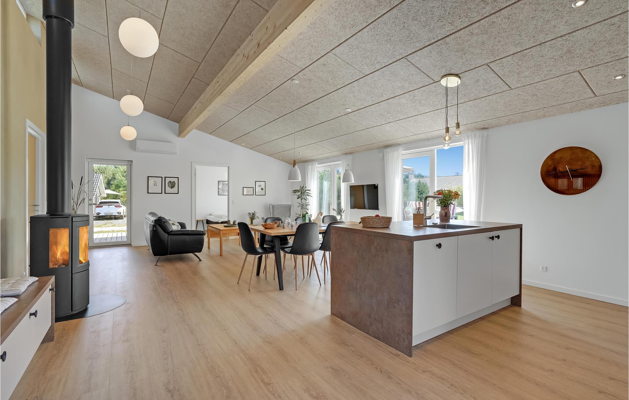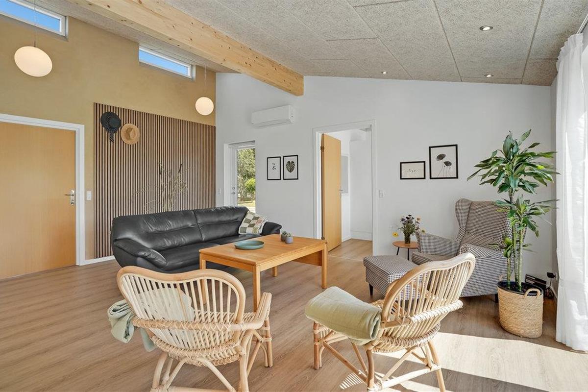 Welkom in Skovmose, waar een stijlvol, eigentijds ontworpen zomerhuis op u wacht. Op het terras met uitzicht op de tuin, in het Finse houten bad of in de open woonkamer voor de open haard - elk element van het interieur ademt een frisse, gezellige sfeer uit waardoor u echt kunt genieten.