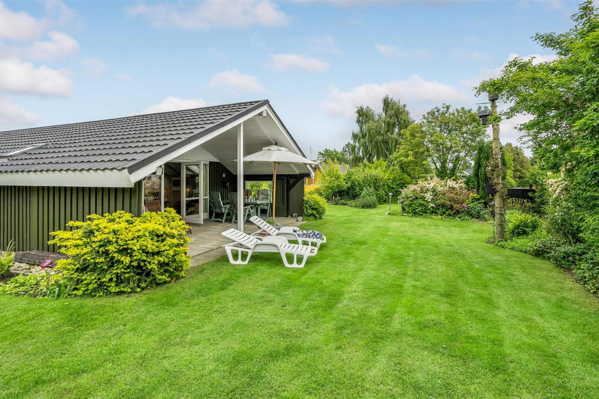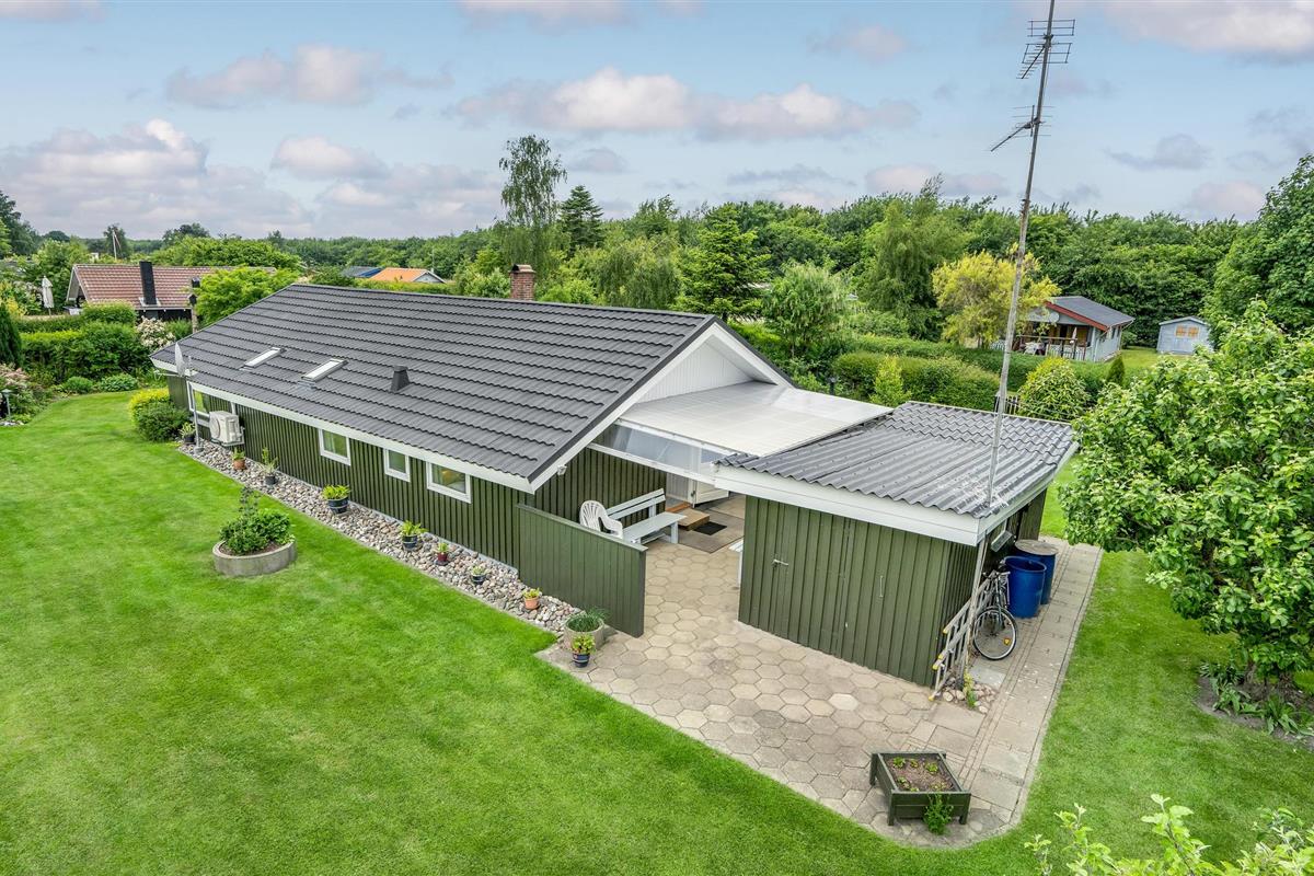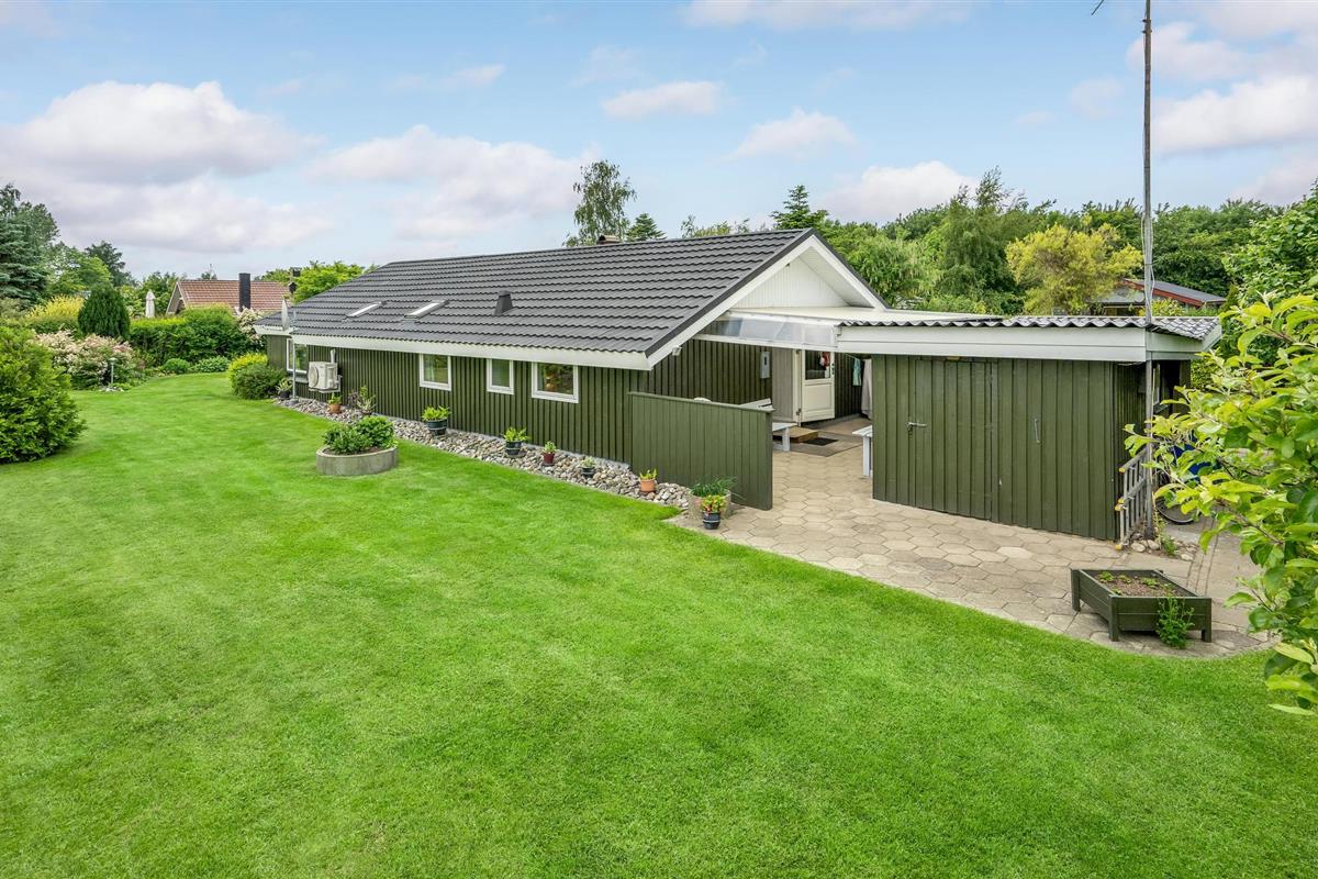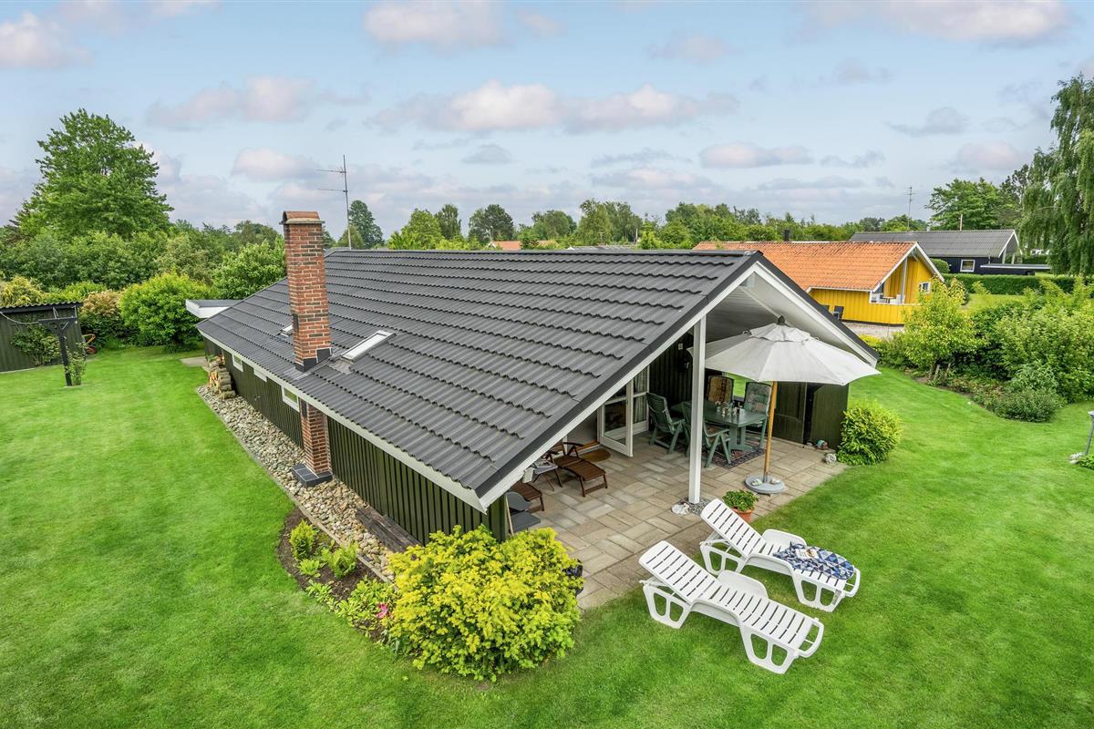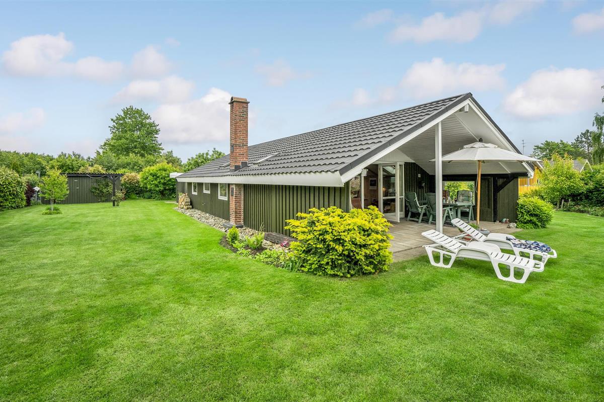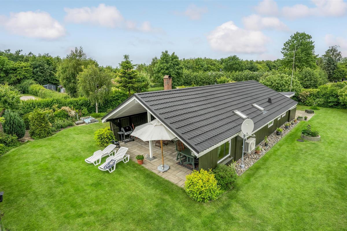Gezellig vakantiehuis nabij Skovmose Strand met ruime tuin, houten terras en prachtig uitzicht op de natuur.