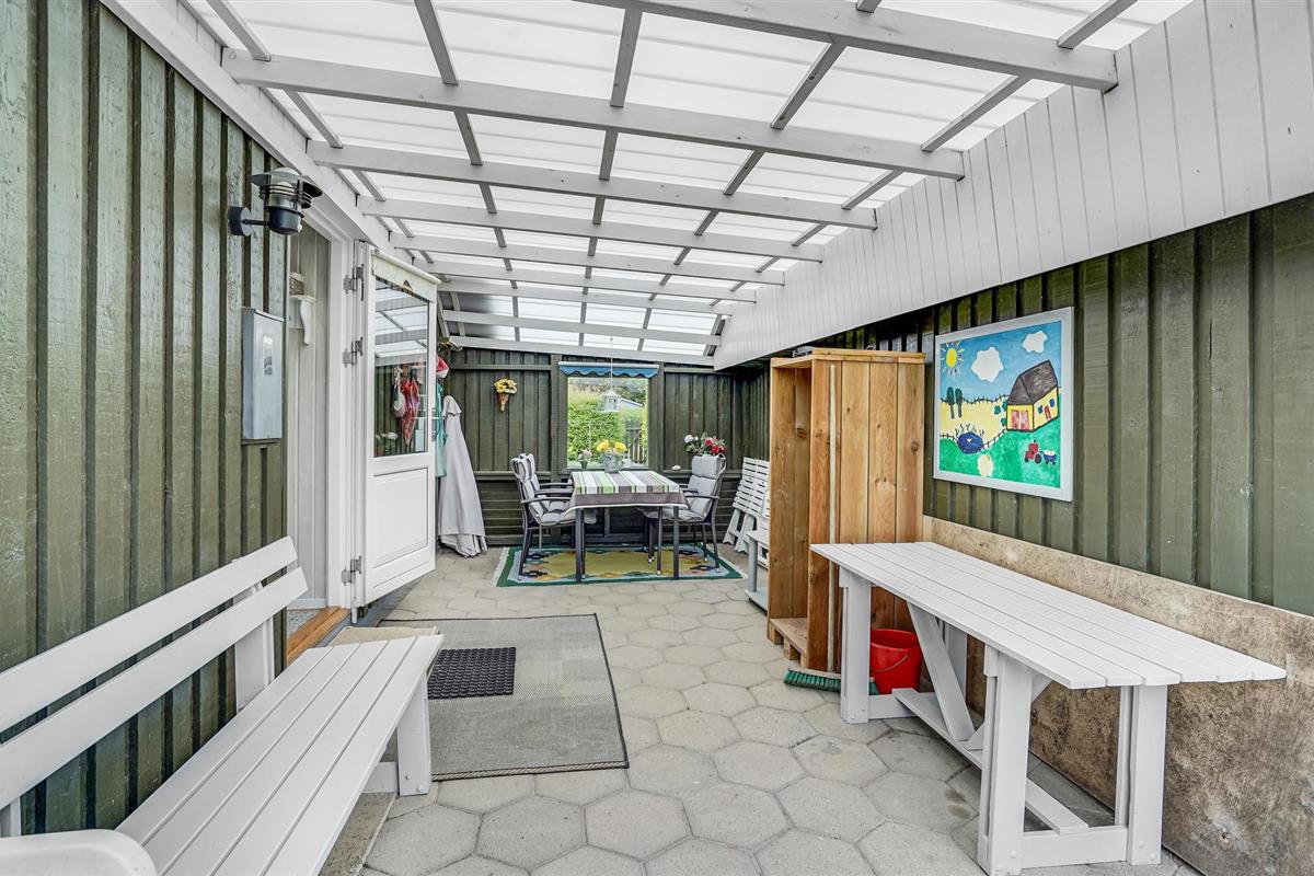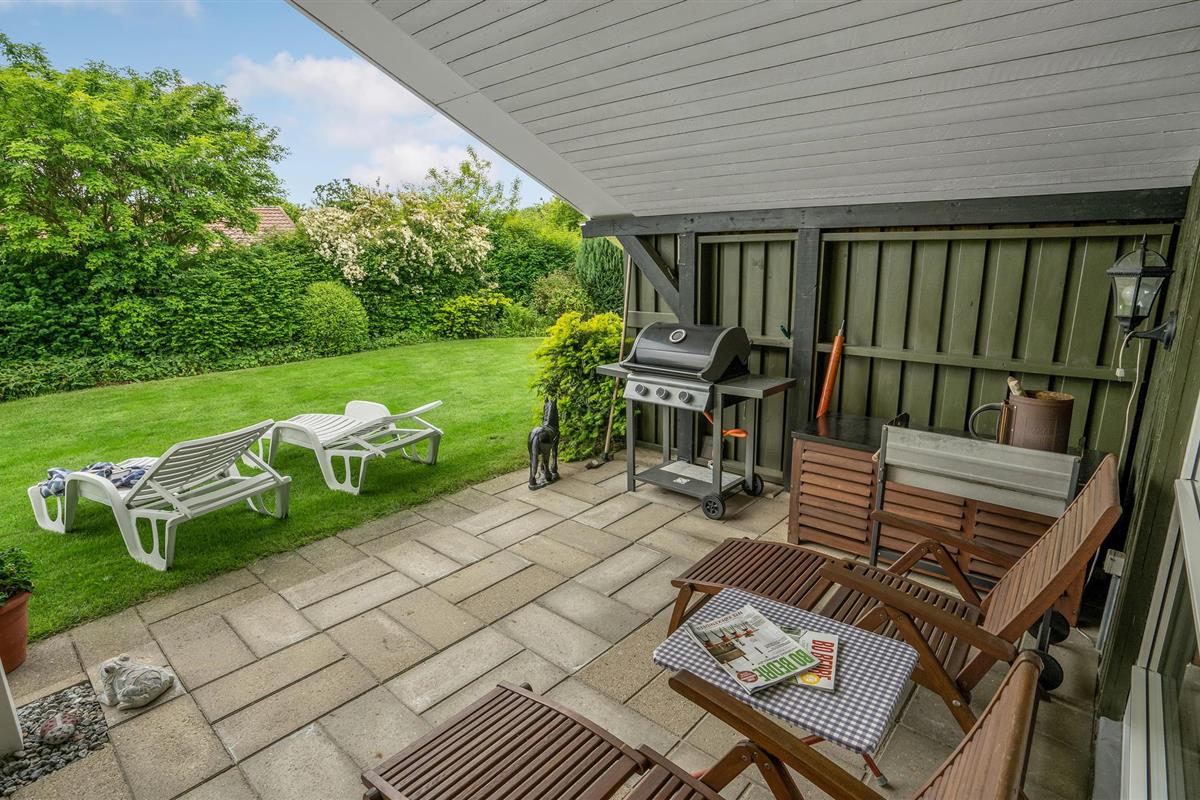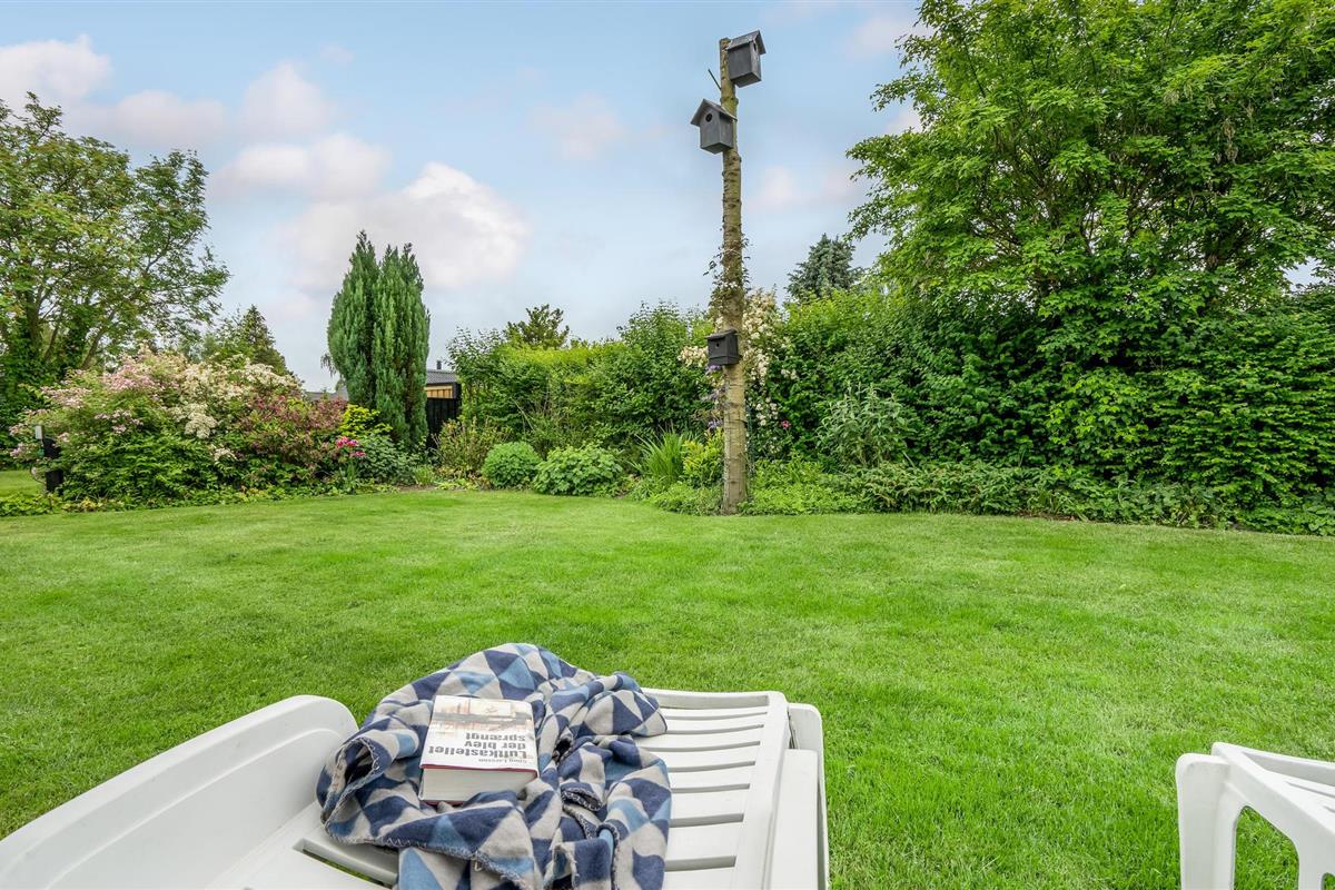 Hier vindt u een ruime en comfortabel ingerichte woonkamer, waarbij de grote ramen u het gevoel geven heel dicht bij de natuur te zijn. U kunt op de bank liggen of u verzamelen rond de eettafel terwijl u geniet van het prachtige uitzicht op de groene tuin. Buiten, op warme zomeravonden, kunt u genieten van uw ochtendkoffie, een goed glas wijn of lekkernijen van de barbecue op het houten terras. De oude bomenpopulatie, zorgt voor een bijzondere privacy in de tuin.