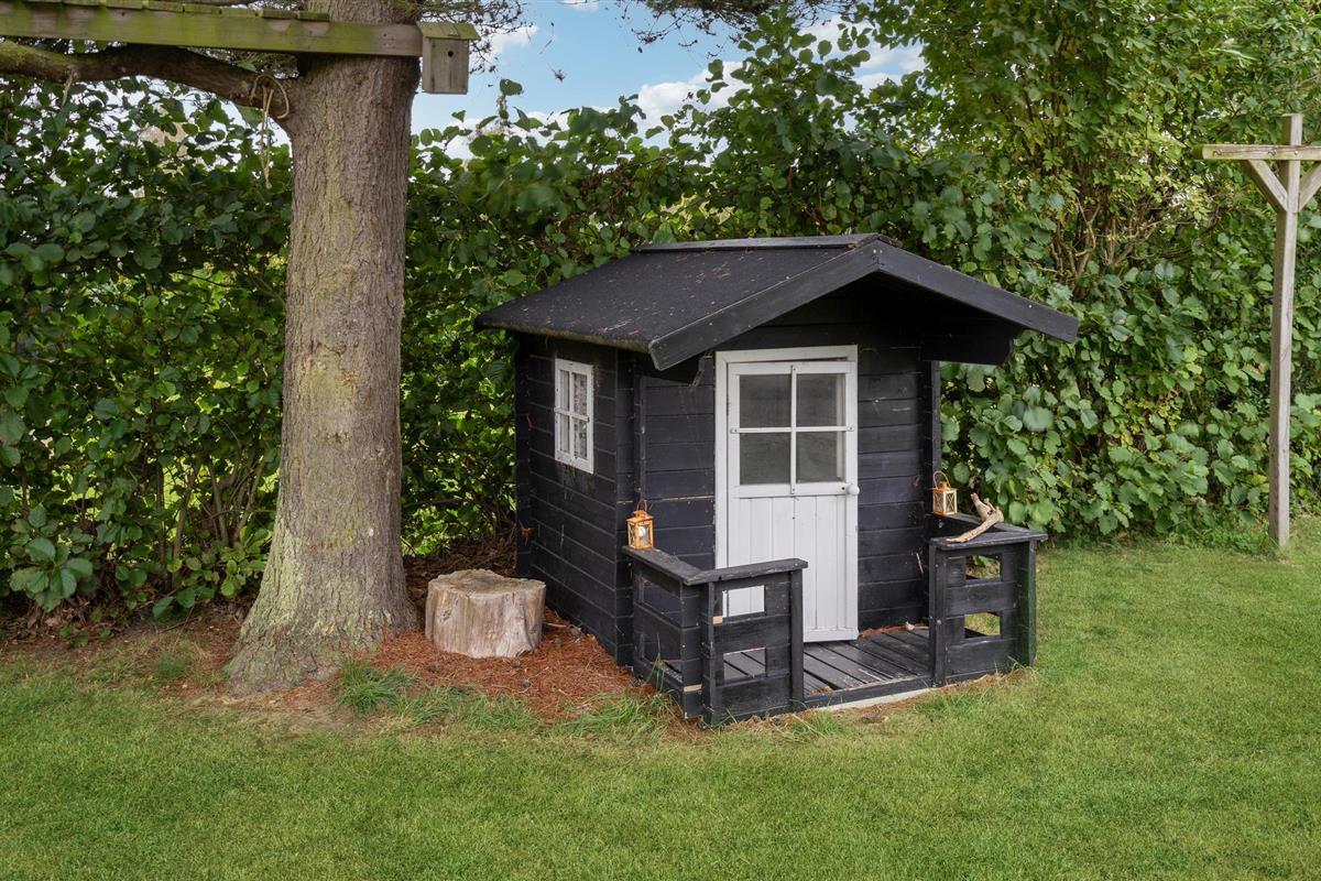 De buitenruimte heeft een ruim, beschut terras dat ideaal is om buiten te eten. Ontspan op het tuinmeubilair en geniet van de frisse lucht onder de parasol. De grote tuin biedt veel ruimte voor kinderen om te spelen en heeft een schommel, een glijbaan en een trampoline. Er is ook een charmant speelhuisje voor de jongere gasten.
