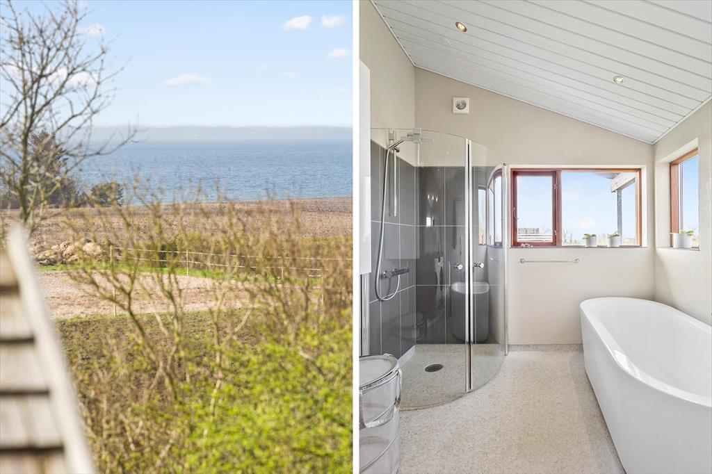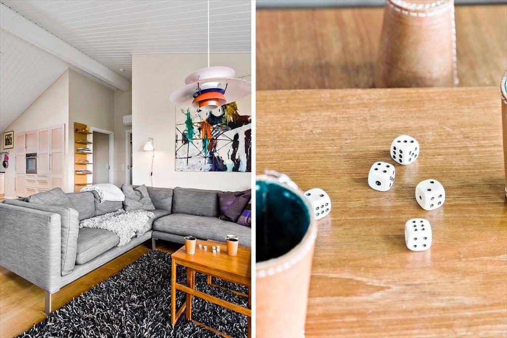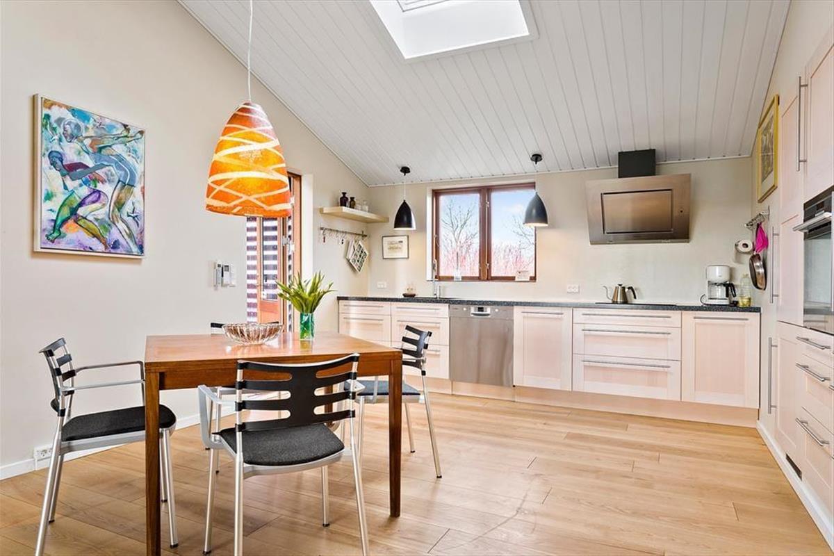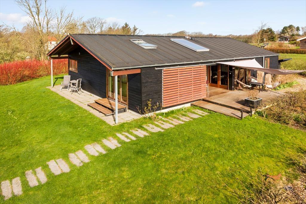 In Skyum Østerstrand befindet sich dieses Luxushaus der Extraklasse. Das Ferienhaus stammt aus dem Jahr 2011, geht dieses Jahr zum ersten Mal in die Vermietung und besteht aus zwei Häusern, die durch einen überdachten Gang mit dunklem Holzfußboden miteinander verbunden sind.