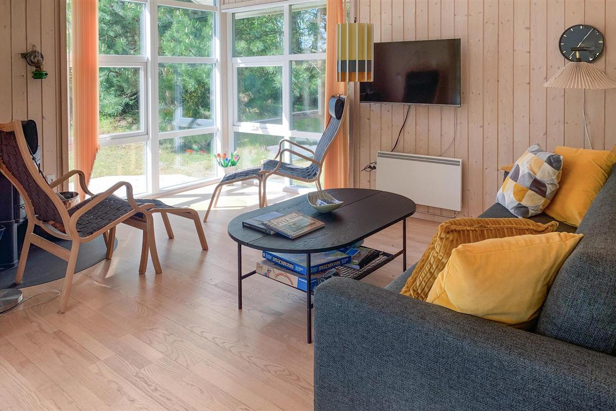 Laat je verwelkomen door de lichtovergoten sfeer van je vakantiehuis en voel meteen de rust van deze bijzondere plek. Het interieur van het huis is vriendelijk en open. De grote raamfronten creëren een bijzondere verbinding tussen binnen en buiten en laten veel daglicht binnen. Ontspan in de gezellige woonkamer, lees een boek of kijk samen een film. De eettafel met uitzicht op de groene omgeving is een heerlijke plek om te eten. In de open keuken kun je elk gerecht bereiden, of je nu ontbijt op het terras of dineert met uitzicht op zee.