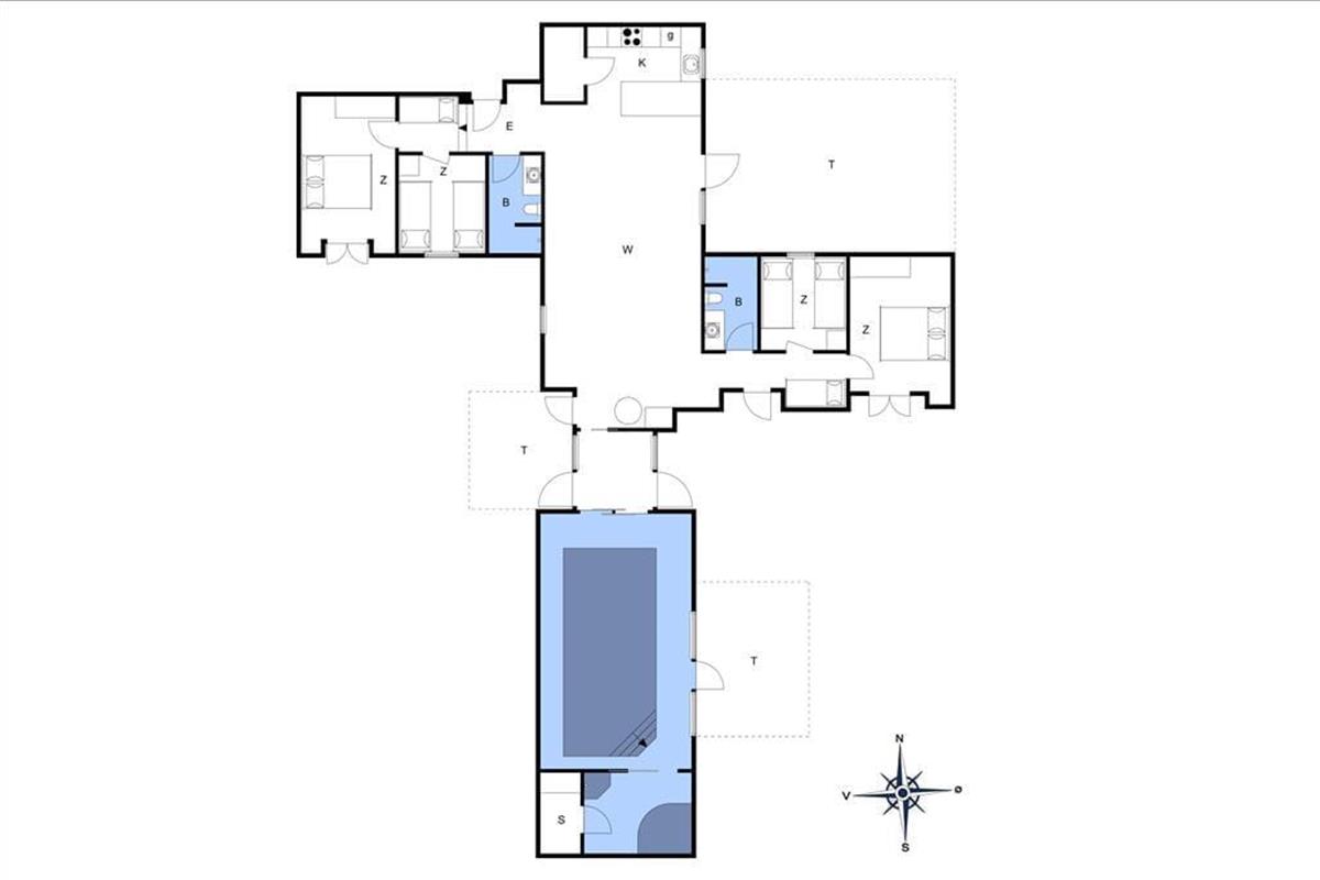 Das Ferienhaus ist mit seinen 171 m² außergewöhnlich geräumig und bietet Platz für acht Personen. Es verfügt über vier Schlafzimmer, die in zwei separate Bereiche aufgeteilt sind – jeweils mit eigenem Badezimmer – was das Haus ideal für zwei Familien macht, die gemeinsam Urlaub verbringen möchten. Der zentrale Treffpunkt des Hauses ist ein großer, hochgeschossiger Wohnraum mit integrierter Küche, Kaminofen und Dachfenstern, die zusätzliches Tageslicht hereinlassen. Hier lässt es sich wunderbar verweilen – mindestens genauso schön ist es jedoch, das gesellige Beisammensein in den angrenzenden Wellnessbereich zu verlegen, wo ihr im 16 m² großen Pool nach Herzenslust planschen könnt. Eine große Fensterfront bietet Blick in den Garten und zum Himmel sowie direkten Zugang zur Terrasse, falls ihr lieber draußen sein möchtet. Angrenzend an den Poolraum befindet sich das dritte Badezimmer des Hauses, das mit Whirlpool und Sauna für entspannende Stunden ausgestattet ist.
