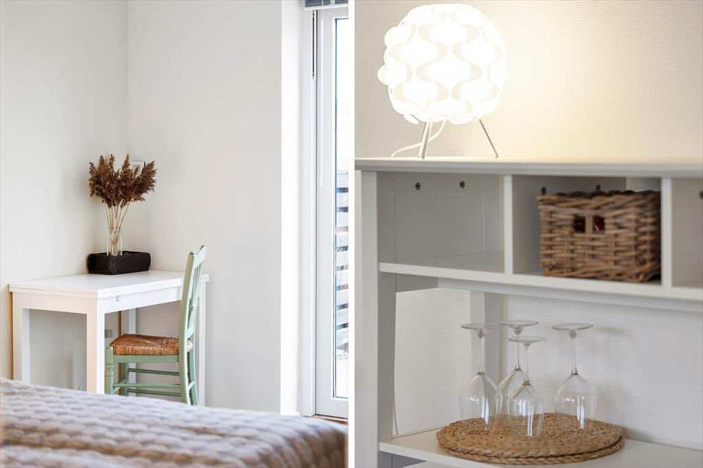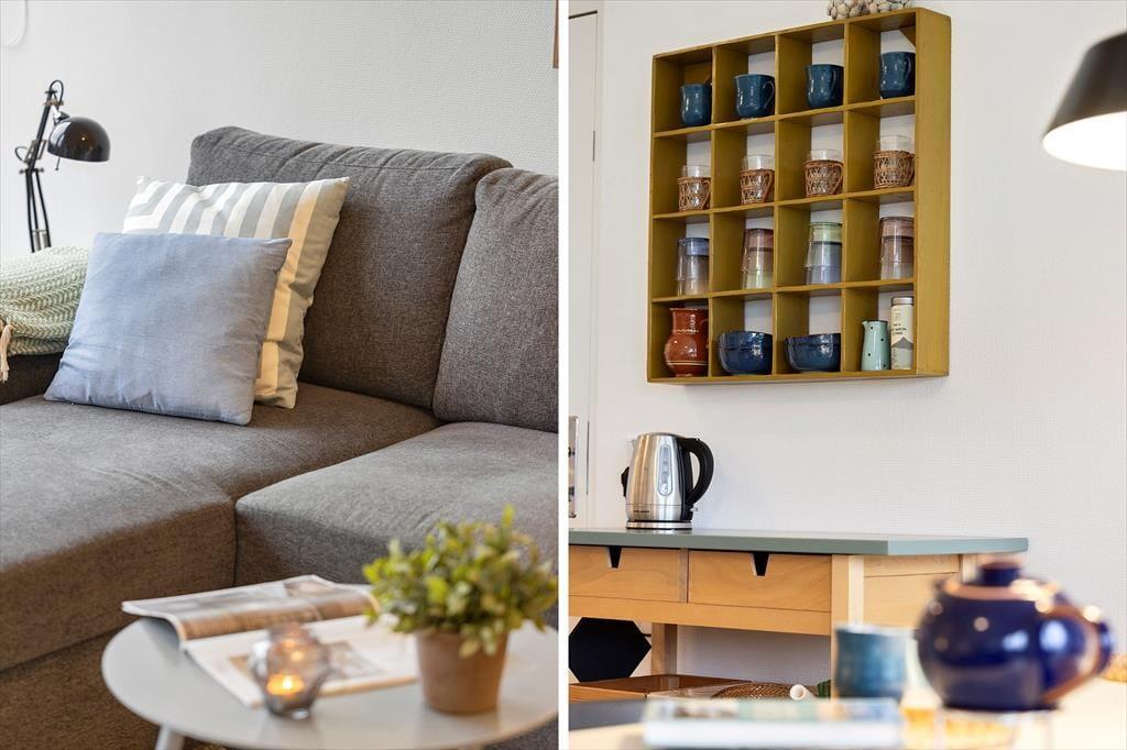 Im Inneren erwartet dich eine helle und moderne Ferienwohnung mit einem stilvollen, schlichten Design. Das Wohnzimmer bildet den natürlichen Mittelpunkt der Wohnung und ist direkt mit der Küche im Eingangsbereich verbunden. Die Küche ist klein, aber praktisch eingerichtet und eignet sich ideal für einfache Ferienmahlzeiten und leichte Küche. Hier findest du alles Notwendige für den täglichen Bedarf – perfekt für alle, die ihre Zeit lieber am Strand oder in den lokalen Restaurants verbringen möchten als mit aufwendigem Kochen. Die Schlafplätze verteilen sich auf ein Doppelbett im Schlafzimmer sowie ein Schlafsofa im Wohnbereich, sodass die Wohnung Platz für bis zu vier Personen bietet. Das Badezimmer ist funktional eingerichtet, mit Waschmaschine ausgestattet und sorgt für einen unkomplizierten und komfortablen Ferienalltag.
