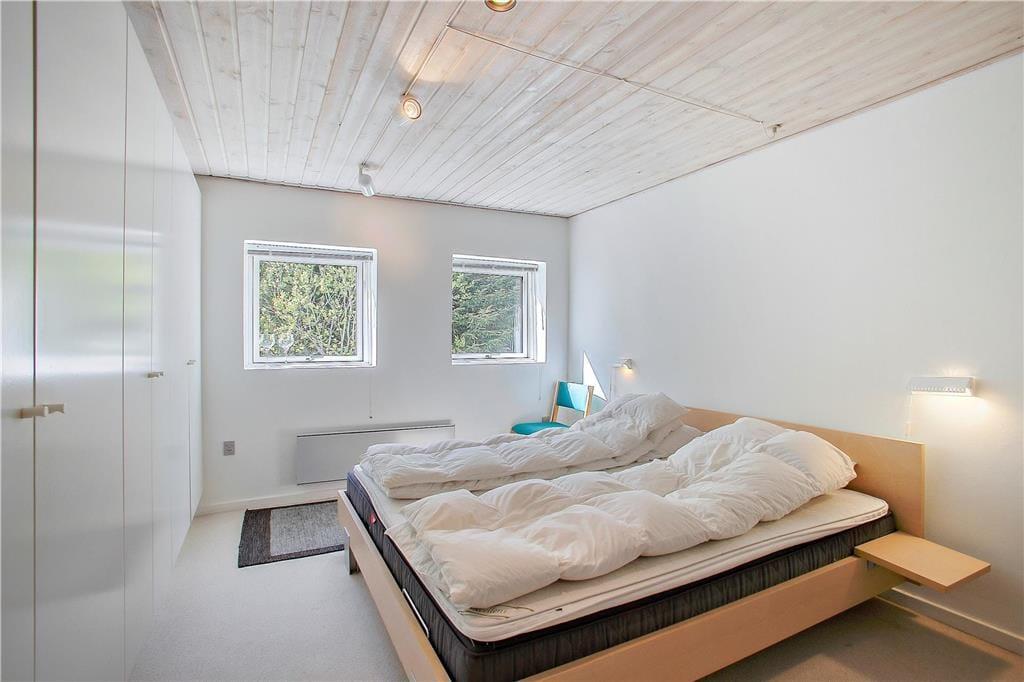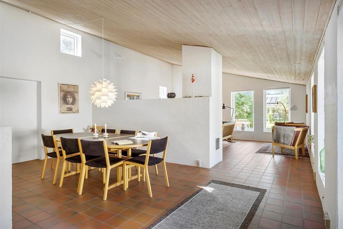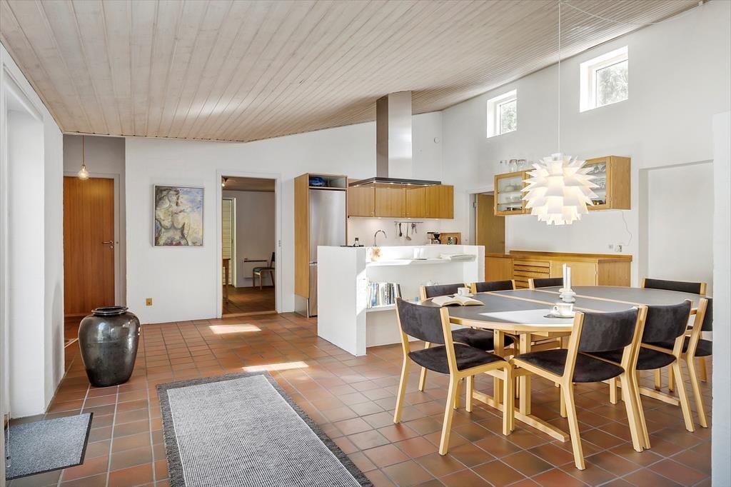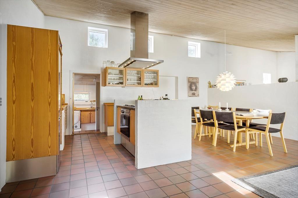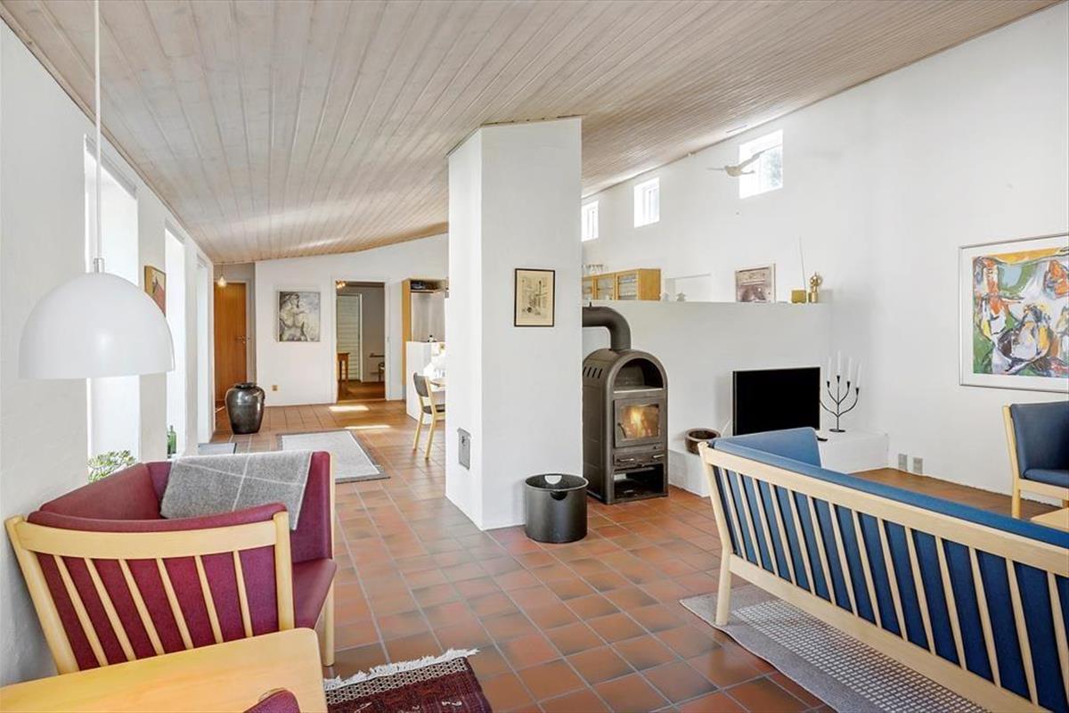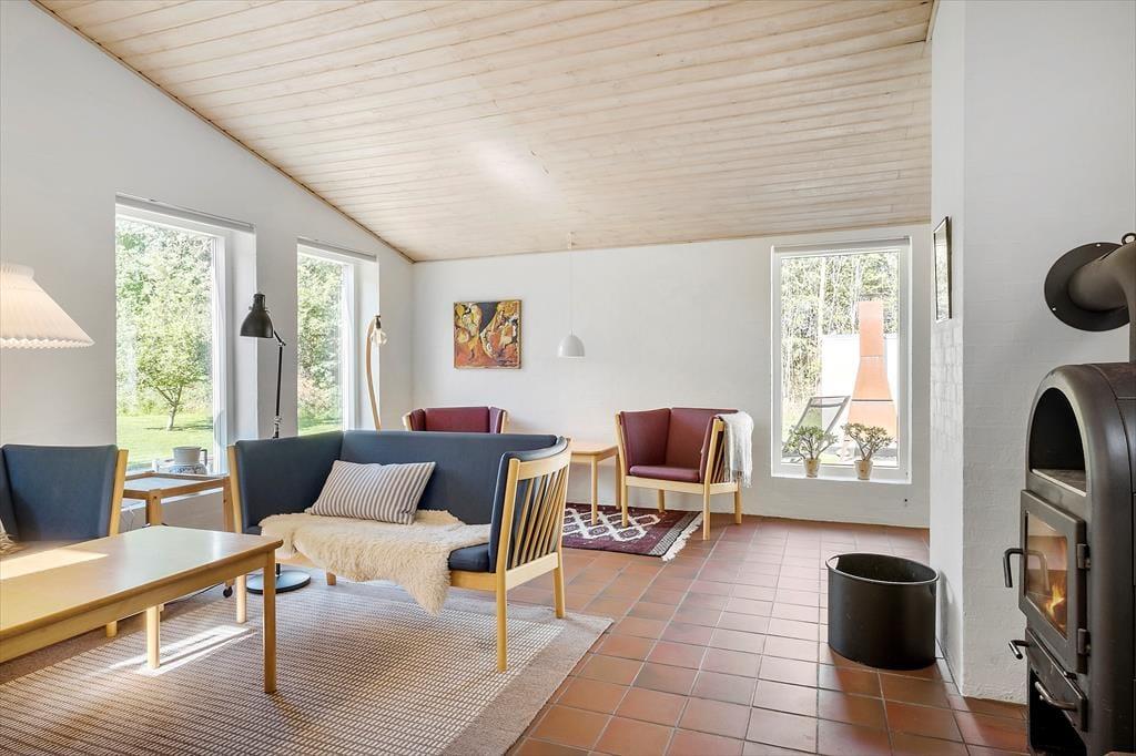 Die interessante 60er Jahre Architektur mit einseitig abfallendem Dach und Fenstern in verschiedenen Größen wirkt sich mit den hohen Decken auf das Raumgefühl aus und bietet eine einladende Atmosphäre im Wohnzimmer. Im Wohnbereich mit Sitzecke, Essbereich und offener Küche ist eine Fußbodenheizung. An kühlen Abenden können Sie auch den Kaminofen anzünden. Darüber hinaus gibt es vier Schlafzimmer mit insgesamt sieben Schlafplätzen, ein Badezimmer und einen Hauswirtschaftsraum.