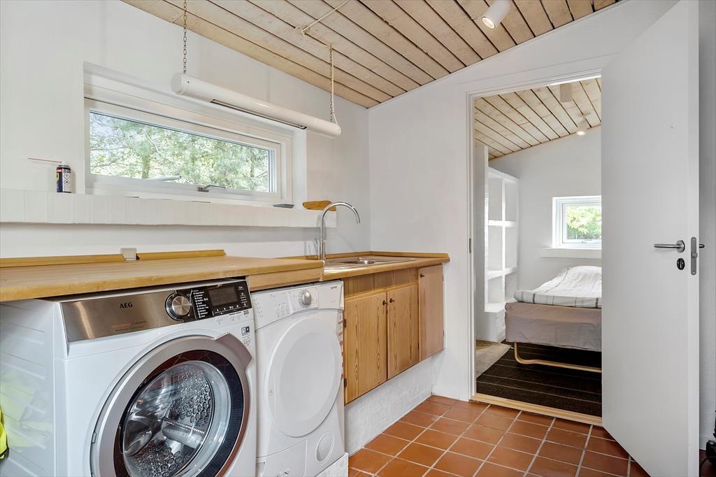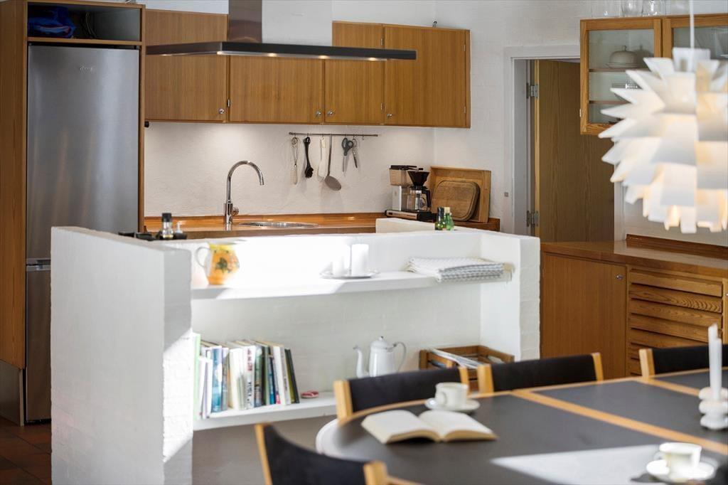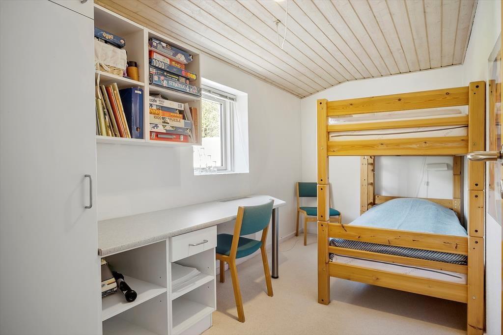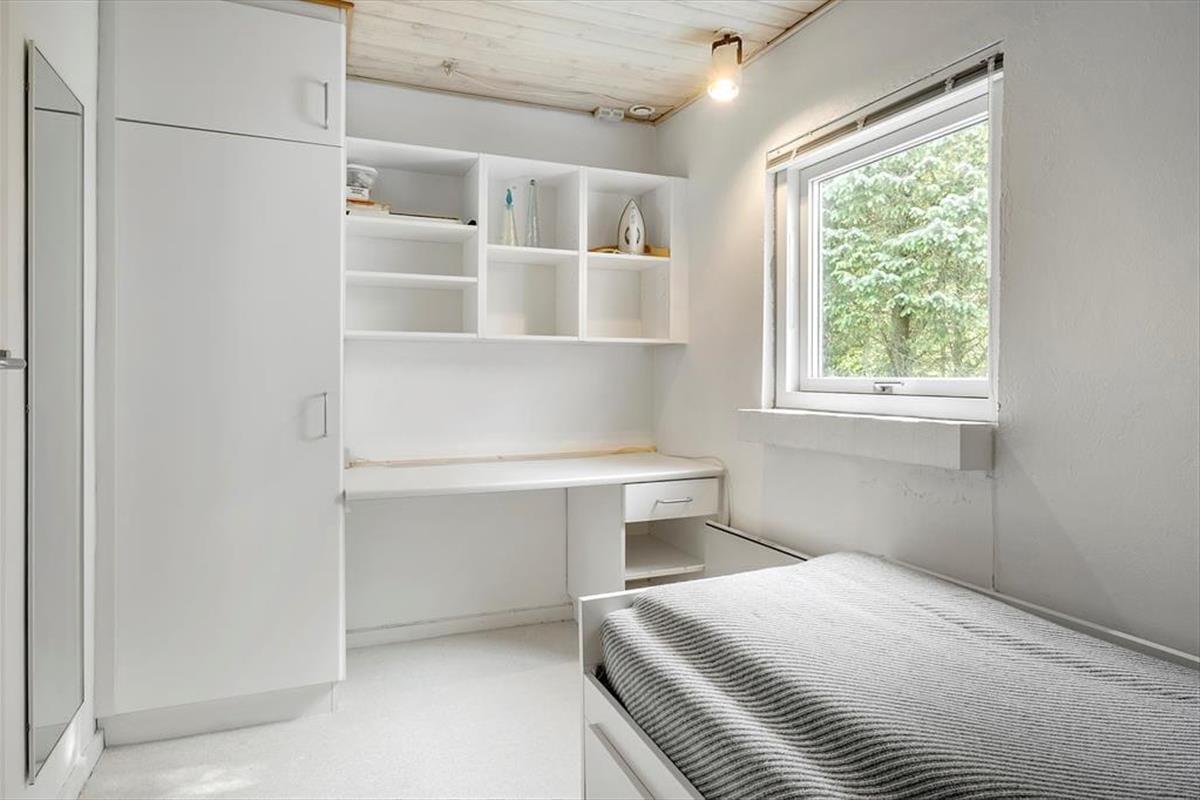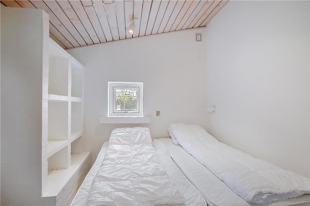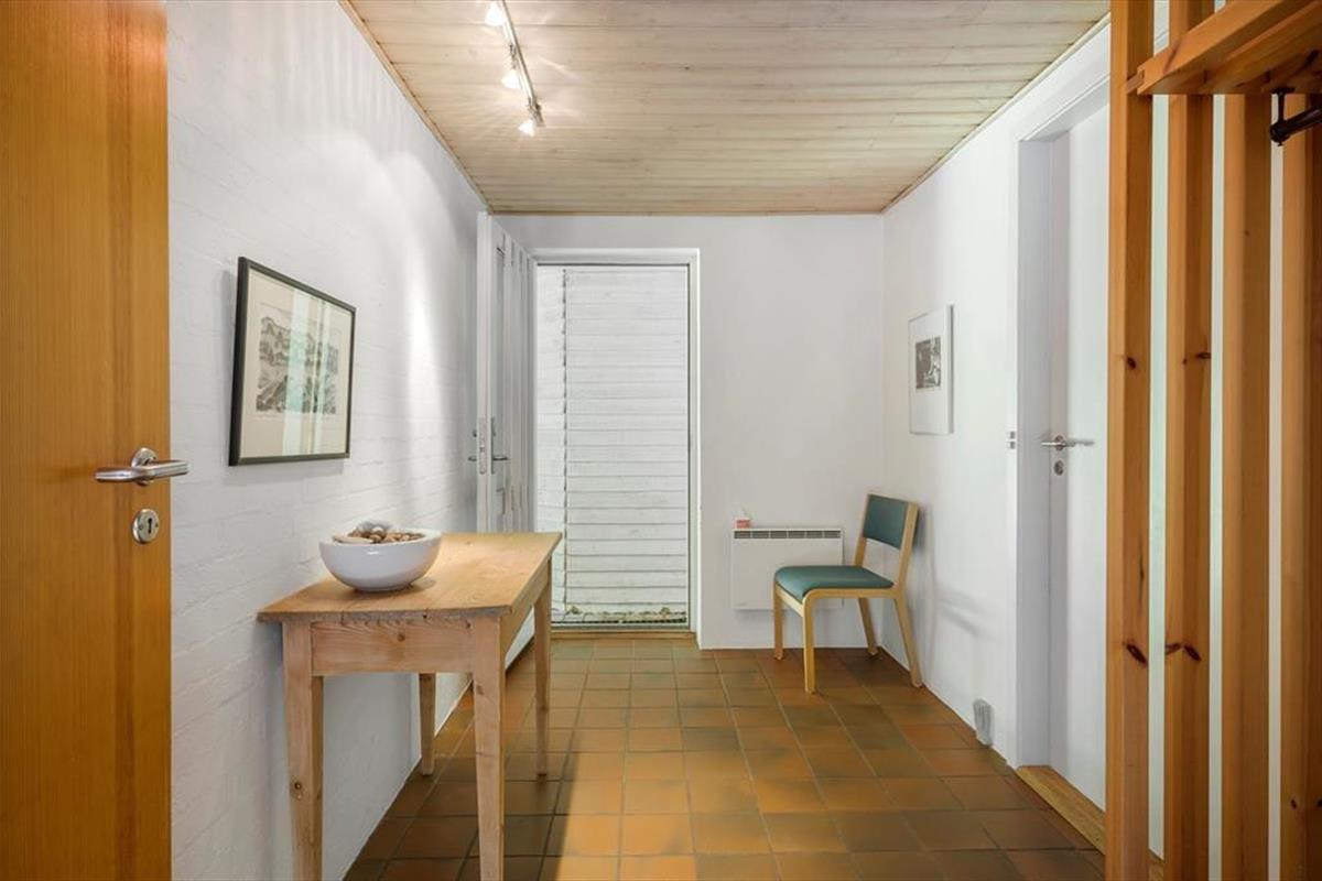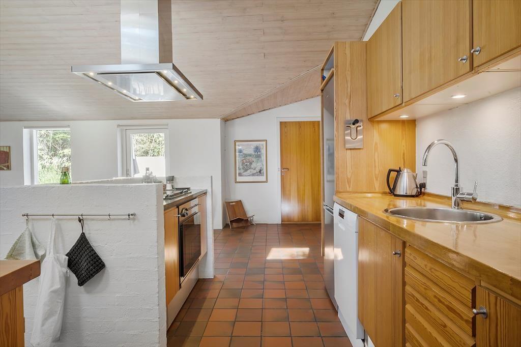 Die interessante 60er Jahre Architektur mit einseitig abfallendem Dach und Fenstern in verschiedenen Größen wirkt sich mit den hohen Decken auf das Raumgefühl aus und bietet eine einladende Atmosphäre im Wohnzimmer. Im Wohnbereich mit Sitzecke, Essbereich und offener Küche ist eine Fußbodenheizung. An kühlen Abenden können Sie auch den Kaminofen anzünden. Darüber hinaus gibt es vier Schlafzimmer mit insgesamt sieben Schlafplätzen, ein Badezimmer und einen Hauswirtschaftsraum.