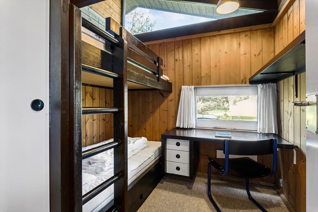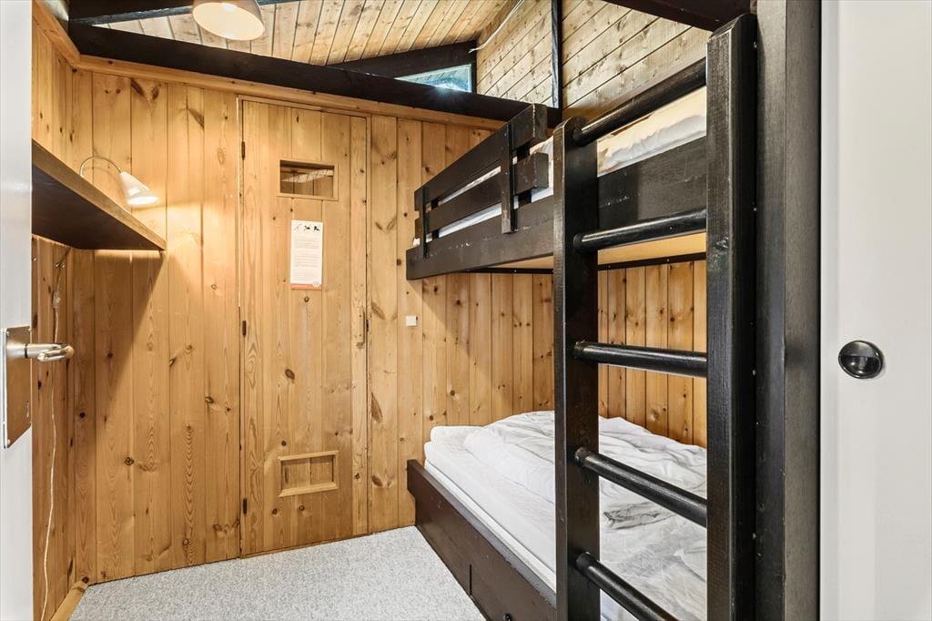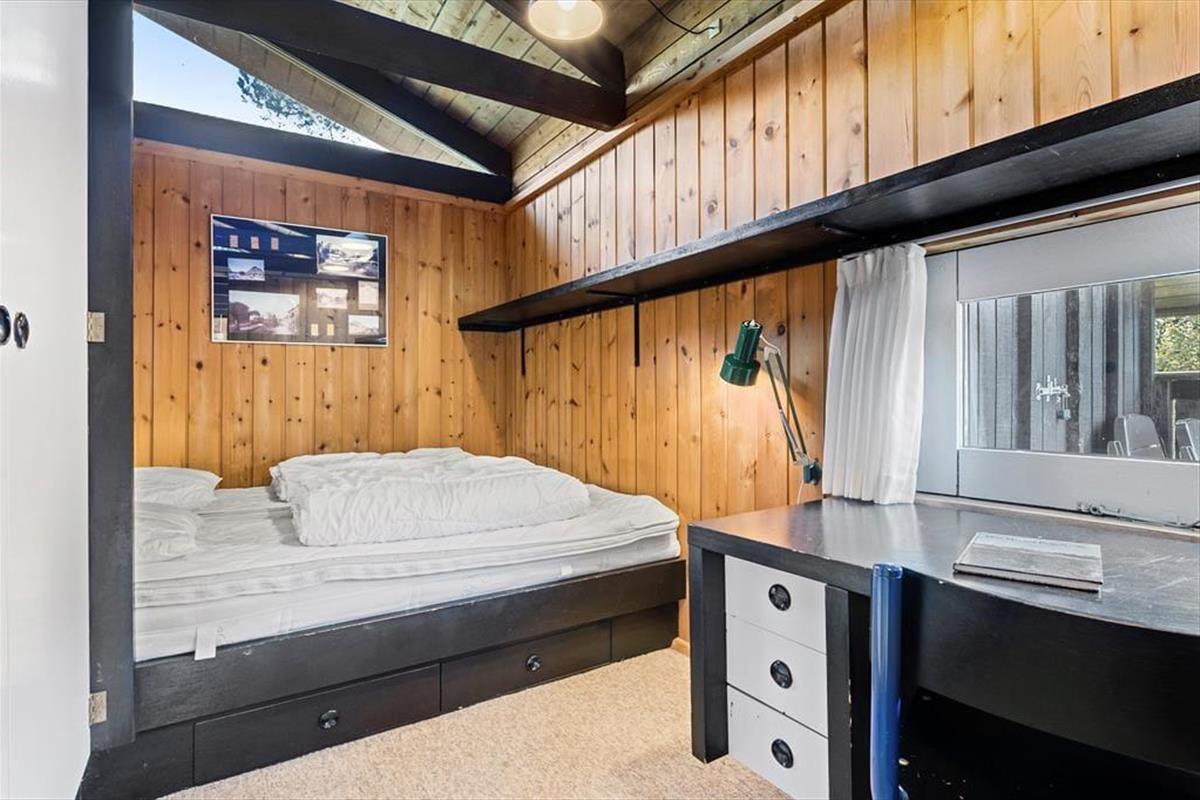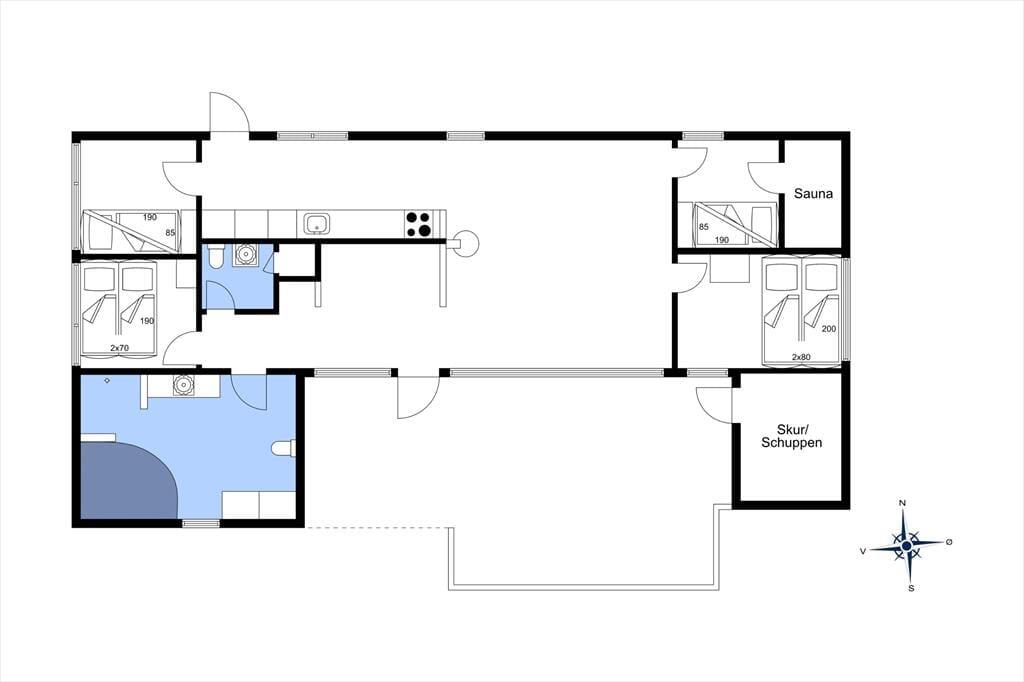 Mit acht Schlafplätzen, verteilt auf jeweils zwei Etagenbetten und zwei Doppelbetten, ist dieses Ferienhaus sehr geräumig und bietet gute Bedingungen für die Familie oder Freunde. In dem großen Wohnzimmer steht selbstverständlich ein Fernseher mit Satellitenprogrammen, Kamin und in der spezialangefertigten Essecke kann die ganze Familie zusammen essen. Die Sauna ist mit einem der Schalfzimmer verbunden und in dem Badezimmer ist einer Whirlpool eingebaut. Außerdem sind hier auch die Waschmaschine und der Trockner untergebracht. Bei der Einrichtung wurde viel Wert auf eine gemütliche Atmosphäre und ein Teil der Funktionalität gelegt, so dass sich große und kleine Feriengäste mit Spielen und Gemütlichkeit beschäftigen können.