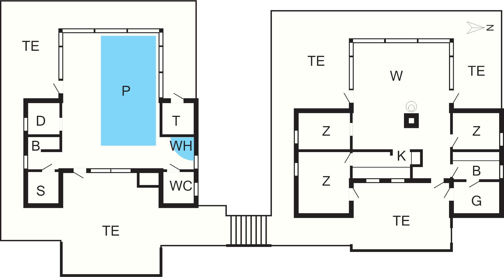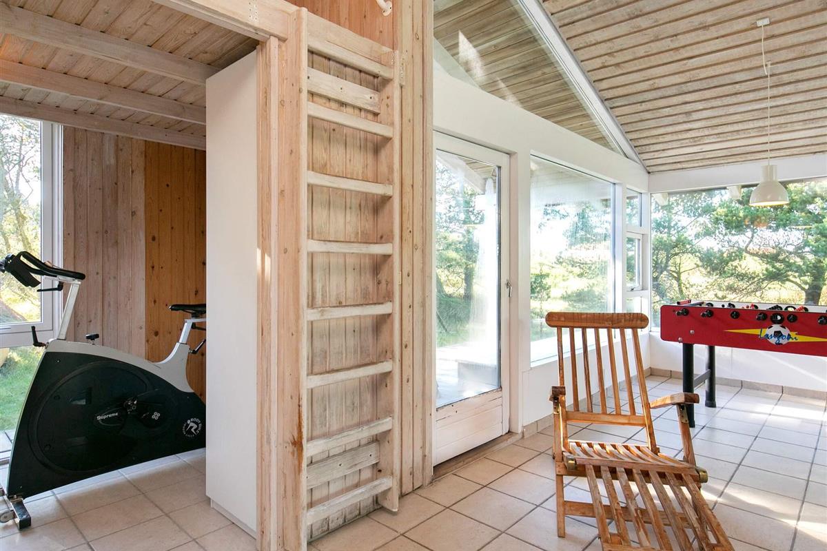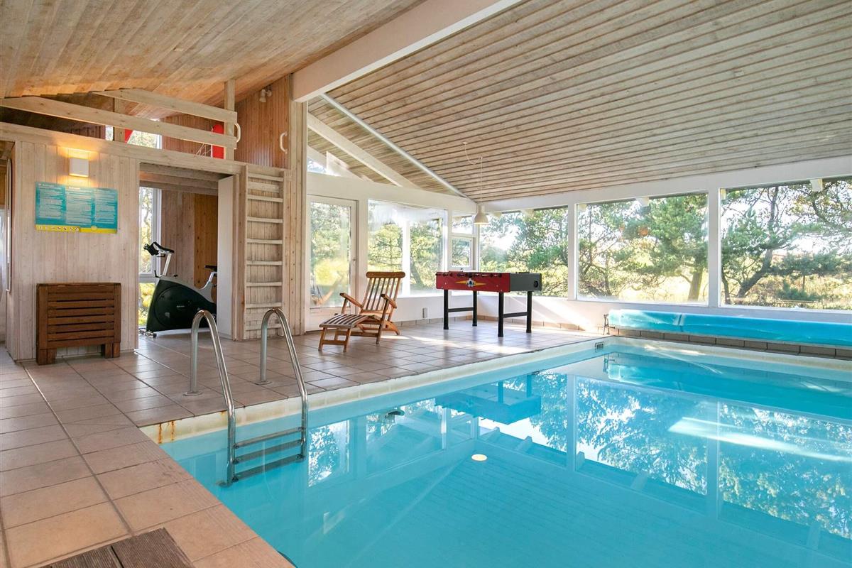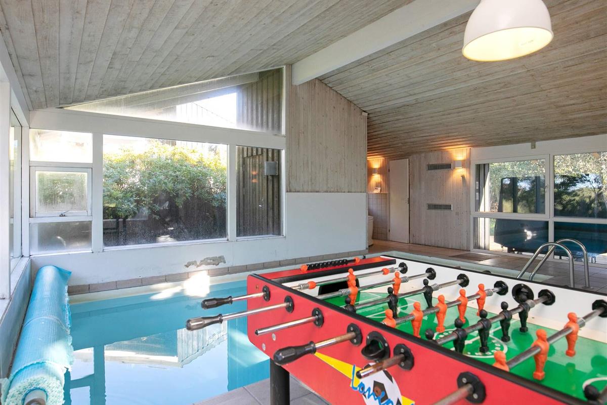 Das Ferienhaus besteht aus zwei separaten Gebäuden, verbunden über eine weitläufige Terrassenfläche. In dem einen Gebäude sind der Swimmingpool, ein Whirlpool und eine Sauna untergebracht. Das Wasser im Pool sowie der Fußboden im Poolbereich werden mit klimafreundlicher Erdwärme geheizt. Im Poolhaus gibt es auch die Möglichkeit Tischkicker zu spielen und im Freien finden Sie eine Tischtennisplatte zum Zeitvertreib.