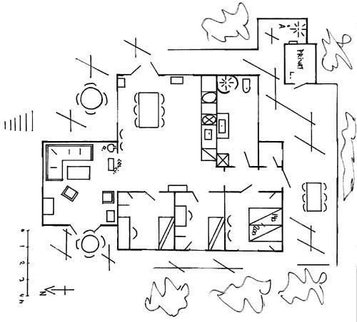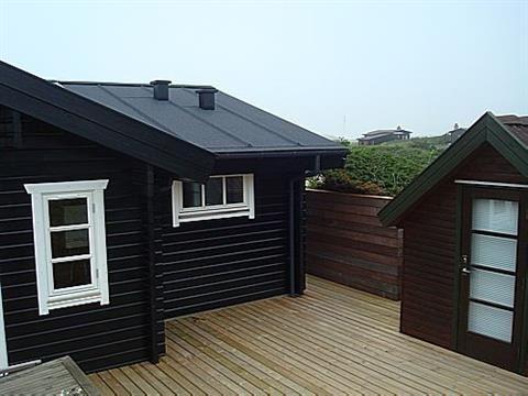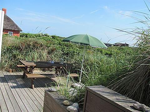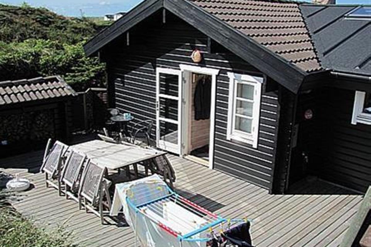 Dette sommerhus er perfekt placeret i mellem klitter og marehalm. Huset ligger på en klit, hvilket betyder at man har en skøn havudsigt fra vinduerne i stuen samt fra terrassen, som er på tre sider af huset. Ude på den store terrasse er der flere forskellige steder, hvor man kan sidde og nyde naturens mange skønne lyde og en god kop kaffe sammen med dem man har kært. Indgangen til sommerhuset er på den sydvendte terrasse, hvor man her har en solgryde. Her er der plads til at man kan solbade eller spille spil med familien, uden nogle afbrydelser fra omverden. Dette er et rigtig hyggeligt sted, hvor der også er læ for vinden. Som et ekstra plus har dette hus et udendørsbrusebad, hvilket er skønt at anvende efter en tur på stranden for at bade eller blot efter en varm dag på terrassen.