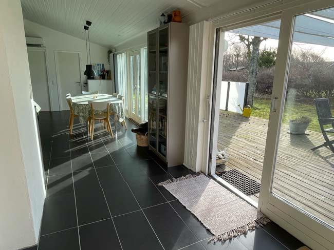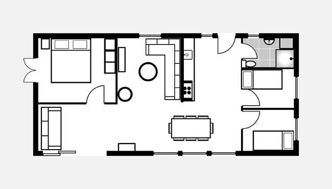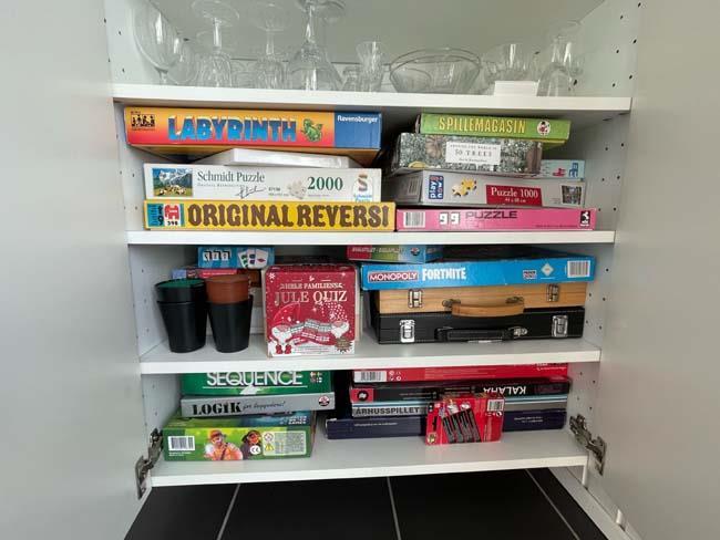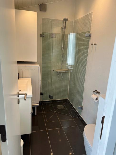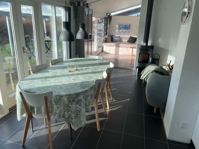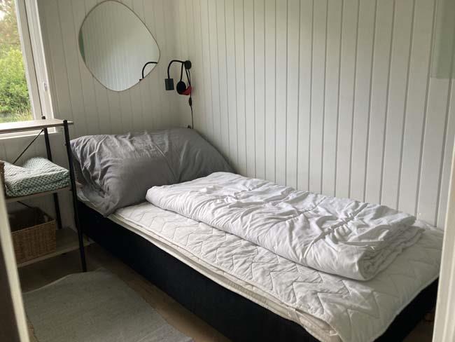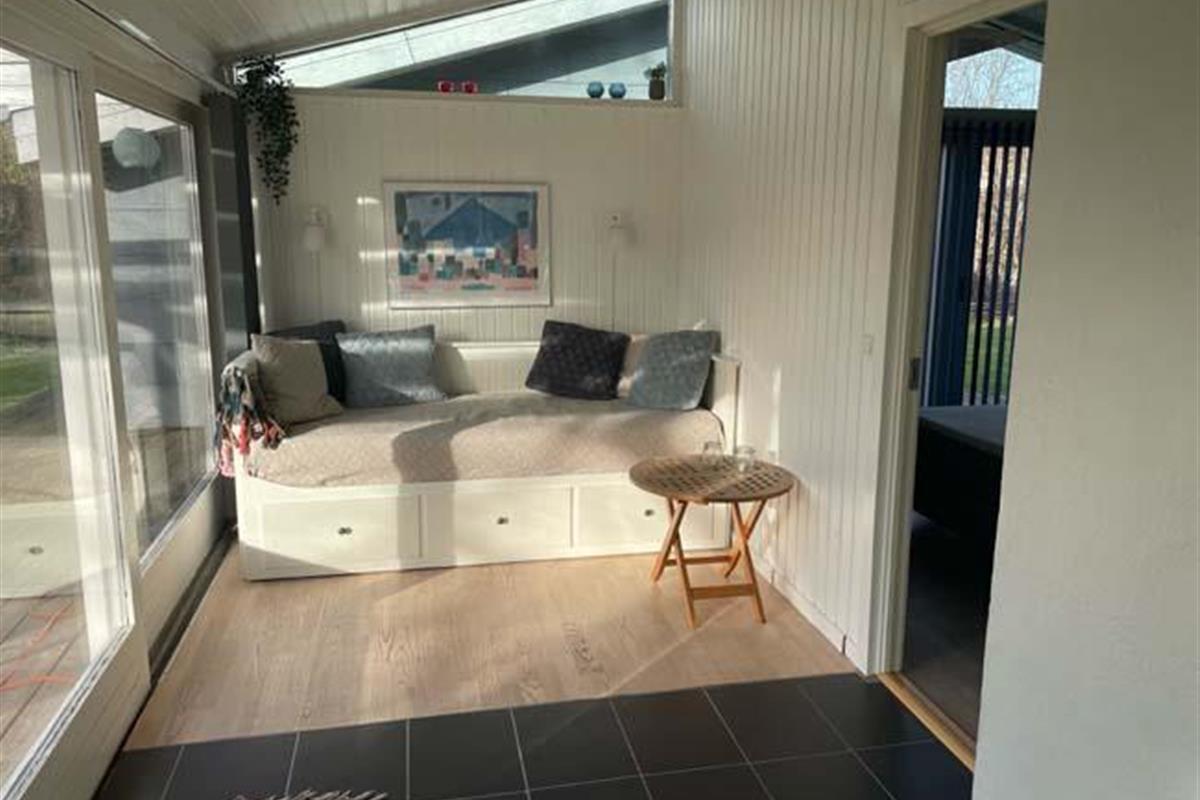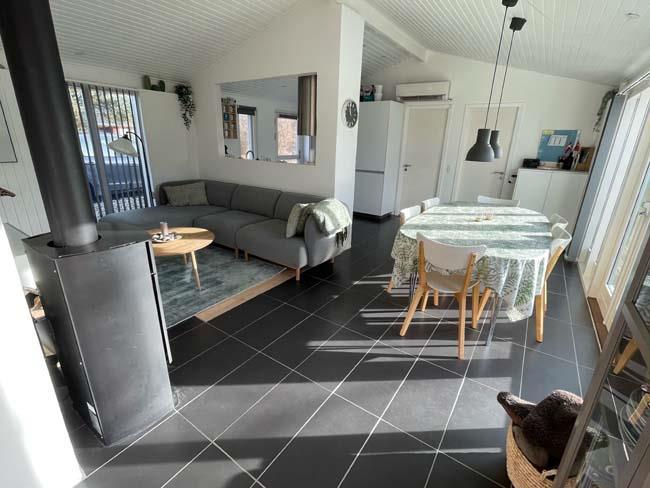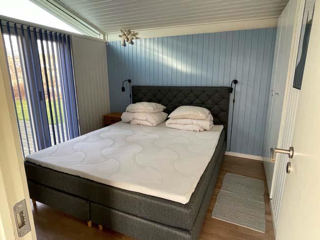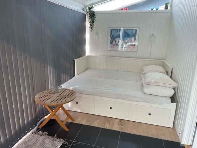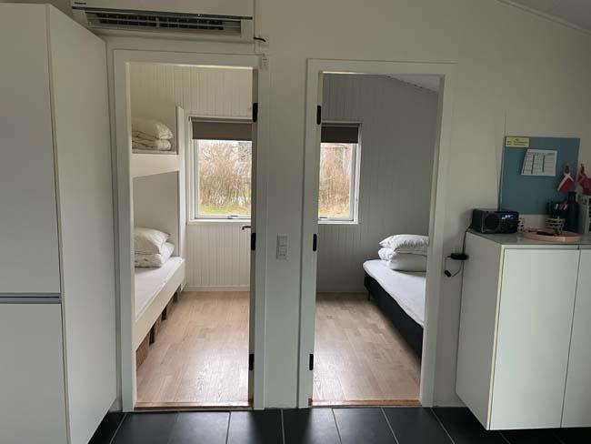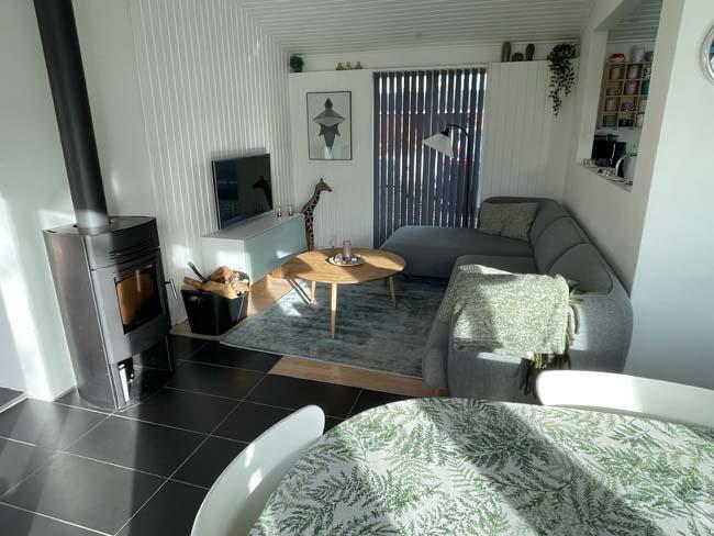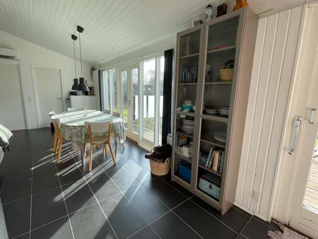 Træder man et lille trin op, møder man det næste hyggested, med bl.a. en dejlig dobb. daybed. Dette er hjørnet for hygge med bøger eller brætspil. Her er der også en stor skydedør ud til den største del af terrassen, som er overdækket. Herude kan familien passende gå direkte fra at have forberedt maden inde i køkkenet og ud på terrassen og grille det. Udover dette skønne køkken alrum, har huset et badeværelse og tre soveværelser. Det ene har en dobbeltseng, det andet har en enkeltseng og det sidste har en køjeseng.
