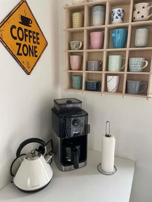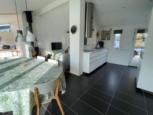 Når man træder ind ad fordøren til dette hus, bliver man mødt af et lyst og lækkert køkkenalrum, som alligevel er delt op i nogle sektioner. Først er køkkenet, som har alle de funktioner der måtte være i et køkken. På den anden side af halvvæggen finder man et sofabord, med to stole og en sofa. Her kan man nyde hinandens nærvær efter en lang dag på stranden eller oppe i skoven. Her er der også et tv, hvilket man faktisk også kan følge med i oppe fra køkkenet af. Ved siden af denne sektion er her et stort spisebord, hvor der er plads til, at hele familien kan samles. I denne afdeling med køkken, spisebord og sofa, er her også en brændeovn, som er med til at skabe den unikke stemning, som man finder i dette hus. For at bryde de hvide moderne linjer, har ejerne valgt at placere et ældre skab og en matchende stol i dette rum, hvilket skaber en perfekt kontrast til det de rene linjer.