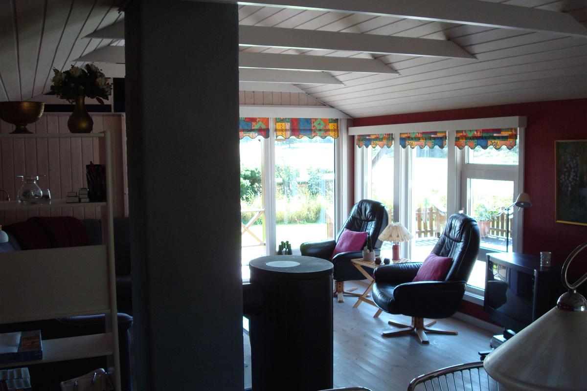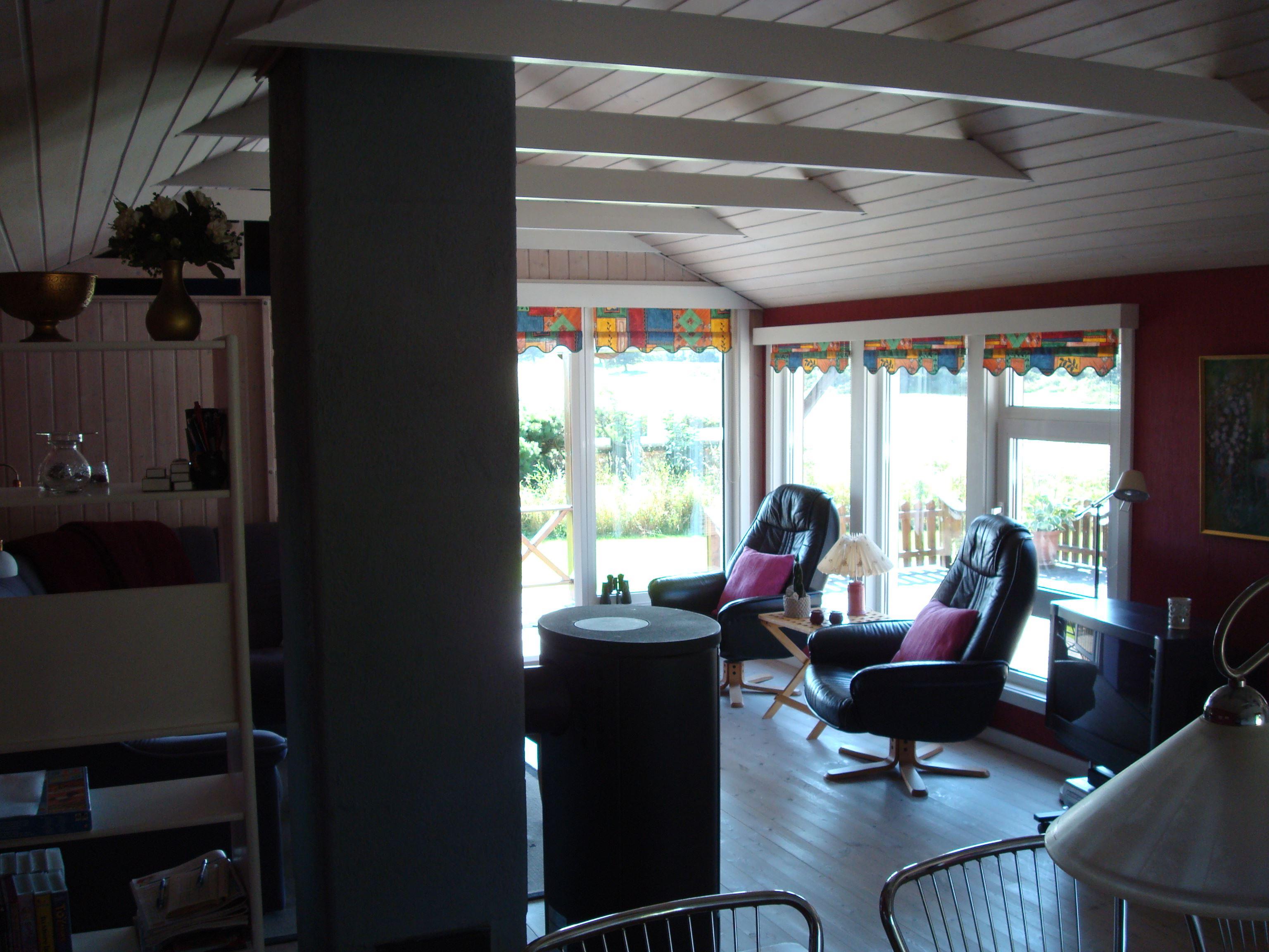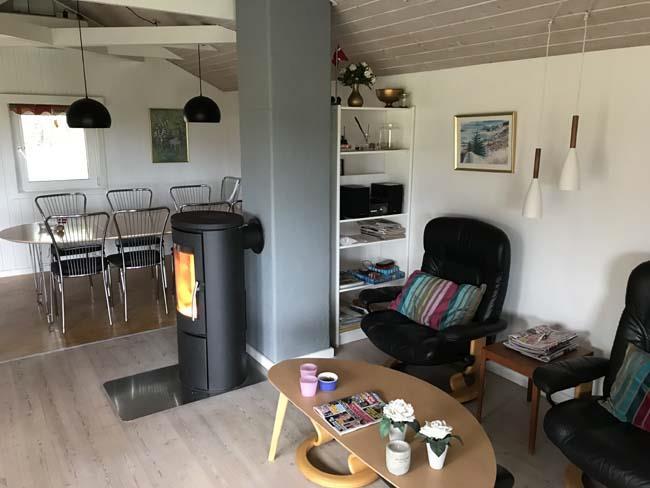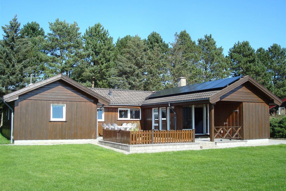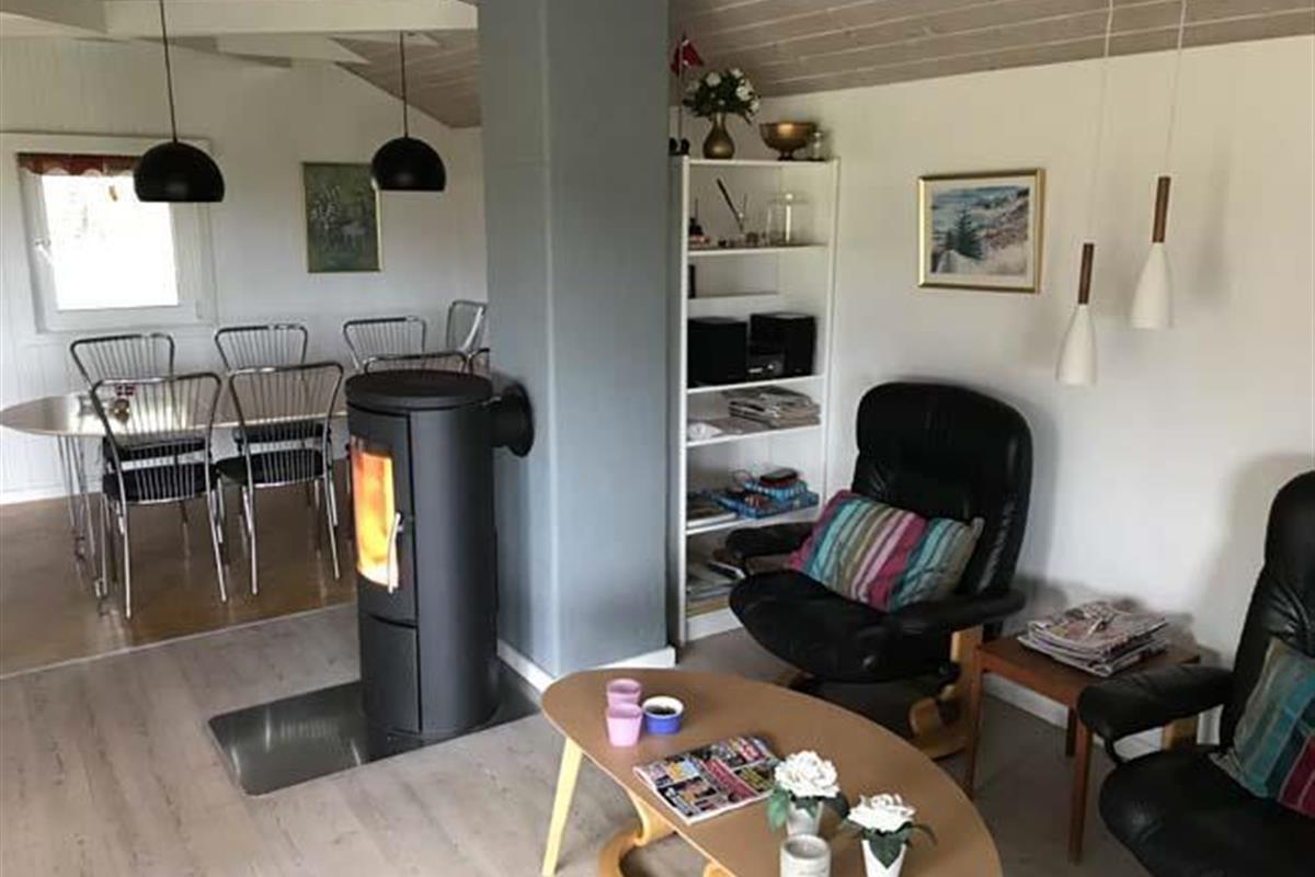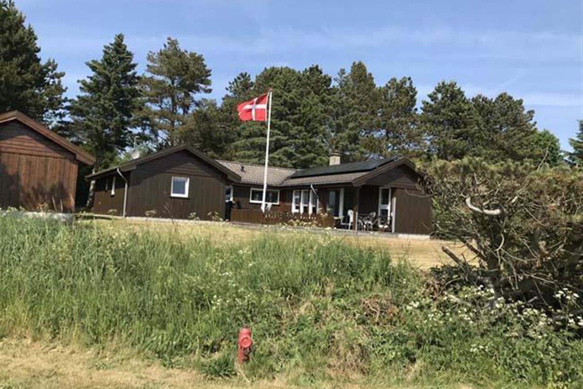 Smukt, hyggeligt og MEGET velholdt sommerhus med storslået udsigt over det kuperede landskab. Huset er bygget i U-form og yder således dejlig læ for vinden, dels når man sidder på den delvis overdækkede terrasse eller fremme i den åbne del. Fra den hyggelige stue, hvor der er trægulv, BRÆNDEOVN, TV m/parabol og 25 kanaler fra stofa. Der er såvel fra spiseafdelingen som sofaen en virkelig SMUK UDSIGT over grunden og de åbne vidder. I det øvrigt meget veludstyrede køkken er der bl.a. OPVASKEMASKINE, microovn, køleskab m/god frysekapacitet. Der er 2 store soveværelser, hvoraf 1 med db. seng (180x200), 1 med 3/4 seng (140x200) og et vær. med 2 overkøjer (70x200) samt en 3/4 seng. Huset har INTERNET, SAUNA, SPA VASKEMASKINE og bruser.- i særskilt rum er toilet og håndvask. - Gulvvarme i badeværelsene. Til terrassen hører: bord, 8 stole, 3 pos. stole, bænk, parasol og grill. - - ligesom der er tænkt på børnerne med SANDKASSE & GYNGER. Dette hus udlejes ikke ungdomsgrupper.