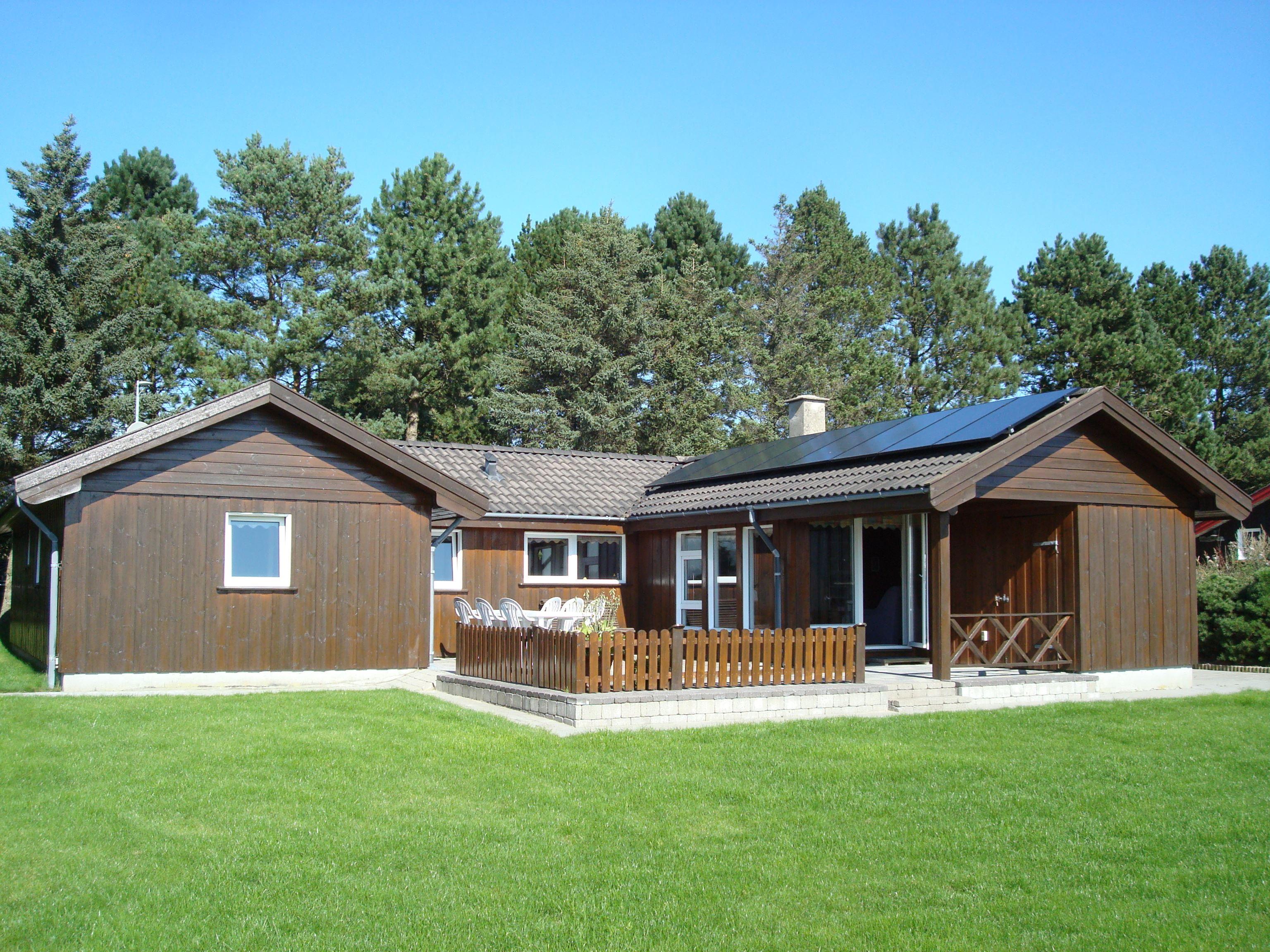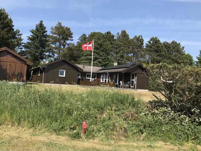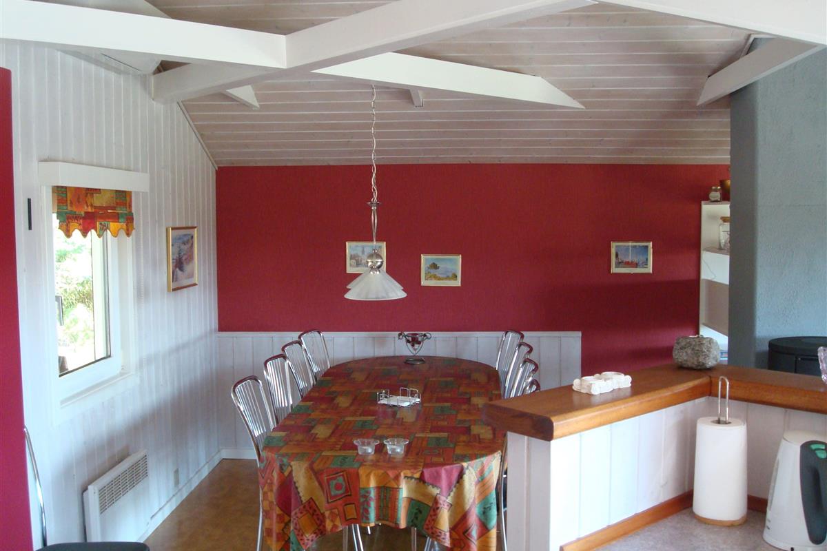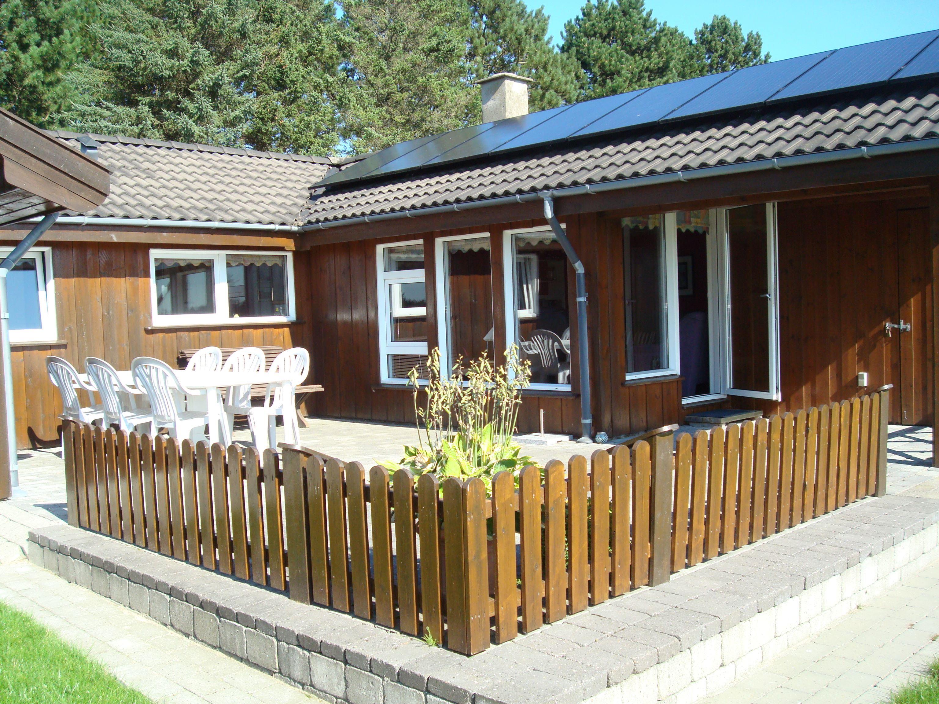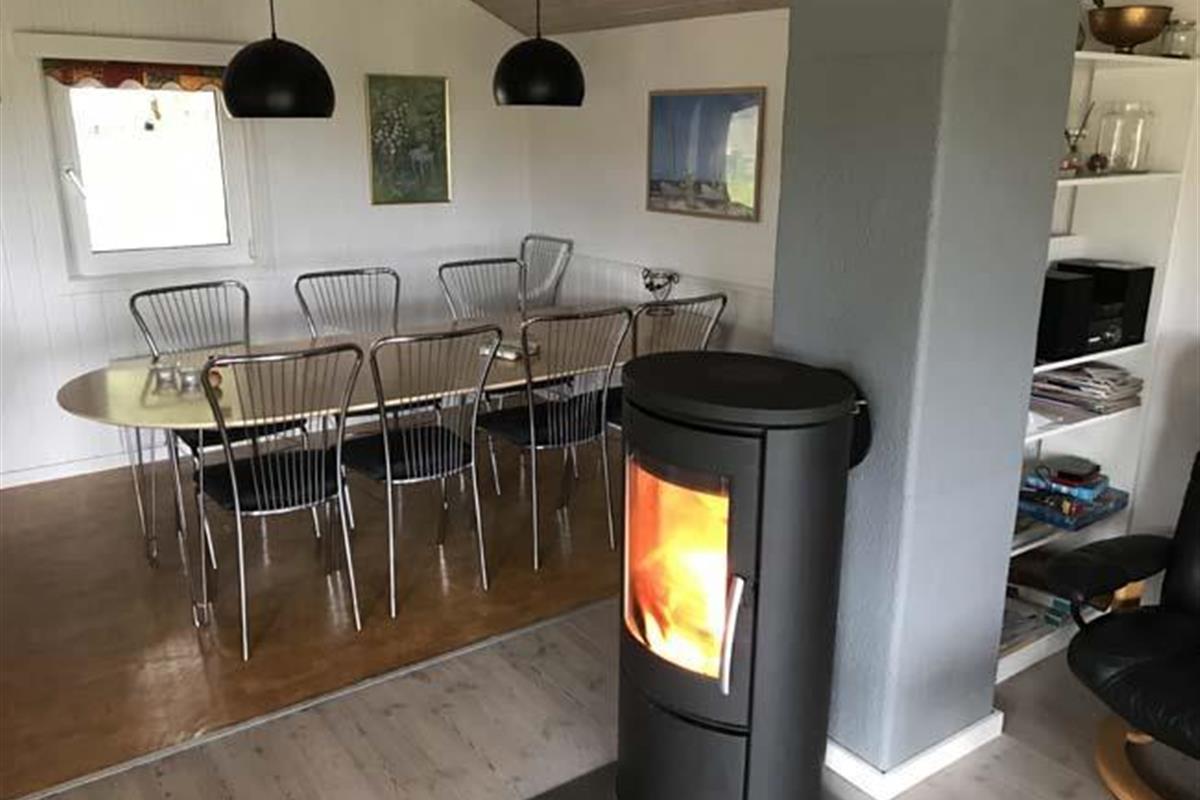 Smukt, hyggeligt og MEGET velholdt sommerhus med storslået udsigt over det kuperede landskab. Huset er bygget i U-form og yder således dejlig læ for vinden, dels når man sidder på den delvis overdækkede terrasse eller fremme i den åbne del. Fra den hyggelige stue, hvor der er trægulv, BRÆNDEOVN, TV m/parabol og 25 kanaler fra stofa. Der er såvel fra spiseafdelingen som sofaen en virkelig SMUK UDSIGT over grunden og de åbne vidder. I det øvrigt meget veludstyrede køkken er der bl.a. OPVASKEMASKINE, microovn, køleskab m/god frysekapacitet. Der er 2 store soveværelser, hvoraf 1 med db. seng (180x200), 1 med 3/4 seng (140x200) og et vær. med 2 overkøjer (70x200) samt en 3/4 seng. Huset har INTERNET, SAUNA, SPA VASKEMASKINE og bruser.- i særskilt rum er toilet og håndvask. - Gulvvarme i badeværelsene. Til terrassen hører: bord, 8 stole, 3 pos. stole, bænk, parasol og grill. - - ligesom der er tænkt på børnerne med SANDKASSE & GYNGER. Dette hus udlejes ikke ungdomsgrupper.