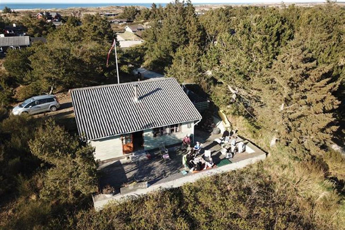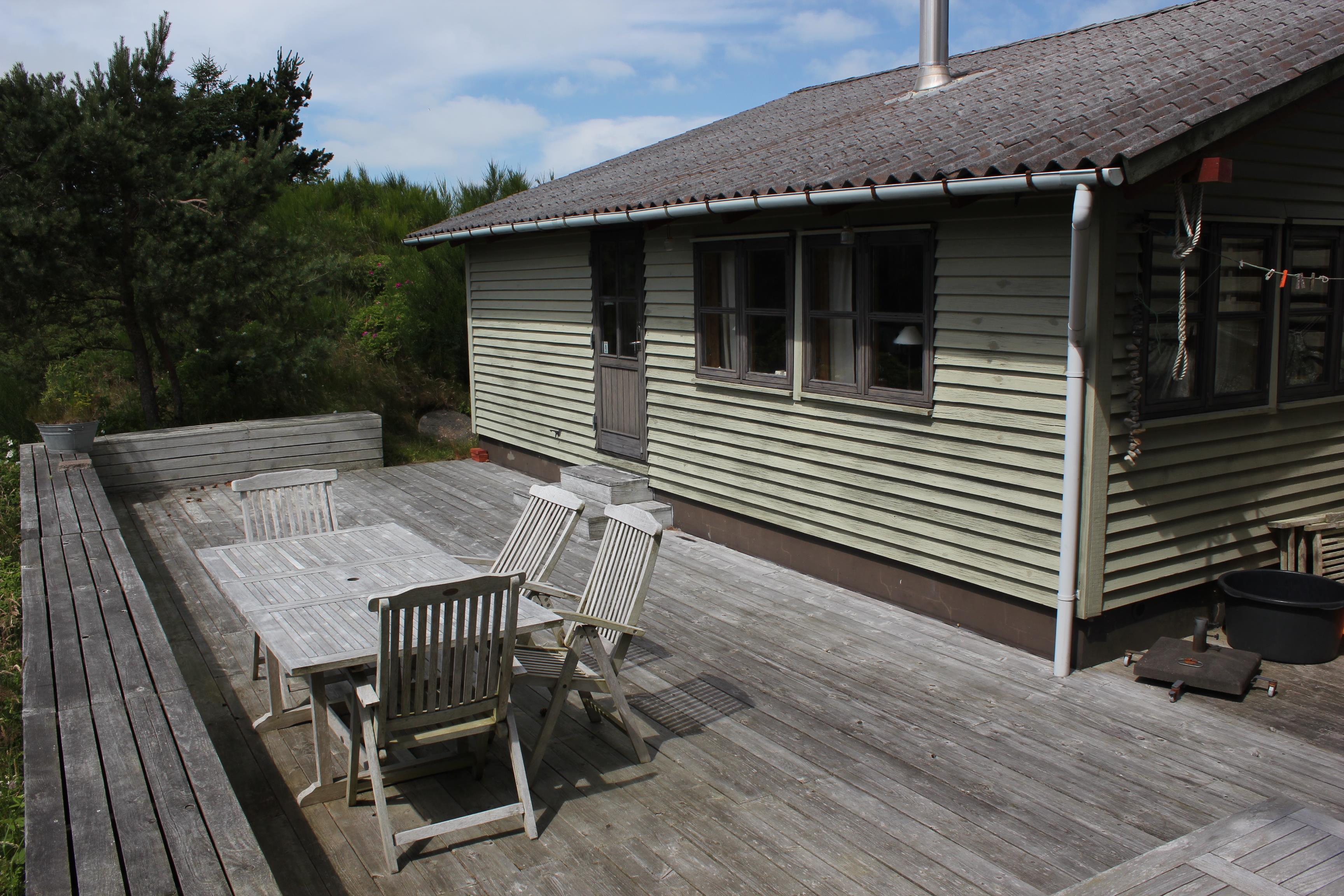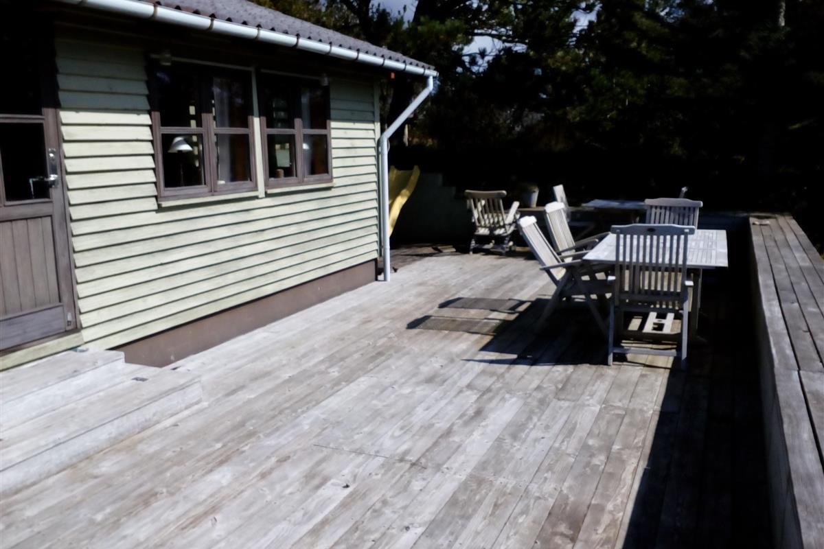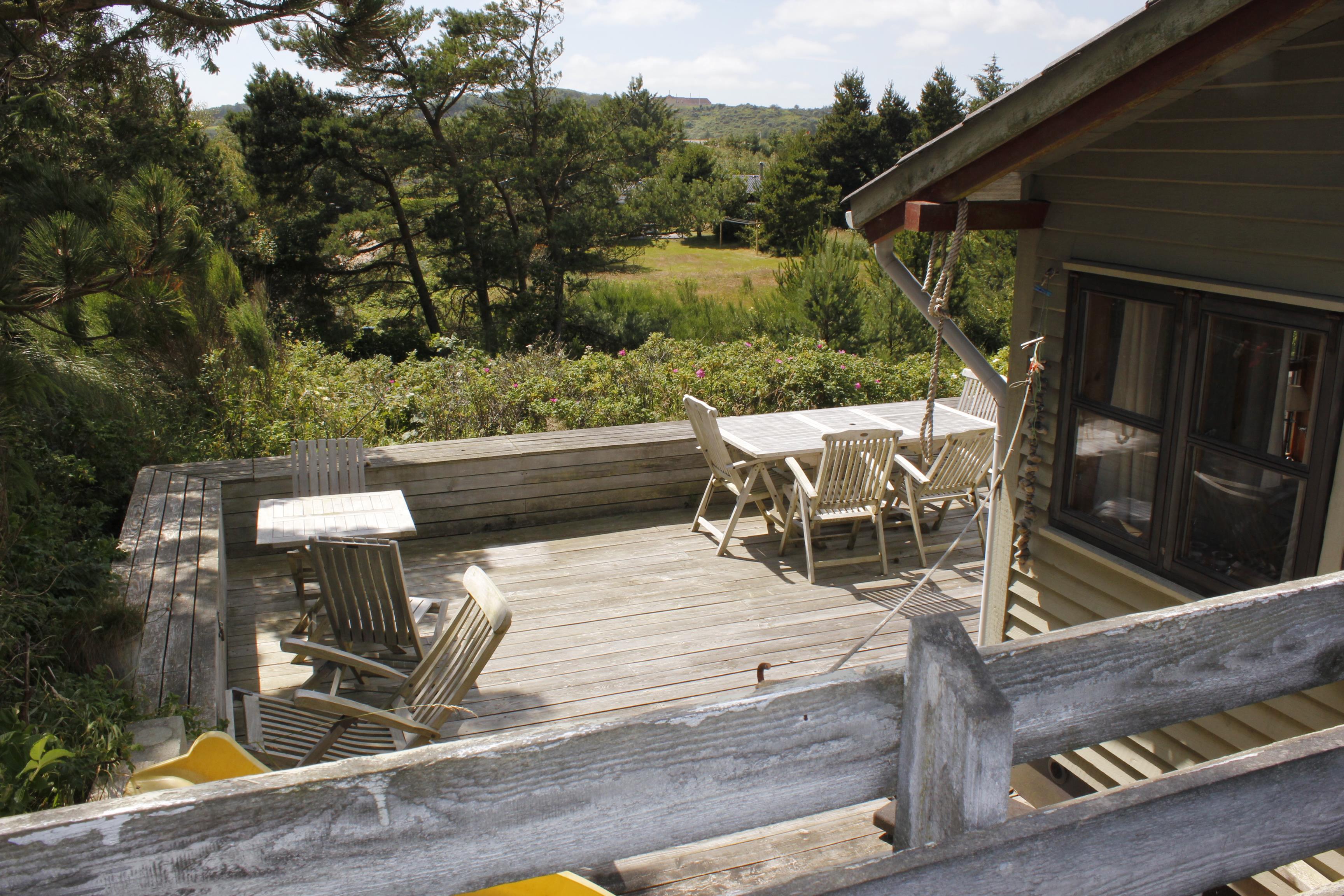 This holiday cottage is located in Slettestrand, which has a wonderful beach and a really beautiful forest to offer. The house is placed in a holiday cottage area with lyme grass, heather, moss and trees everywhere. Hvolby is the name of this lovely house, where you walk upwards a dune to get too. Here you step into the first terrace of the house, from where you have the view to the dunes that the ocean is behind. On this terrace it is convenient to enjoy the sunrise with a cup of coffee. The other and large terrace is placed with the view to fine Sandbjerggård, which is a lovely old hotel. This terrace is super to be at, because there both are space for the children to play at the slide, you can sunbath, you can enjoy the nature, and you can have a barbeque party with the whole family. At these terraces there are two fantastic sounds that you will hear constantly: Twittering from the birds and foaming from the ocean – lovely sounds, that helps you to find new energy into mind and body.