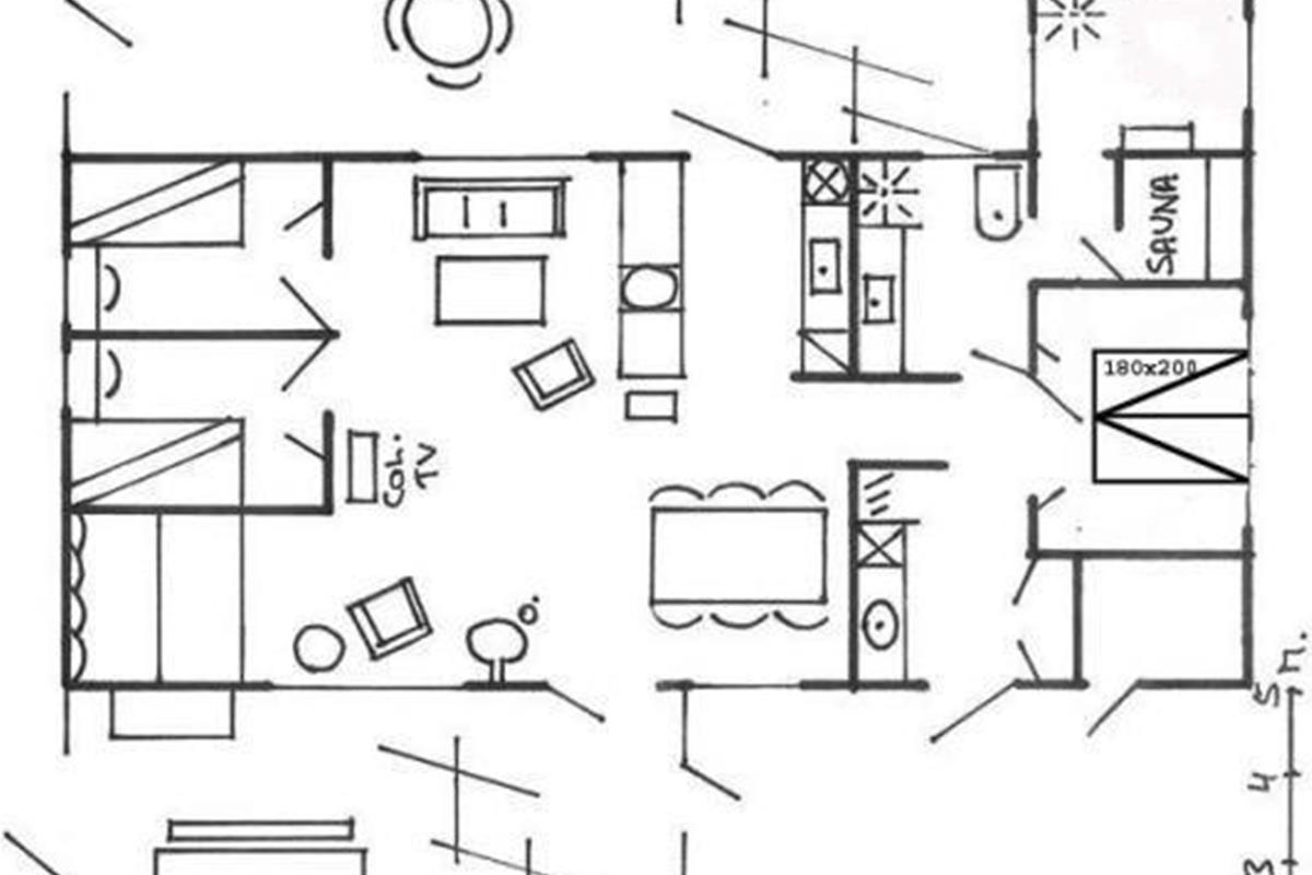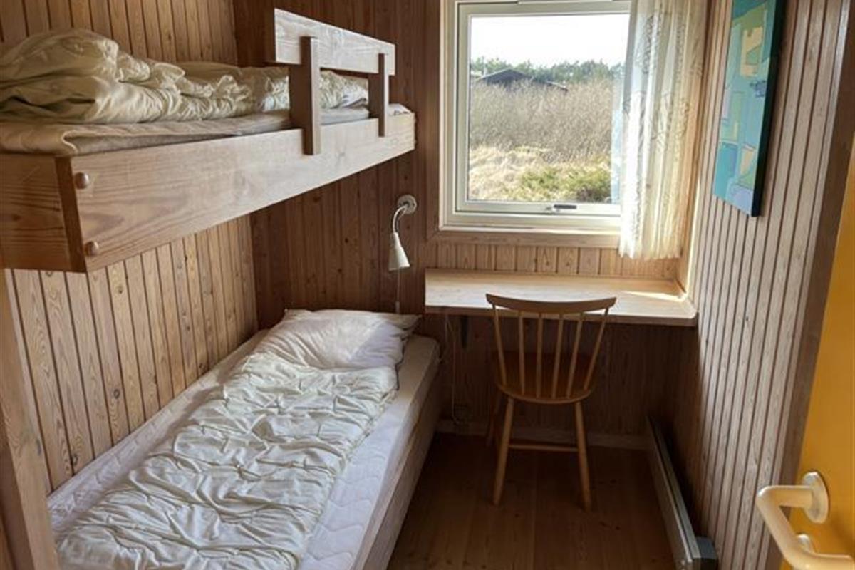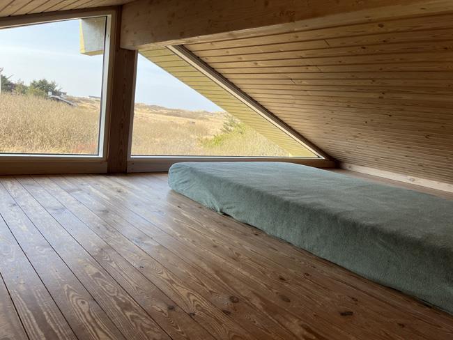 Husets indre består af nogle dejlige lyse rum, hvor af de fleste rum går op i kip. Huset har tre soveværelser, det ene med to enkeltsenge og de to andre med en køjeseng hver samt skrivebord. Huset har badeværelse med tilknyttet sauna.