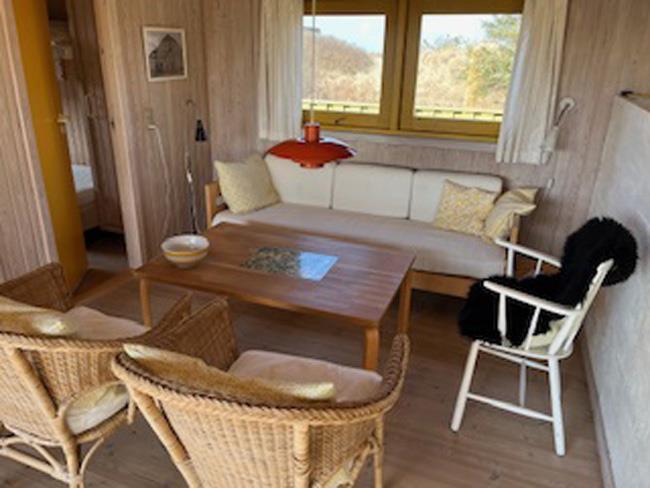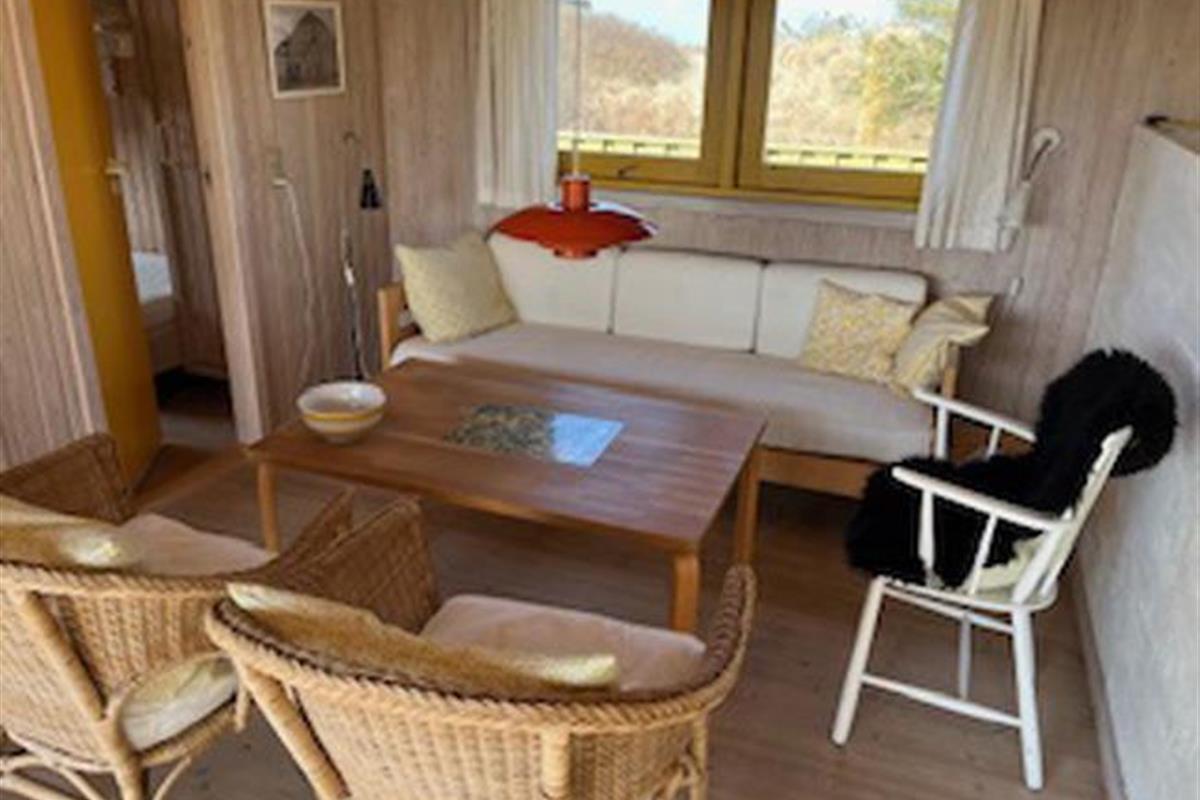 Omgivet af lyng, marehalm og fuglekvidder ligger dette skønne vaskeægte sommerhus. Huset ligger i et dejligt sommerhusområde med både skov og strand tæt på. Huset har nogle store dejlige terrasser, på tre sider af huset, så man kan nyde solens stråler dagen lang. Disse terrasser inviterer til en masse hyggelige timer med familien til grillmad eller en afslappende dag med en god bog. Terrassen ud mod vandet er skøn med sin udsigt over klitterne og havudsigt.