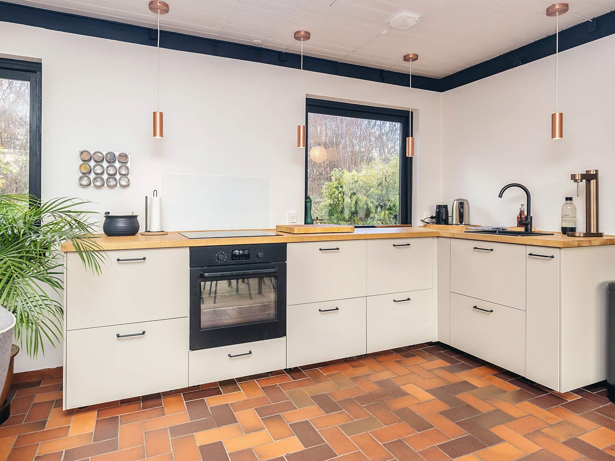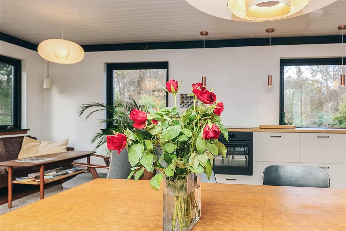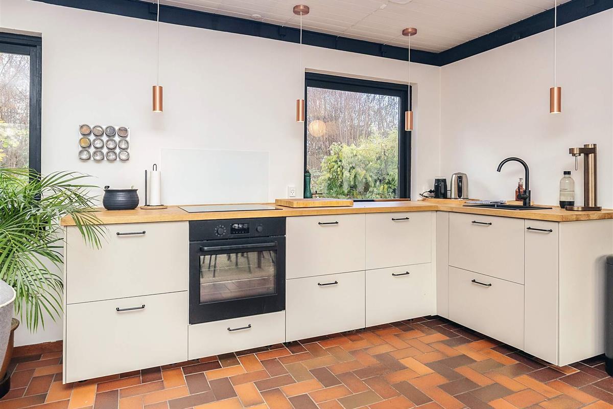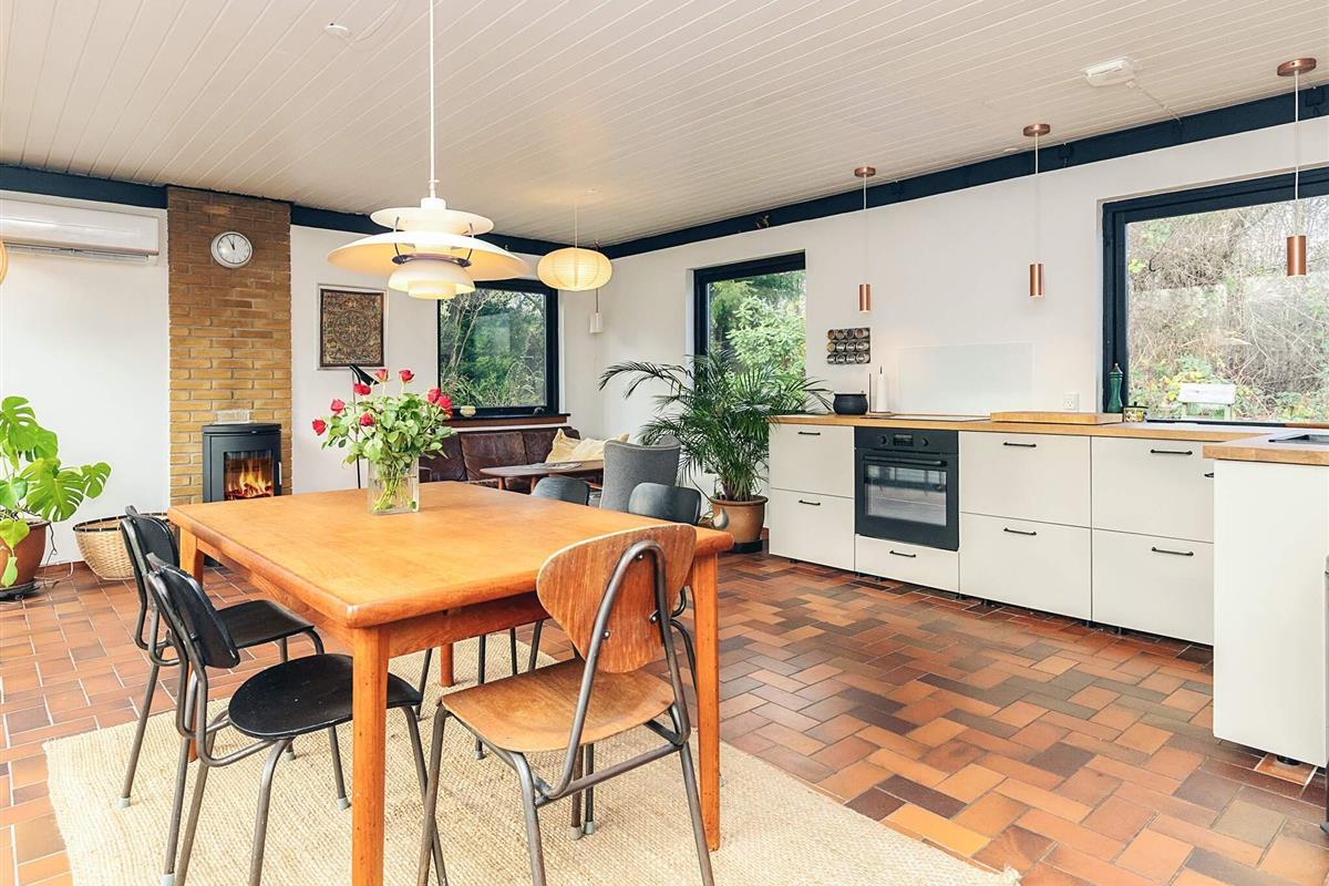 Ferienhaus in der Nähe von Smidstrup Strand, mit großer, schöner Terrassenfläche auf dem Grundstück. Innen gemütlicher Küchen-/Wohnbereich für das Familienleben mit klimafreundlicher Luft-Luft-Wärmepumpe, Holzofen und doppelter Schlafcouch. Zur Küchenausstattung gehören auch Cerankochfeld und Geschirrspüler.