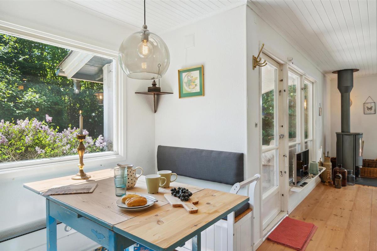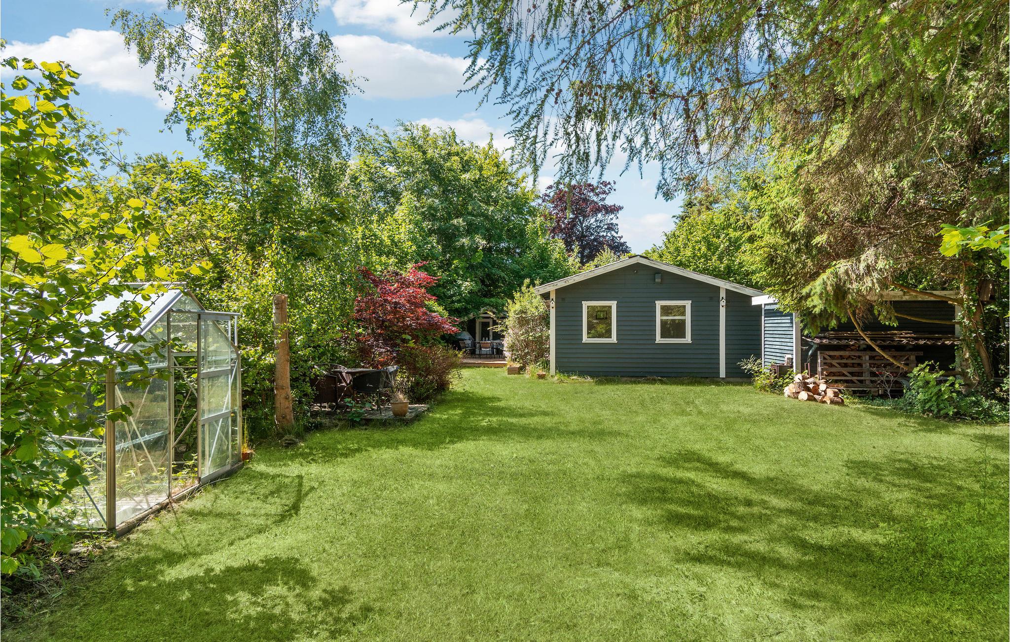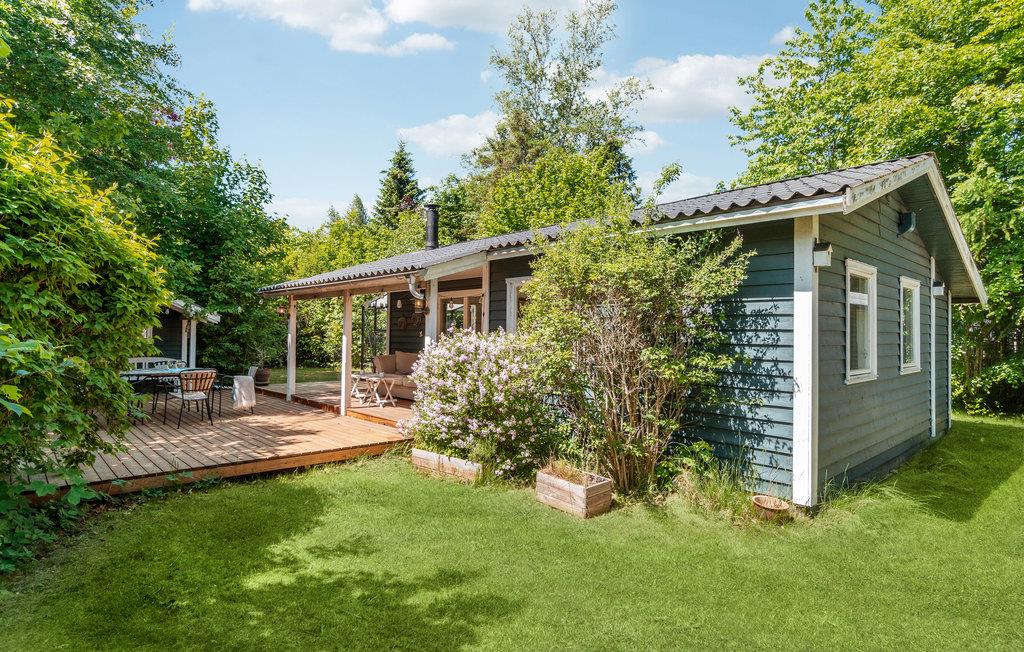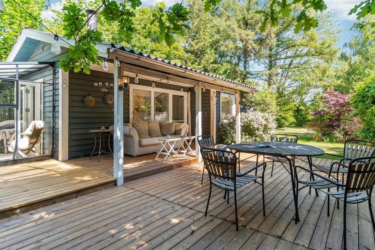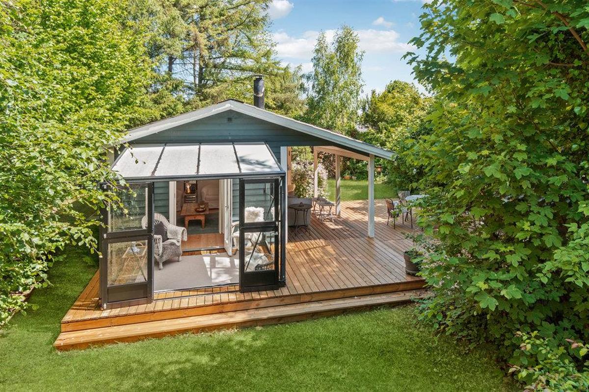 Gezellig houten vakantiehuis nabij Smidstrup Strand met terras, serre en open haard voor een ontspannen verblijf.