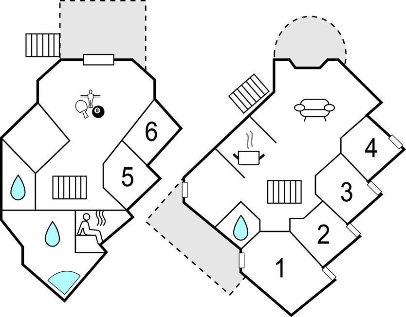 In de woonkamer is een schuine trap naar de benedenverdieping. Hier vindt u een mooie woonkamer waar u met de familie kunt biljarten. Er zijn twee goede badkamers, waarvan één met spa en sauna. Vanuit de sauna op de begane grond loopt u direct de zee in. Rondom het vakantiehuis zijn er diverse mogelijkheden om te zitten en te genieten van de zon of beschutting te vinden tegen de wind.
