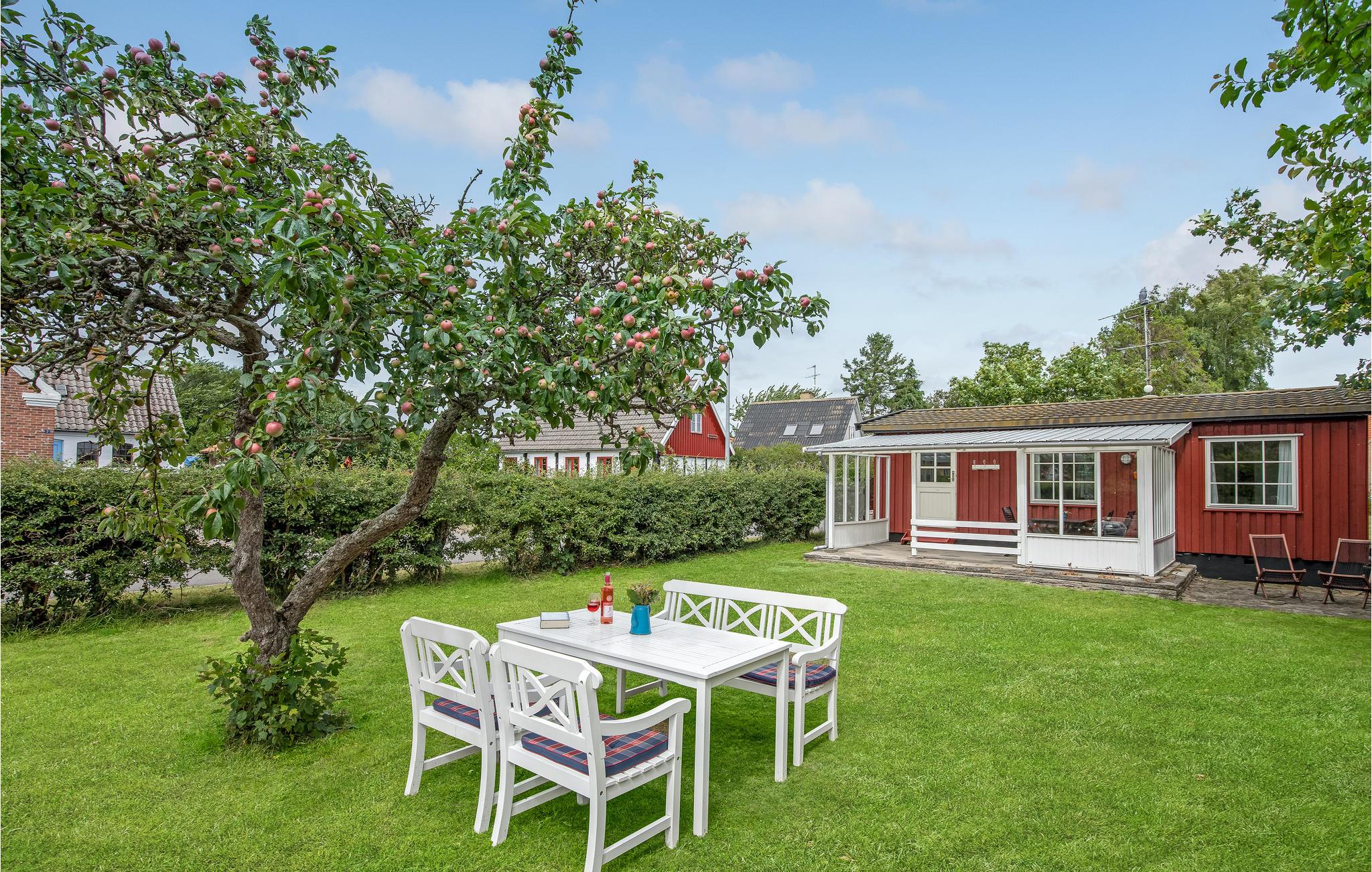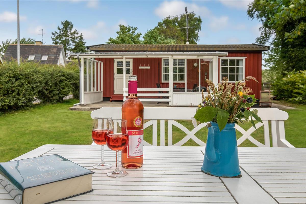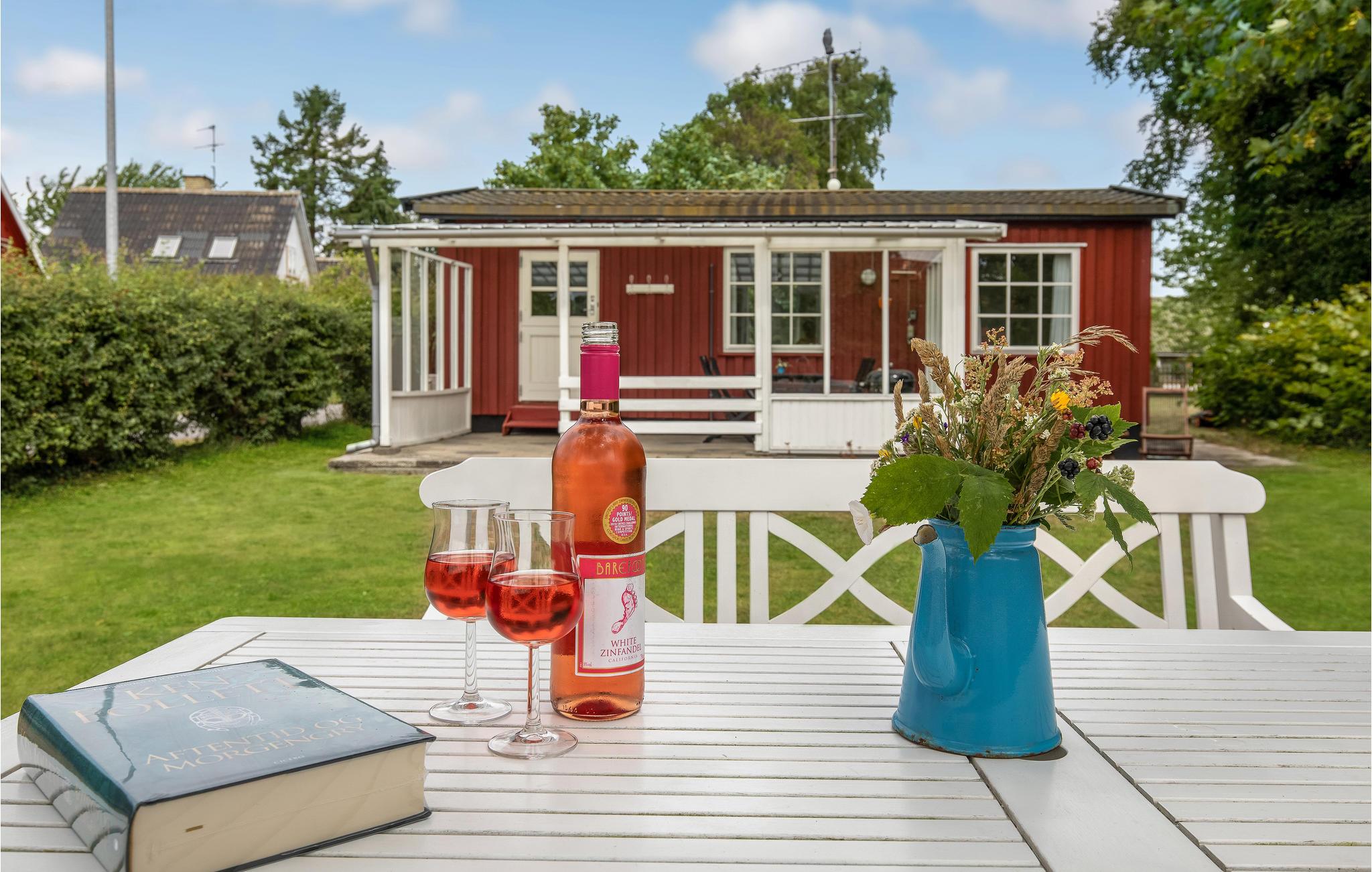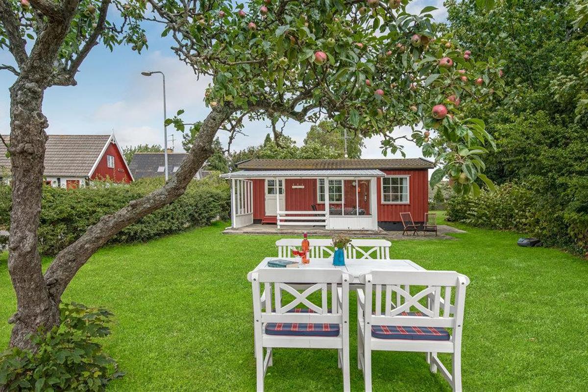 Charmant houten vakantiehuis in het centrum van Snogebæk, dichtbij strand en winkels, met overdekt terras en kindvriendelijke tuin.