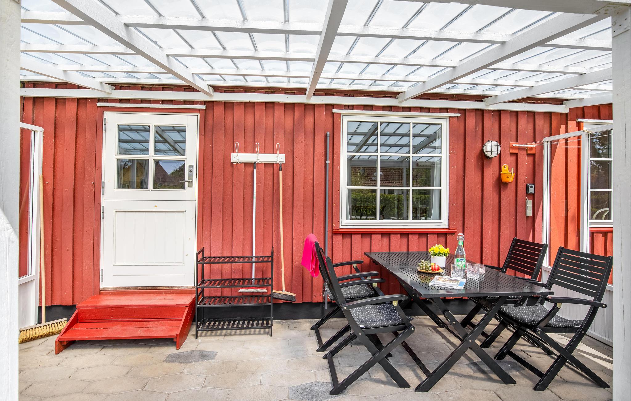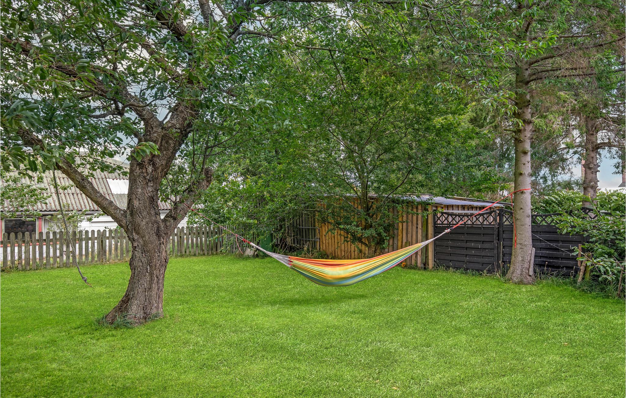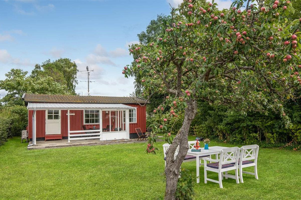 Charmant houten vakantiehuis in het centrum van Snogebæk, dichtbij strand en winkels, met overdekt terras en kindvriendelijke tuin.