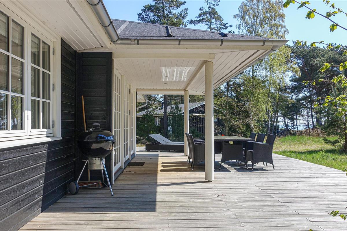 Bij mooi weer ligt het voor de hand om het vakantiegezelschap te verplaatsen naar het houten terras met loungemeubilair en barbecue. Op een zwoele herfstdag is het een heerlijk idee om te gaan zitten met een boek en een deken of gewoon te genieten van het uitzicht op de golven en de kleuren van de natuur. De kinderen kunnen zich vermaken op de schommel of torens bouwen in de zandbak.