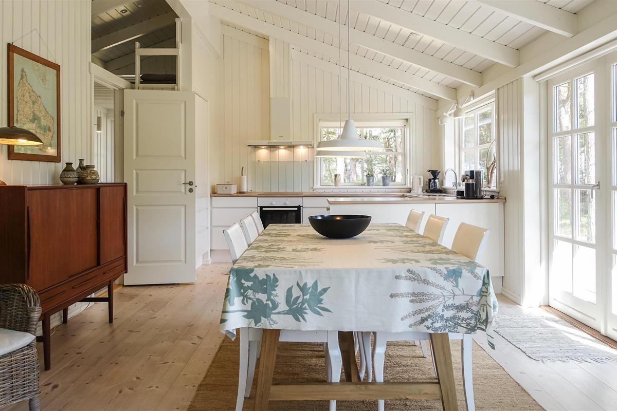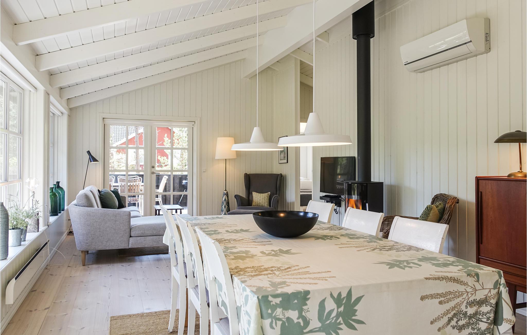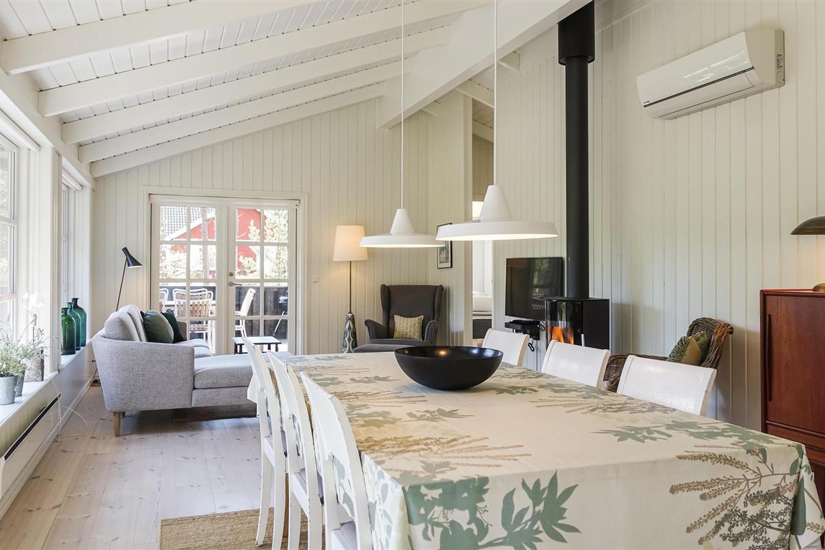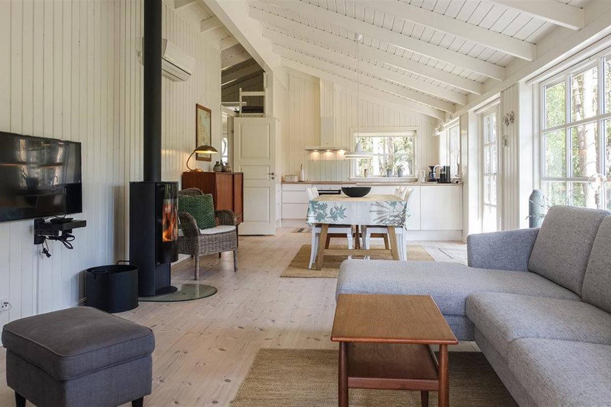 Het huis heeft geschilderde muren en plafonds, houten vloeren met extra brede vloerdelen en is ruimtelijk open tot aan de gevel, waardoor een ruime, huiselijke en lichte sfeer ontstaat. Of het nu gaat om binnenpret of zon in de tuin, u zult hier heerlijke vakanties beleven. In de woonkamer kunt u op kille dagen de houtkachel opstoken en lekker koken in de keuken, terwijl de kinderen gezellig op de zachte kussens in de woonkamer kruipen.