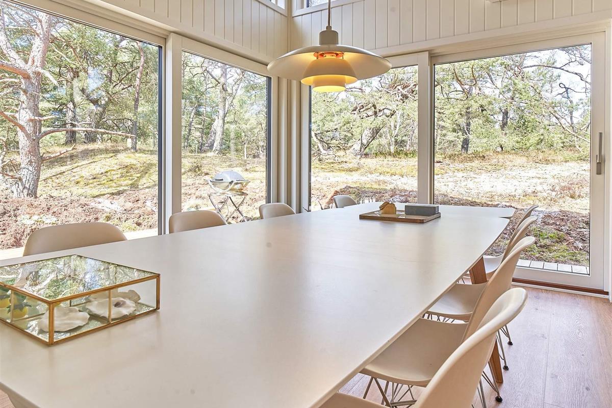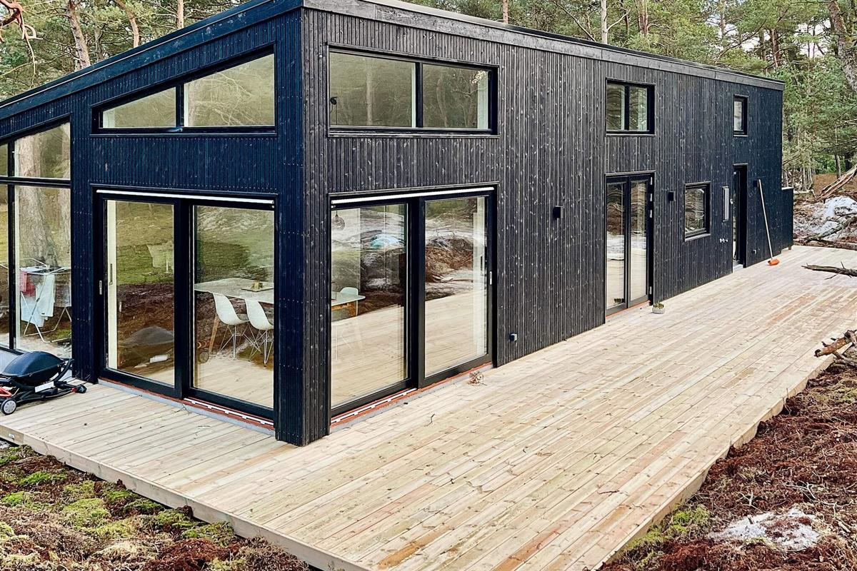 Der ganz moderne Baustil des Hauses bietet zahlreiche Fensterflächen mit Blick in die reizvolle Natur ringsum und schönen Ausblick von fast allen Zimmern. Das Wohnambiente ist besonders hell und freundlich. Draußen auf dem hügeligen Naturgrundstück steht eine große Holzterrasse zur Verfügung.