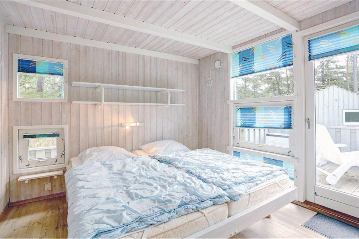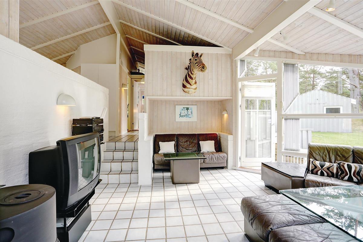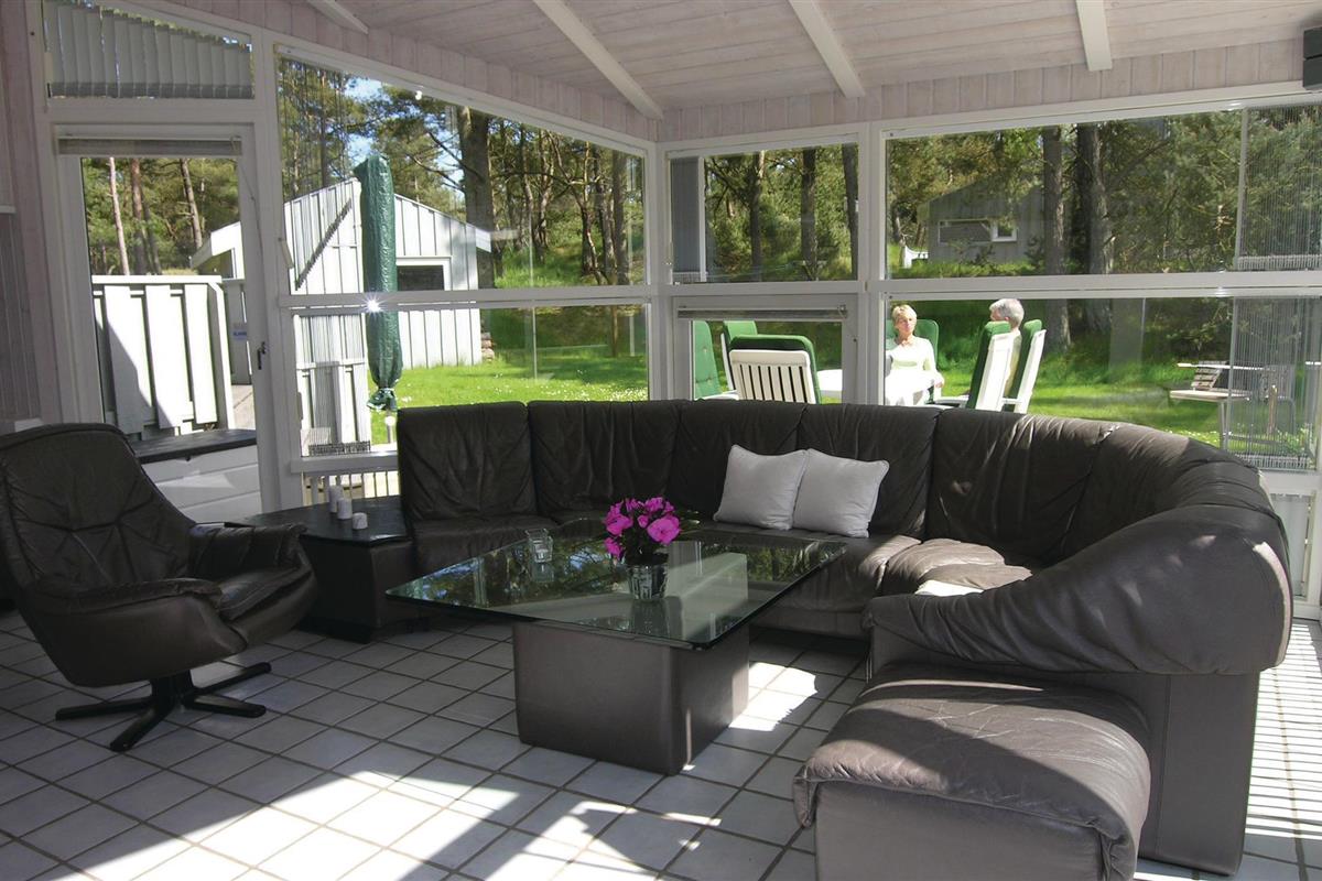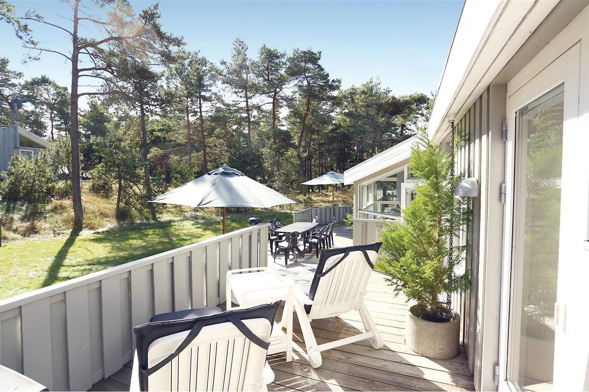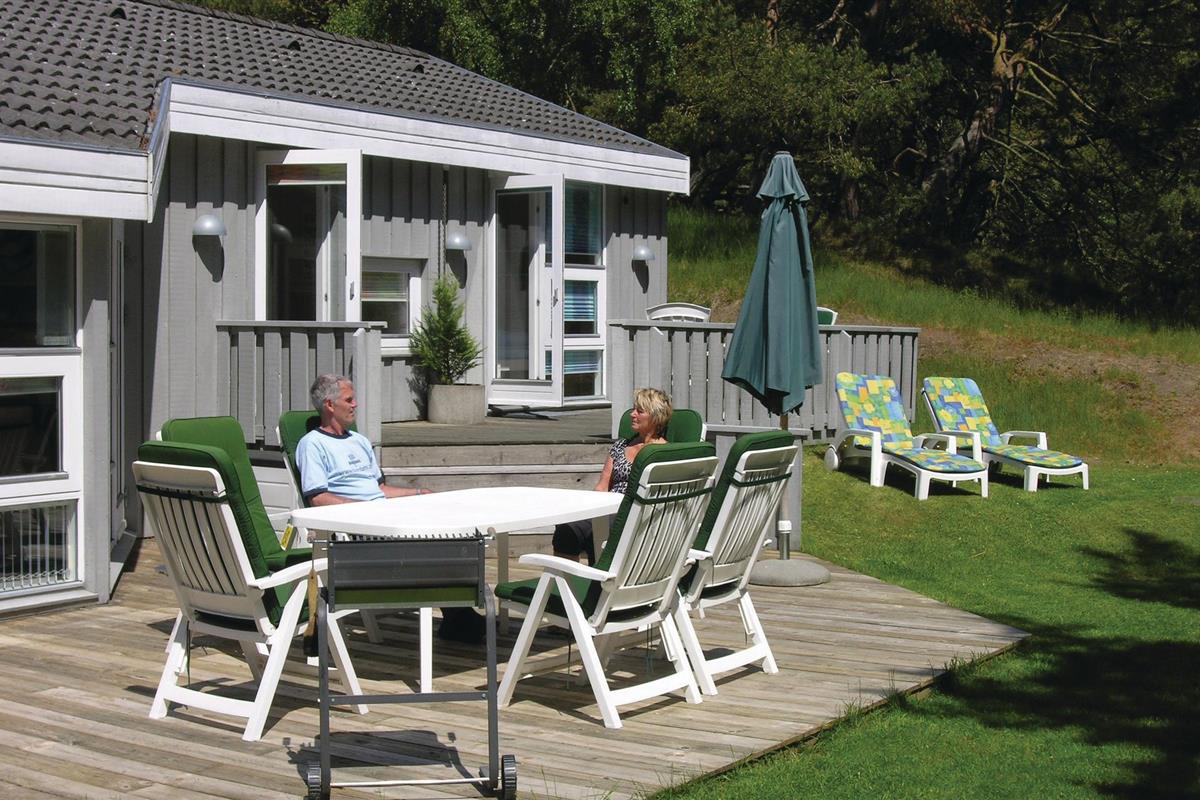 Omgeven door heuvels met dennenbossen ligt dit mooie houten vakantiehuis midden in de rustige en prachtige natuur. Het huis is omgeven door beschutte houten terrassen waar u de hele dag kunt genieten van de zon en de omgeving. U kunt natuurlijk kiezen voor het heerlijke Dueodde strand of de uitdagingen van de nabijgelegen golfbaan. Het huis is smaakvol ingericht met lichte kleuren en modern meubilair. Er zijn verwarmde klinkervloeren in de lounges en in de badkamers en keuken. De mooie en goed uitgeruste keuken staat in open verbinding met de gespreide woonkamer, die is ingericht met lederen meubilair. De grote van de twee badkamers heeft een vier-persoons jacuzzi en een goede sauna.
