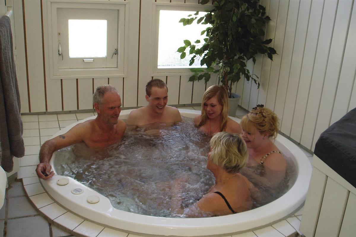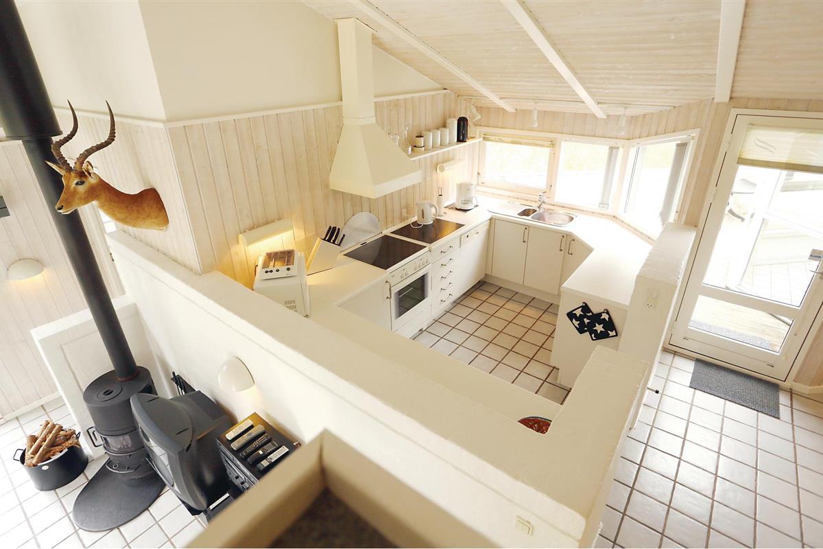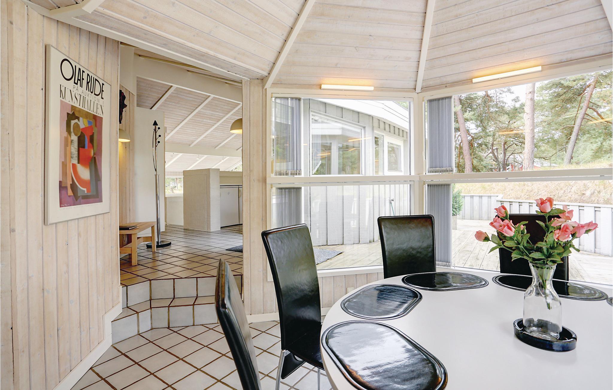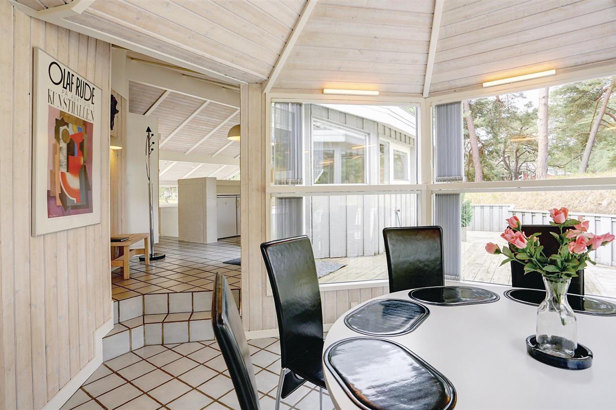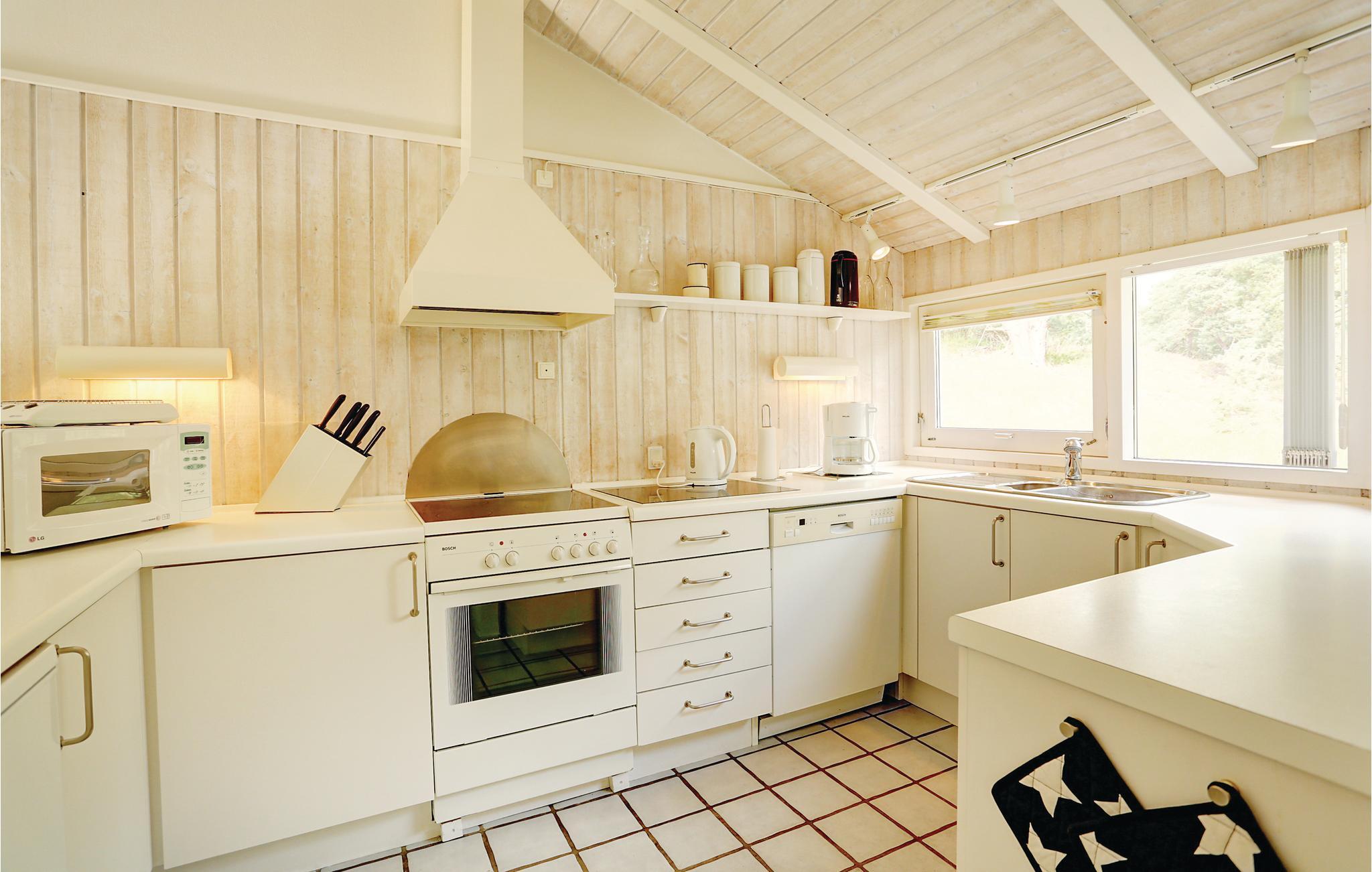 Omgeven door heuvels met dennenbossen ligt dit mooie houten vakantiehuis midden in de rustige en prachtige natuur. Het huis is omgeven door beschutte houten terrassen waar u de hele dag kunt genieten van de zon en de omgeving. U kunt natuurlijk kiezen voor het heerlijke Dueodde strand of de uitdagingen van de nabijgelegen golfbaan. Het huis is smaakvol ingericht met lichte kleuren en modern meubilair. Er zijn verwarmde klinkervloeren in de lounges en in de badkamers en keuken. De mooie en goed uitgeruste keuken staat in open verbinding met de gespreide woonkamer, die is ingericht met lederen meubilair. De grote van de twee badkamers heeft een vier-persoons jacuzzi en een goede sauna.