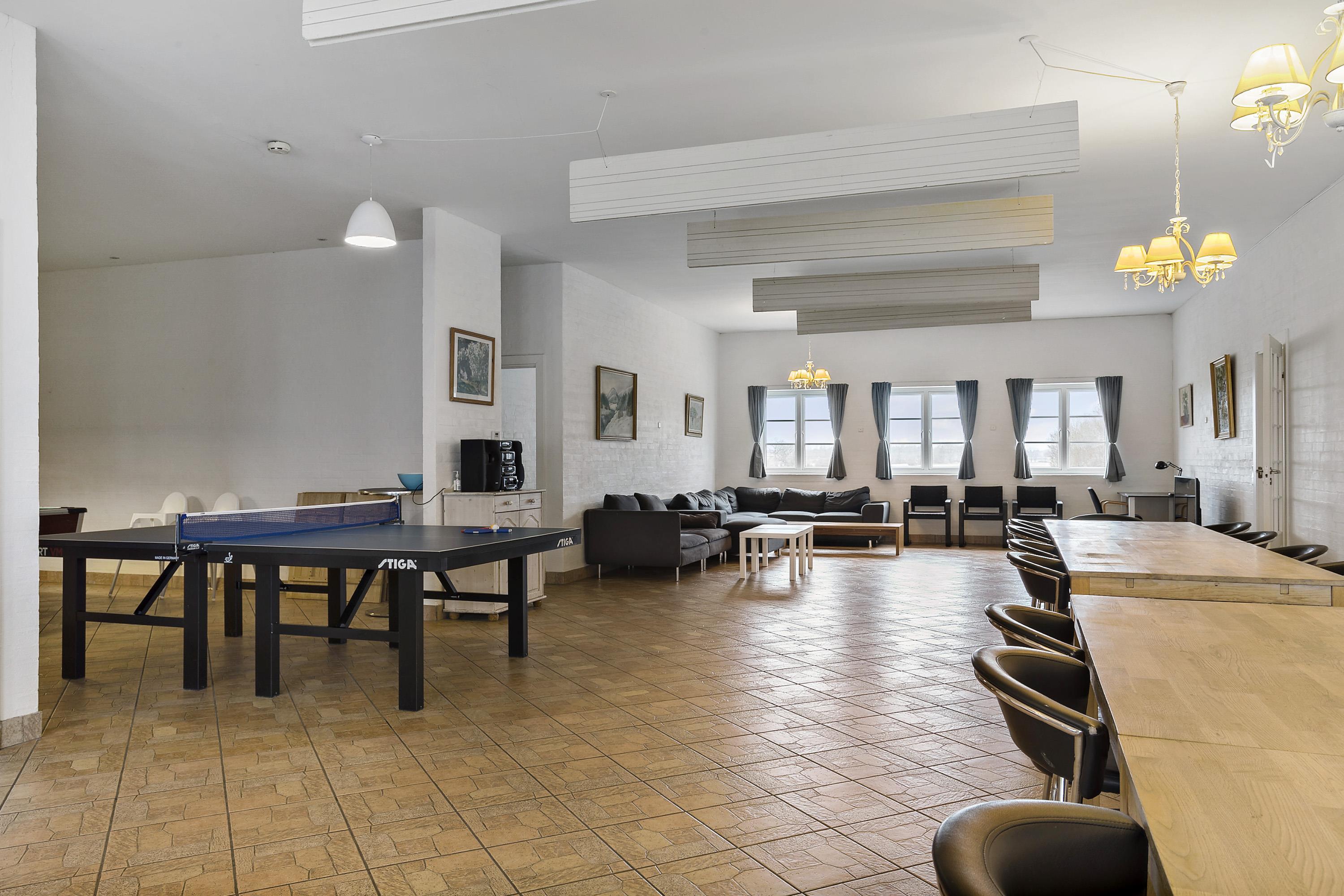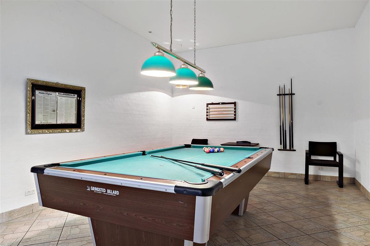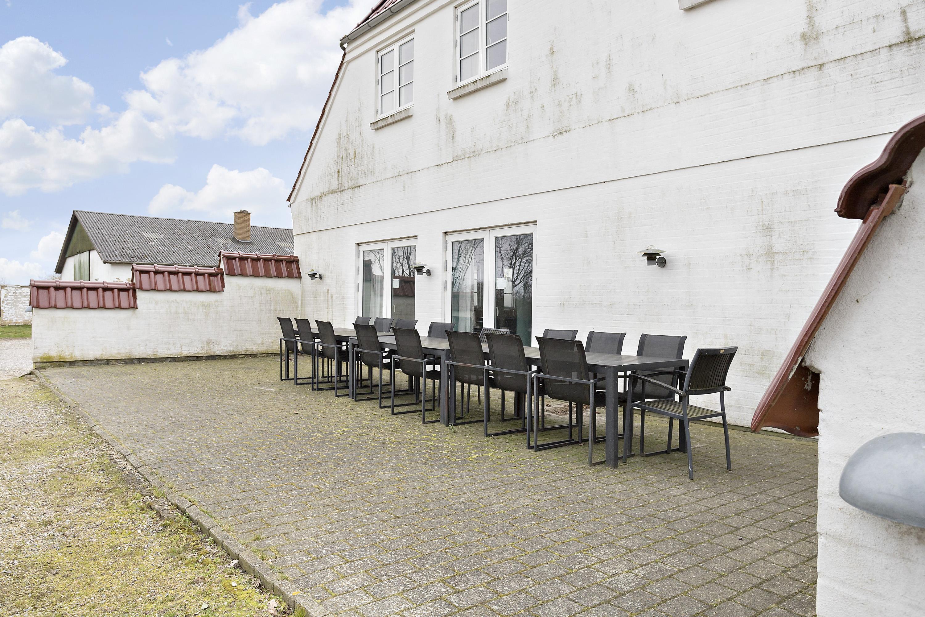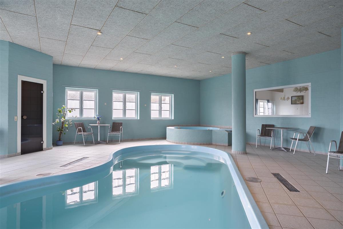Authentic country estate of 750 m2 situated in the small village of Farris near Kolding. This holiday home accommodates 22 people with its 11 spacious bedrooms, each of which includes a bathroom and a toilet. Two of the bedrooms are located on the ground floor and the rest you will find on the first floor. The spacious and beautiful wellness room of 100 m2 calls for total relaxation and soul care. It features a 28m2 swimming pool, an 8-person hot tub, a sauna, and two bathrooms. The living room is furnished with a large sofa arrangement and dining tables, as well as a pool table and table tennis, allowing everyone to dine and socialize together. From the living room, there is a window with a view into the wellness room. Immediately adjacent to the living room is the large kitchen with plenty of space for culinary activities. On the first floor, there is an additional TV room and a lounge.