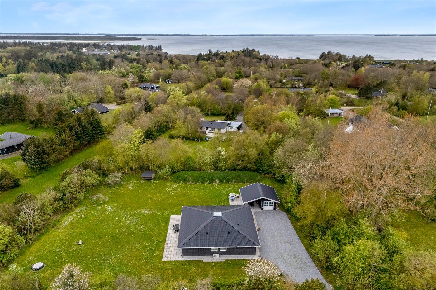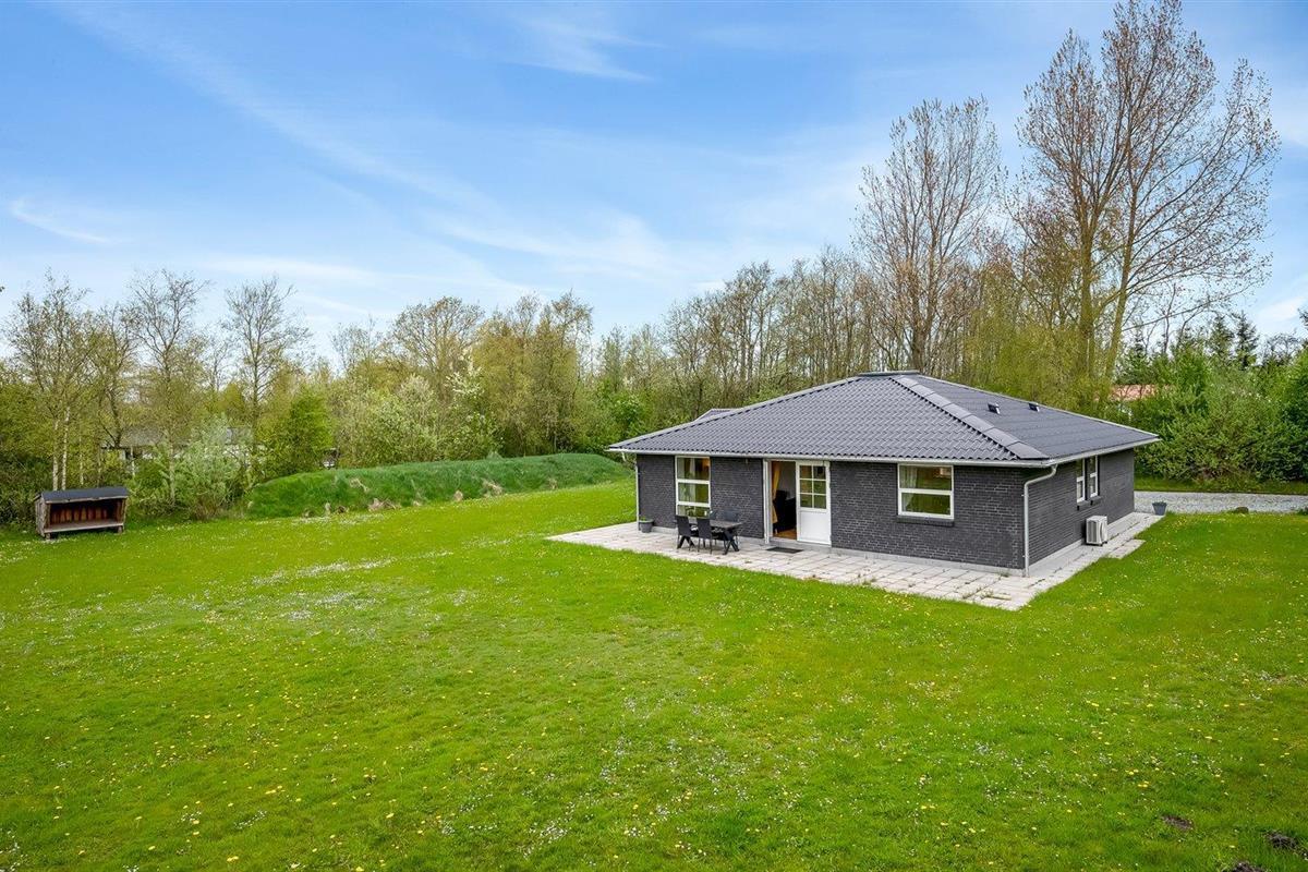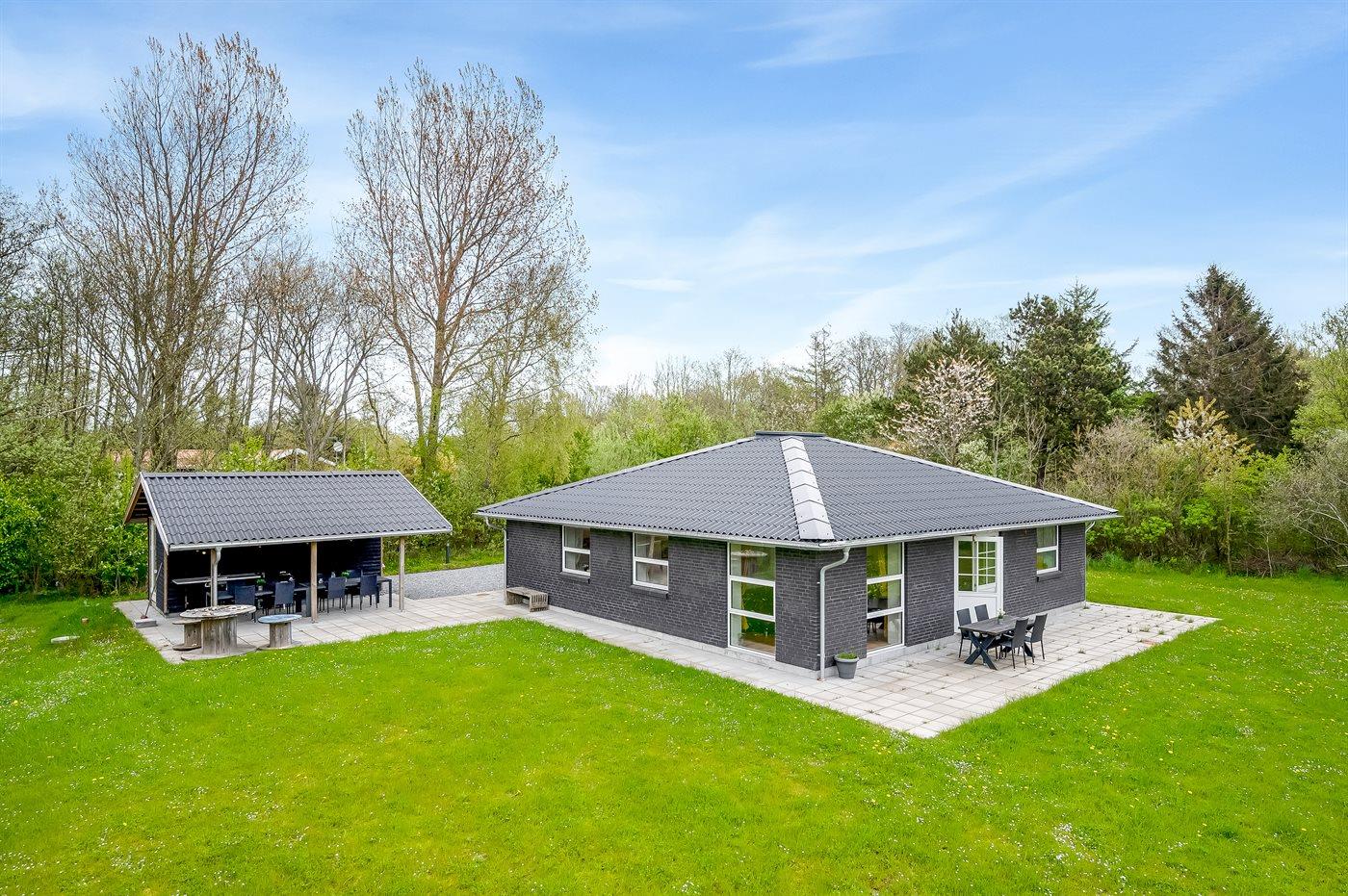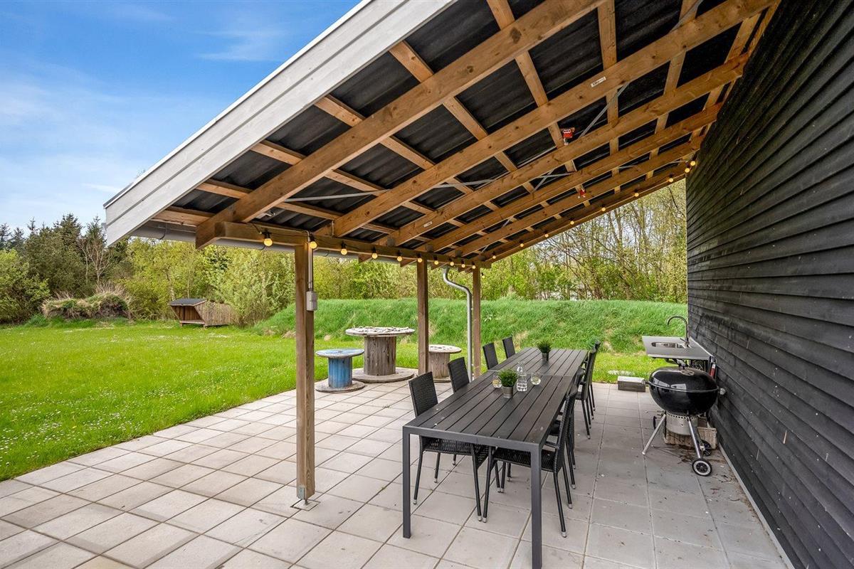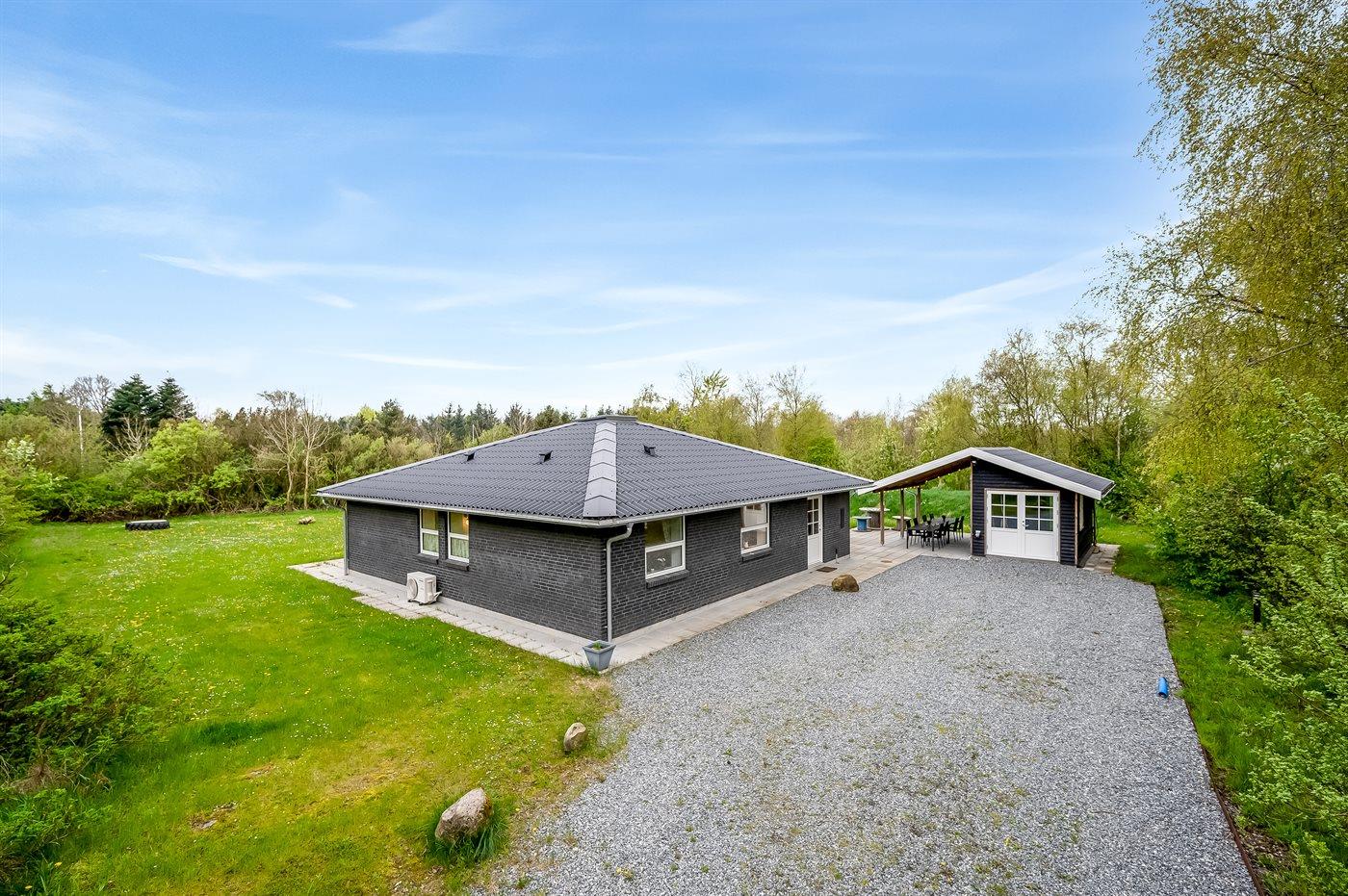 Ruim en modern vakantiehuis in Spøttrup, dicht bij fjord, met buitenkeuken en laadpaal voor elektrische auto.