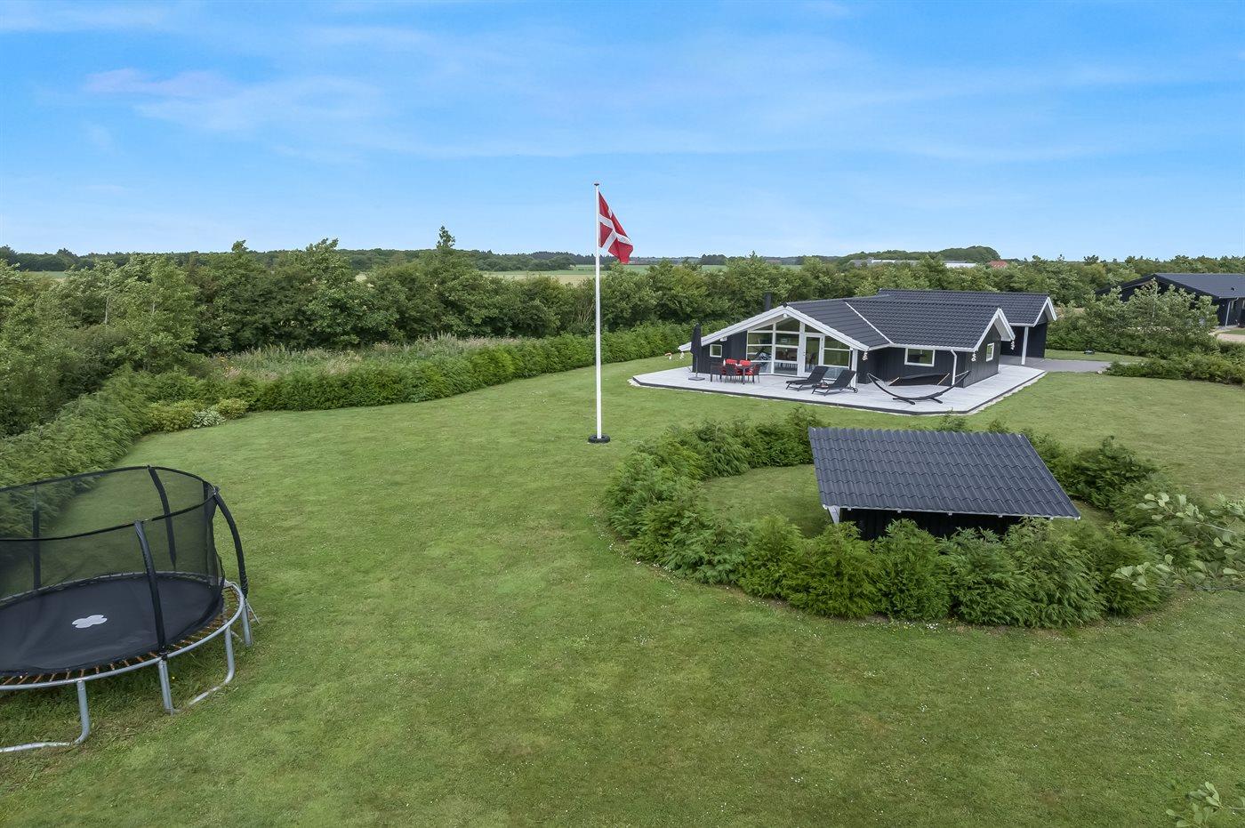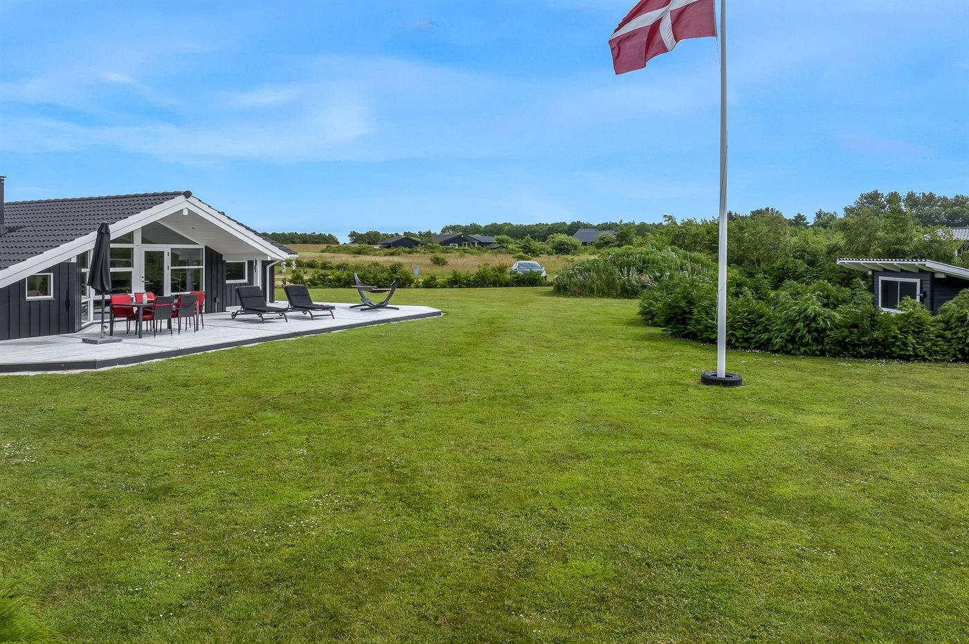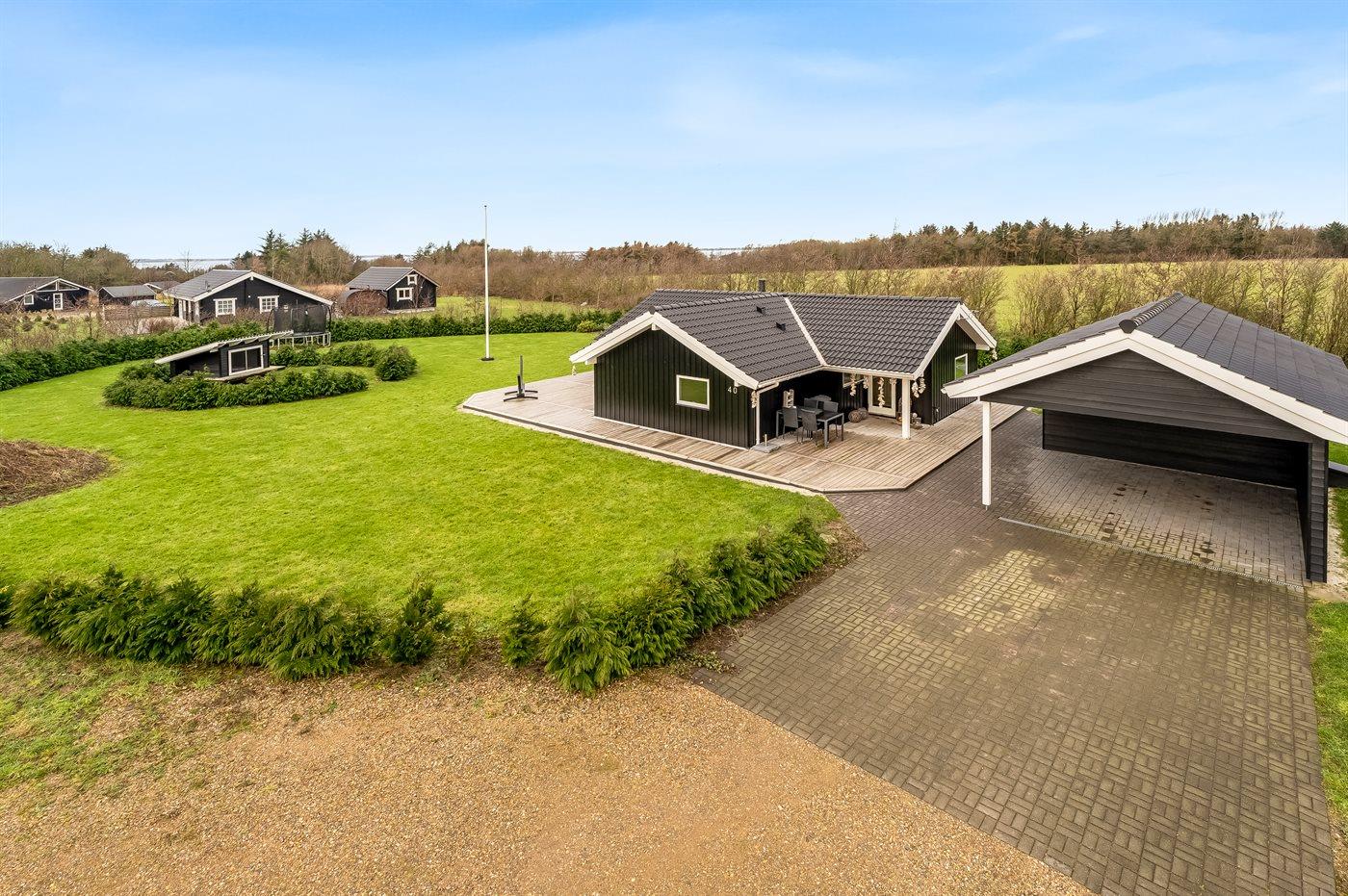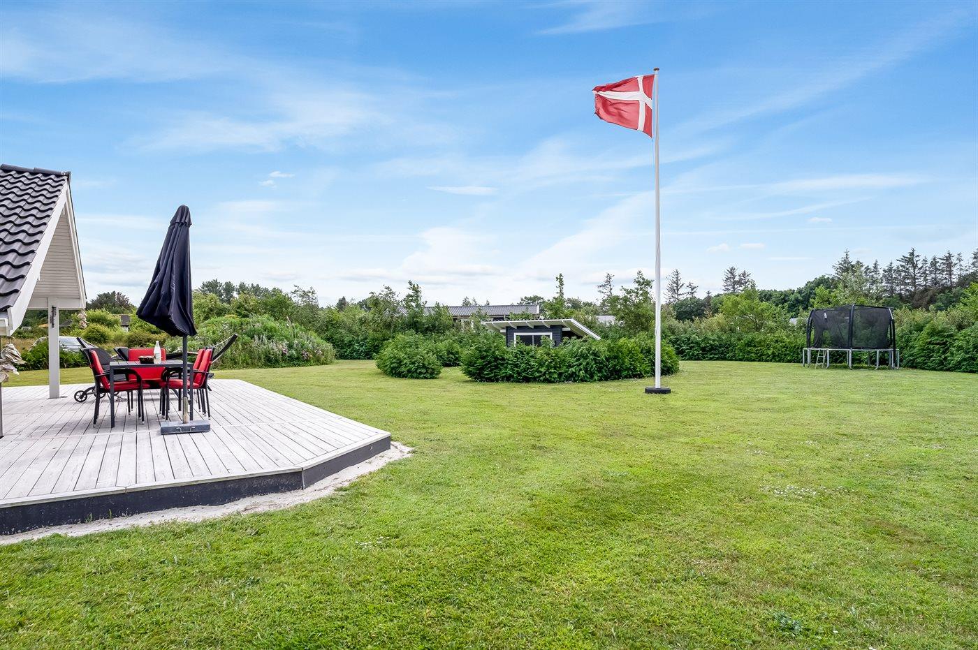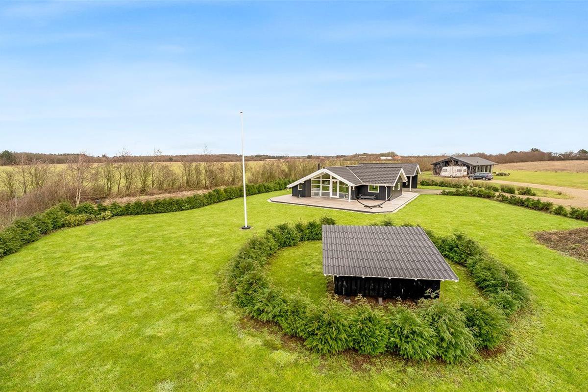 De vakantiewoning is gelegen op een 2606 m² groot aangelegde tuin. Afstand tot de fjord 500 m. Dichtstbijzijnde winkel 3800 m. Bij de vakantiewoning hoort terras. Daarnaast is er een overdekt terras. Gereedschapsruimte. Trampoline.Vuurplaats. Barbecue.Garage ter beschikking. Parkeerplaats bij het huis.